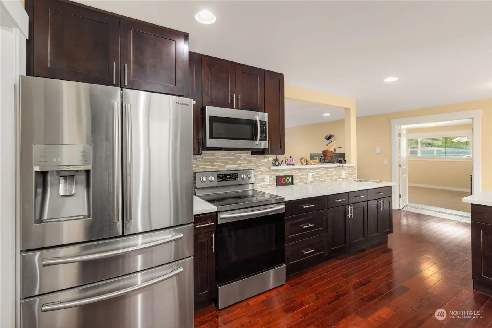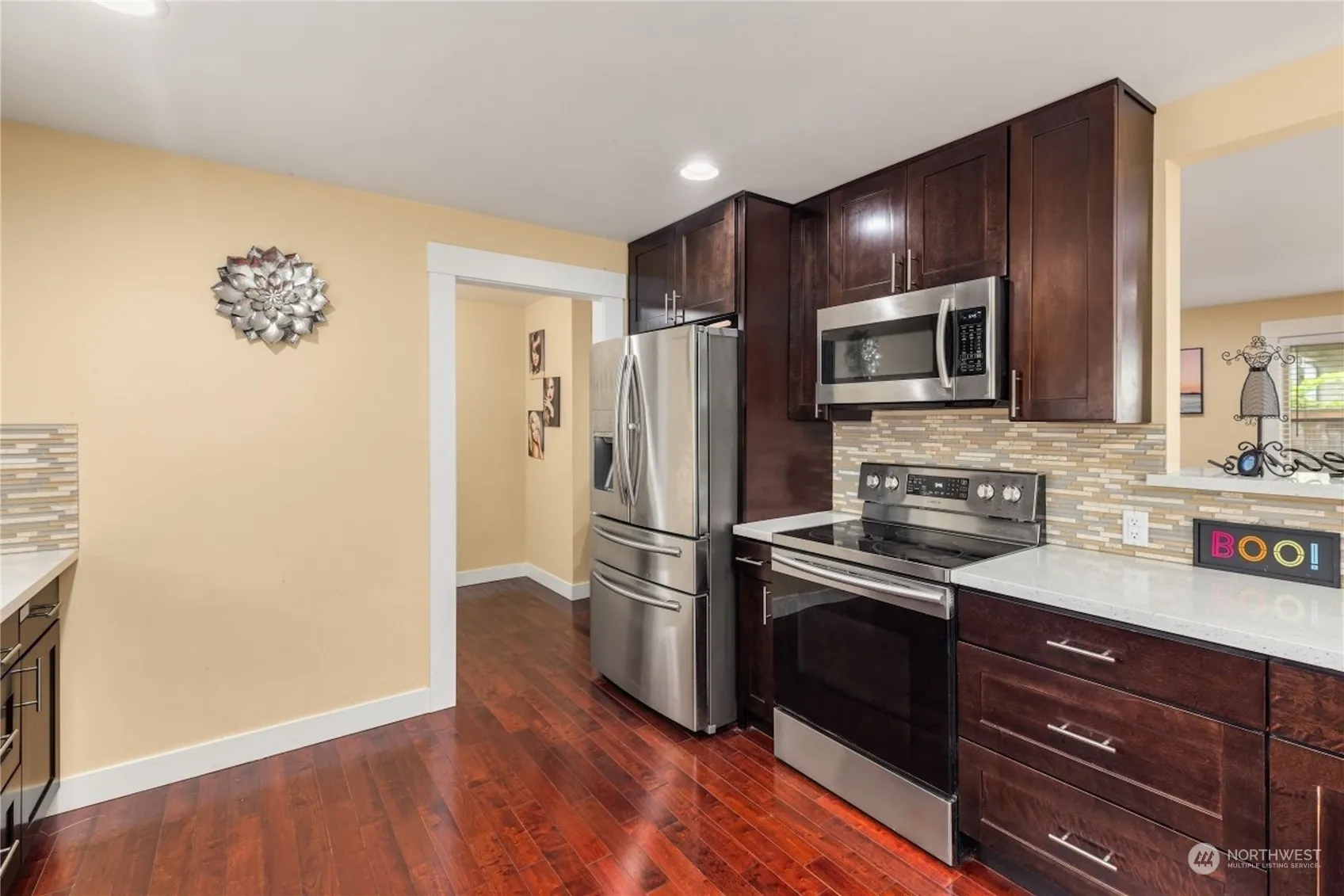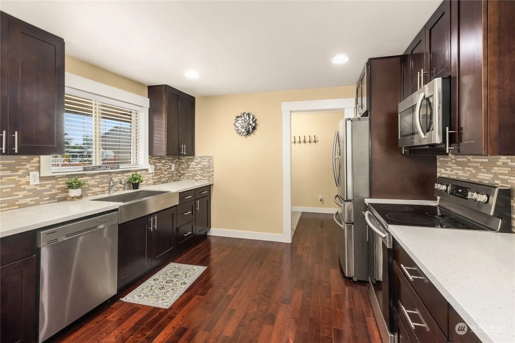 Beautifully renovated 1-story gem boasts 4 bedrooms + 2.75 baths, perfect for multi-generational living. Step inside to an open floor plan w/genuine hardwood floors, modern tiles, quartz countertops, smart lock entry, wood-wrapped double pane windows. The heart of the home, a stunning kitchen, features a 36″ farmhouse undermount sink, SS appliances + a built-in microwave. Relax in the living room, filled in natural light from large windows. The primary suite has a 3/4 baths. Garden space+ plenty of parking spots available. Located in a prime area, a short walk from public transportation, Safeway, Crestview Park. SeaTac Airport, Westfield Mall, and I-5/405 freeways are a quick drive away. The fridge, washer & dryer are staying! NO HOA!