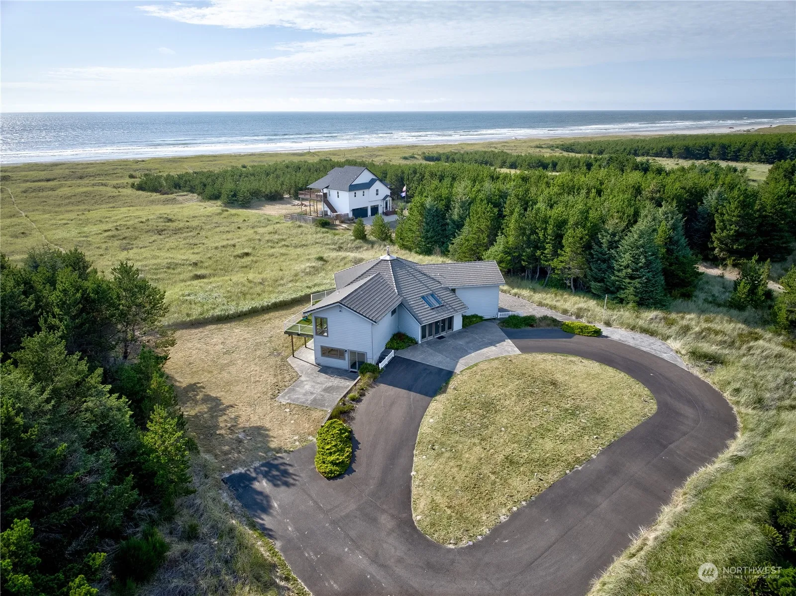 Magnificent estate sized mean high tide with 150 ft of frontage. A forever home with age in place amenities. Seller has replaced all exterior siding, some flooring & windows, propane stove, and more. This amazing floor plan offers large open concepts, privacy in separated bedrooms, baths, and 2 huge gathering rooms, one on each floor. Chair lifts make for ease of mobility throughout. Fully paved circular driveway, decks & patios make for magical sunsets for you and everyone you invite. Large kitchen with loads of storage, views of the ocean and the Mack brother built, two story vaulted entry filled with light by french doors and floor to ceiling windows. This home is a one-of-a-kind masterpiece designed to capture the best in PNW living.