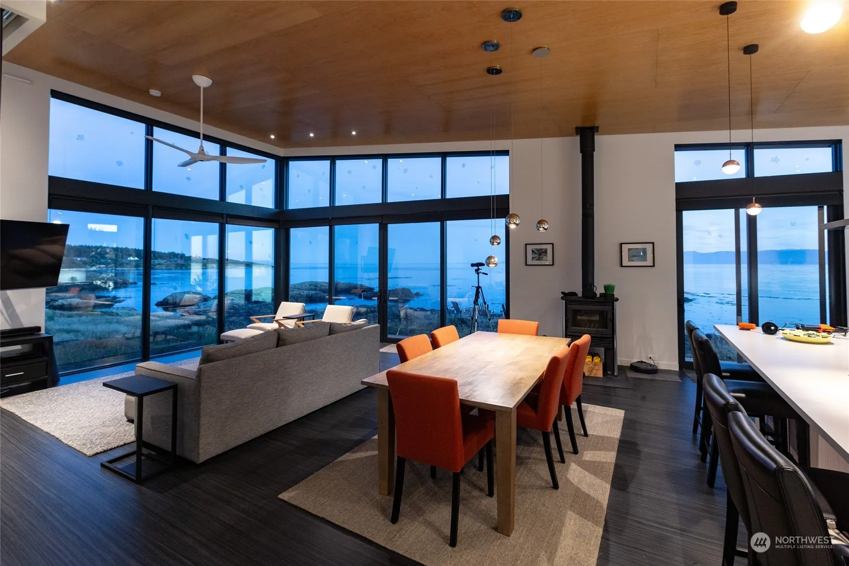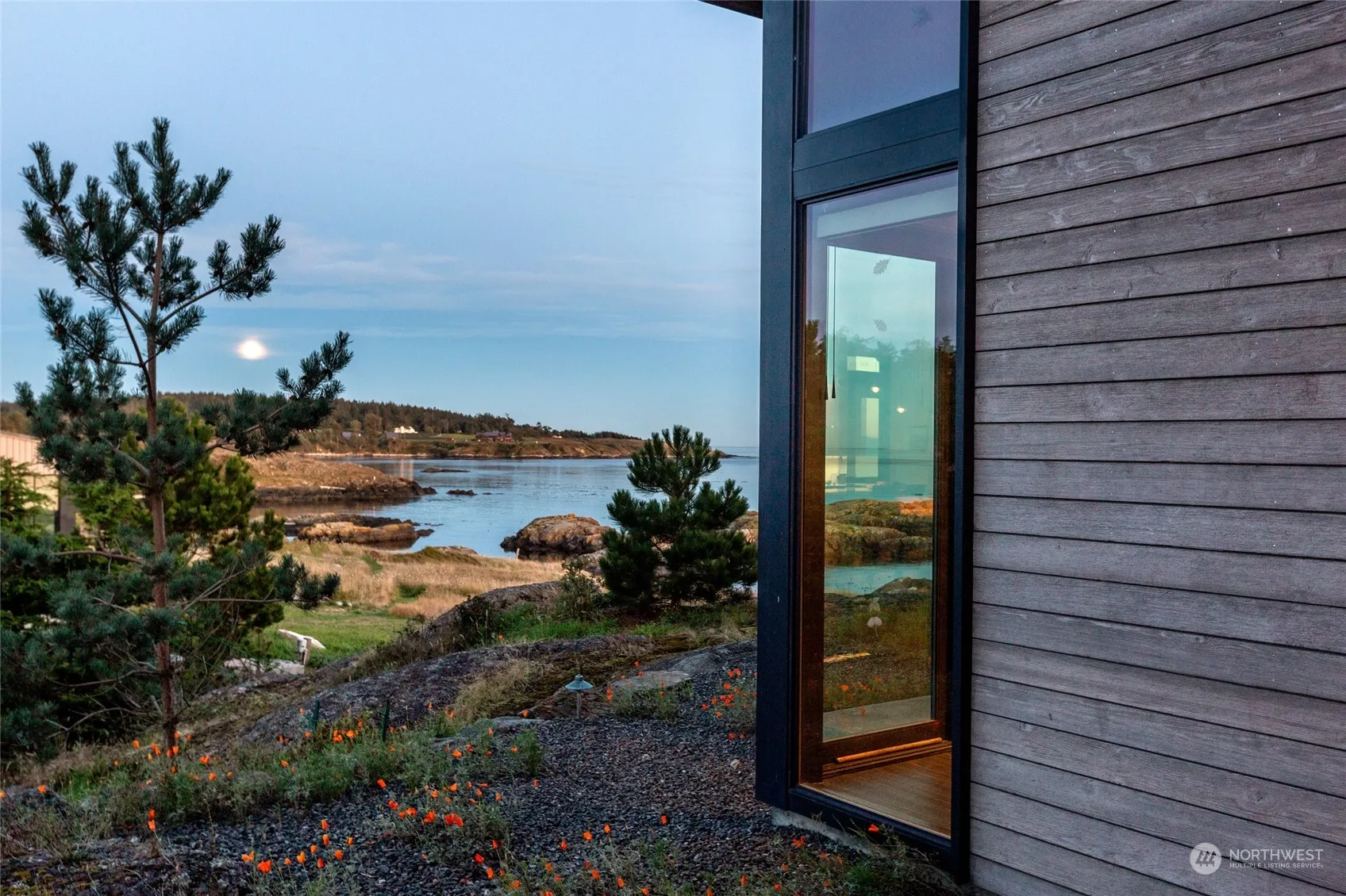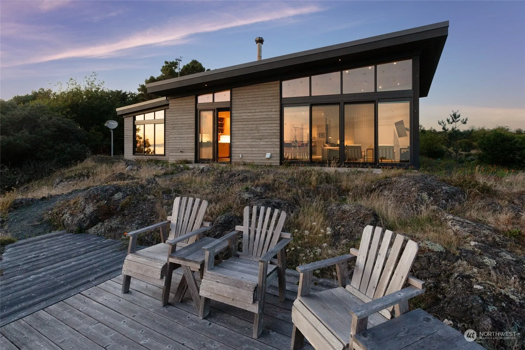 On the point … Waterfront home between Kanaka and Enterprise Bays with expansive southwest views of Haro Strait where it meets the Strait of Juan de Fuca, the Olympic Mountains and Mt. Rainer. Experience eagles soaring and whales passing by while you relax on the wood deck platform nestled on the picturesque shoreline. Single story contemporary home built in 2016 is move in ready with an open design offering floor to ceiling windows, den, 2 bedrooms, 2 bathrooms, large utility room and 2 car garage with EV Charger. Chef’s kitchen with large island including eating bar and quality SS appliances. Primary bedroom offers spectacular water view, en-suite bath and double closets. Easy access to Town of Friday Harbor with all the amenities.