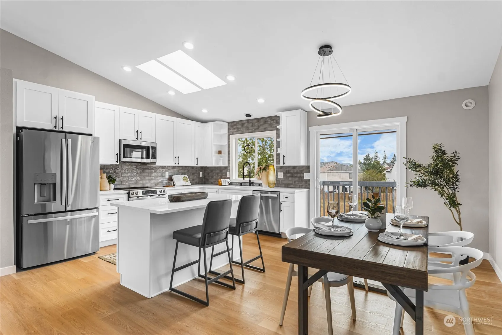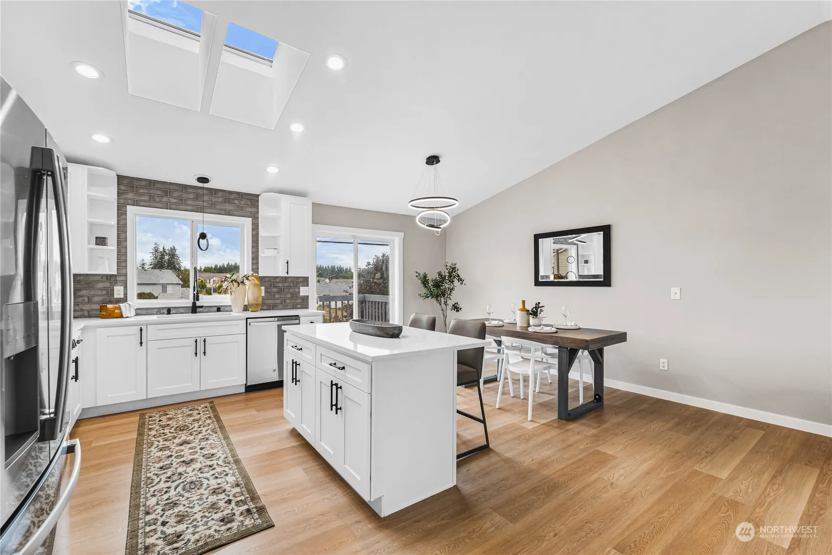 Welcome to your newly remodeled home in Yelm! This beautifully updated property features a modern kitchen with brand-new appliances and an island, perfect for cooking and entertaining. The dining area opens to a spacious back deck through a sliding door, offering an ideal spot for indoor-outdoor living. The living room is generously sized, and all bedrooms are conveniently located on the main level. Enjoy the comfort of new carpet and fully updated bathrooms. The lower level boasts a large family room or flexible space for a home office, along with a laundry room. A two-car garage provides ample storage, and the newer roof, adds peace of mind. Schedule a showing today and check it out!!
