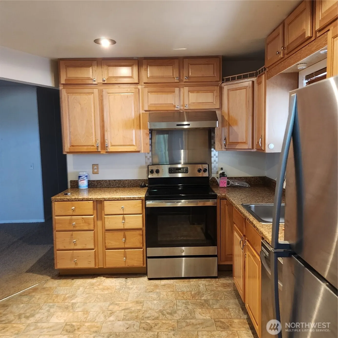 Great starter home in a great location on a large lot. Two blocks away from shopping. Minutes to freeways. New roof. New furnace. New appliances. Maple kitchen cabinets. Custom windows. Flame retardant wall board. Updated lighting. Two bedrooms and large office off Primary. Custom windows. This was originally a 3 bedroom, previous owners converted to a 2 bedroom. Add back the wall and door and you have the original 3 bedrooms. Two large bathrooms. Carport with shop/storage. Extra off street parking for car and your RV. Walk to shopping. Easy access to I-5 or Hwy 167.