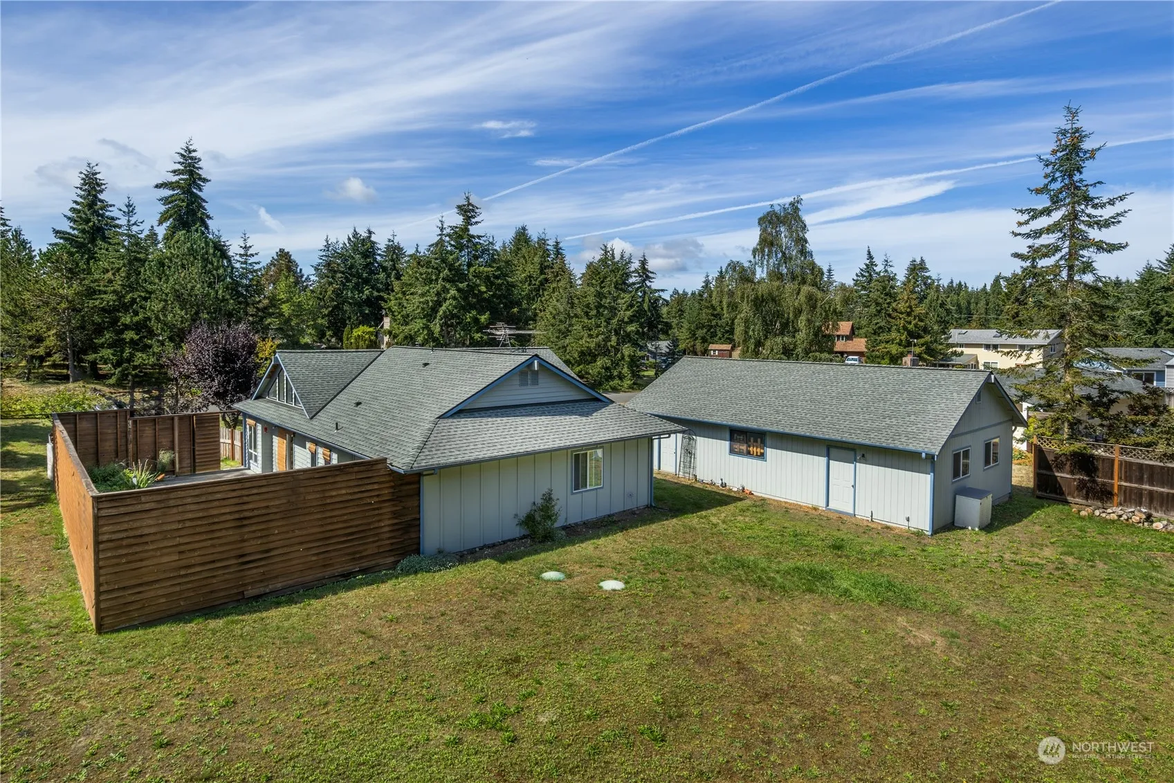 Bright and cheery one-level home with detached garage/shop in a quiet neighborhood in the heart of Port Hadlock. So many amenities to check off the list in this move-in-ready home with vaulted ceilings, a big family room and clerestory windows overlooking a sunny fenced patio and beautiful garden off the living room. The primary bedroom has a full bath, plus there’s two quest bedrooms and a full hallway bath. The 960 sq. ft garage has a huge separate shop with built-in workbenches, lots of shelving and separate power panel. Spacious level yard has fruit trees, gardens, room for a boat/RV, a dog run and grassy areas for pets and play. New kitchen floor & fridge. Great location, close to schools, library, grocery store, beaches, parks & more!