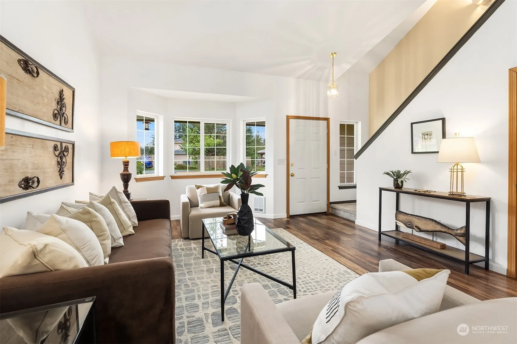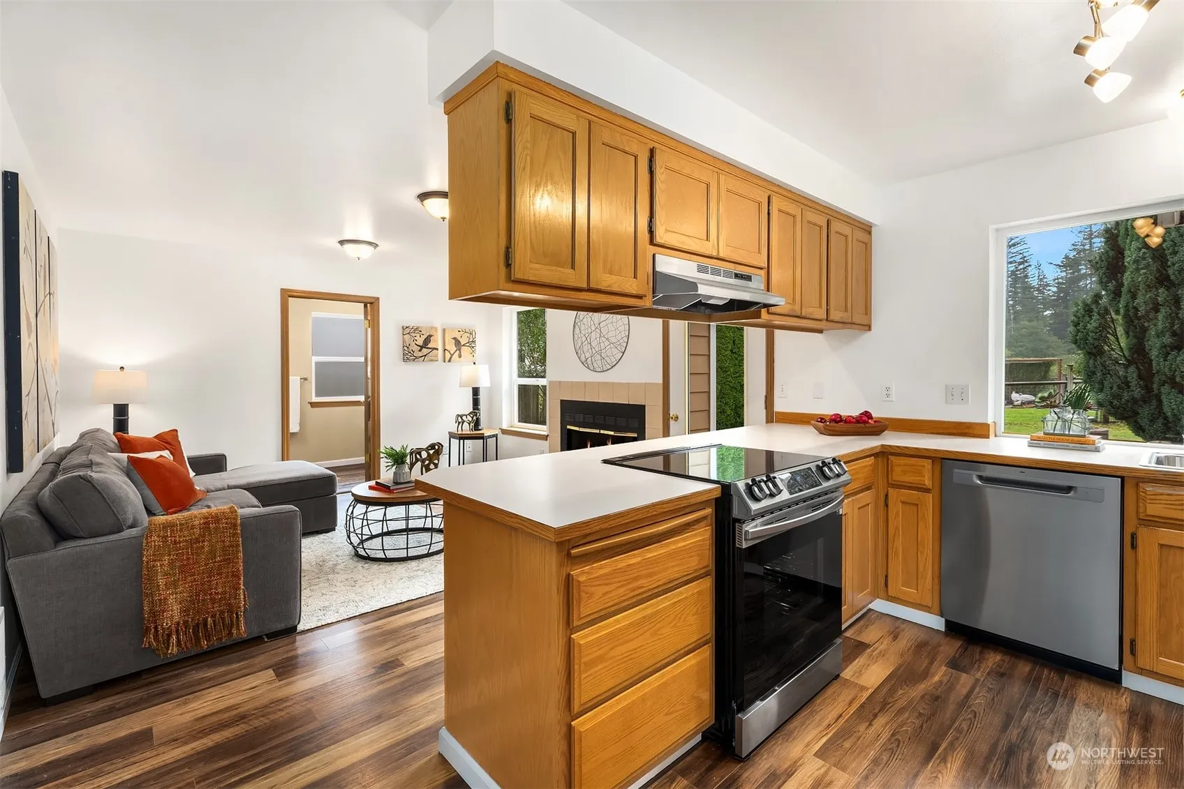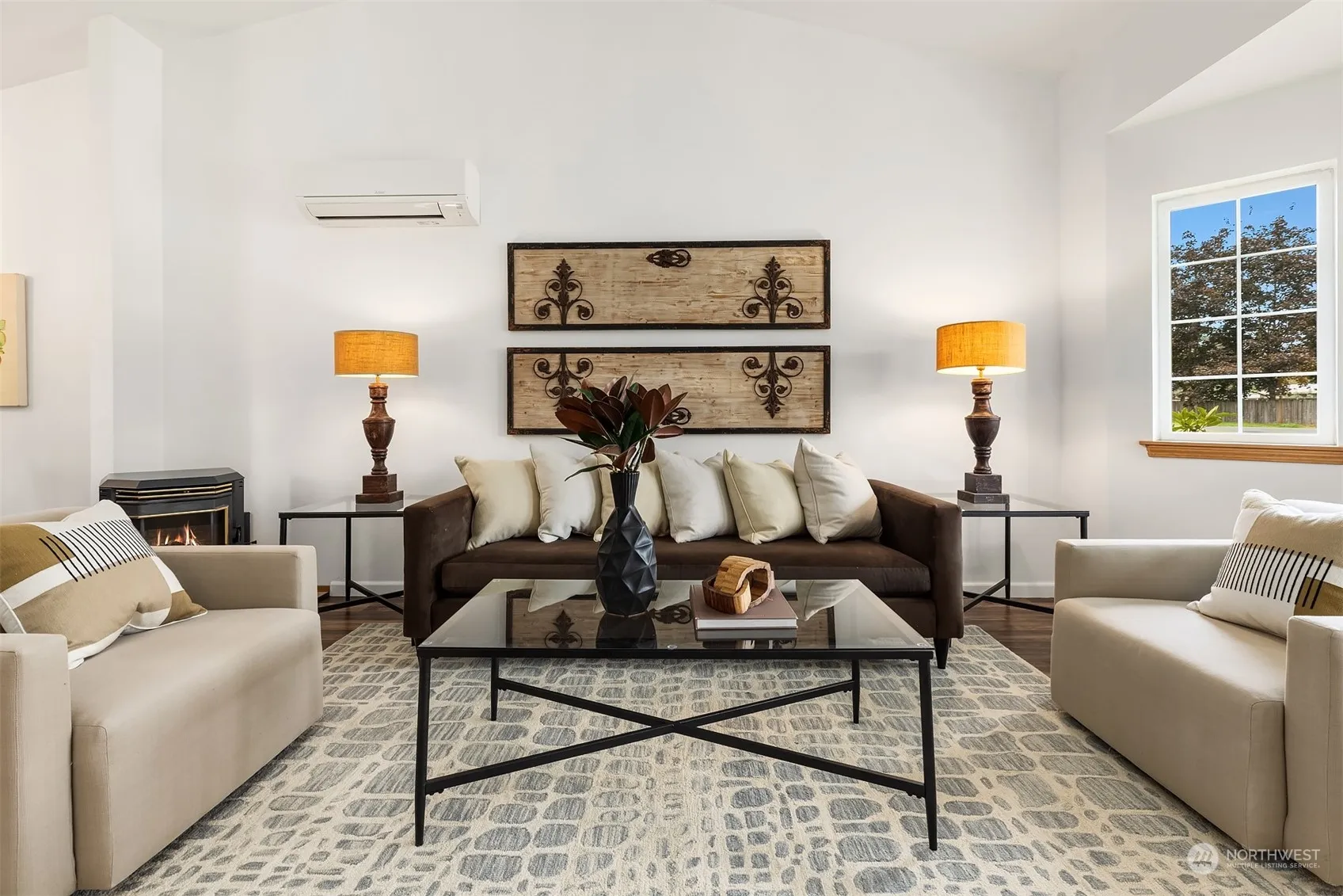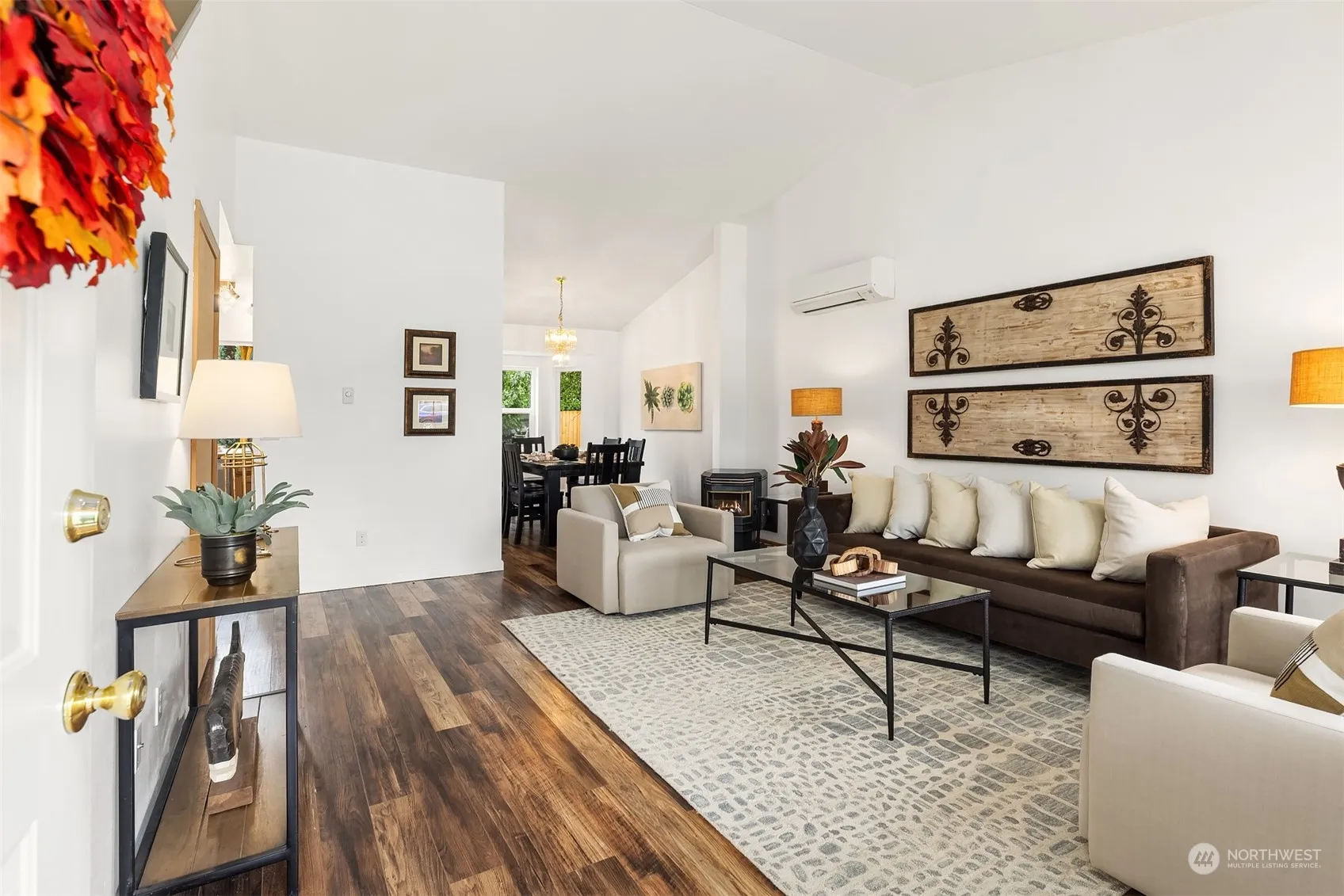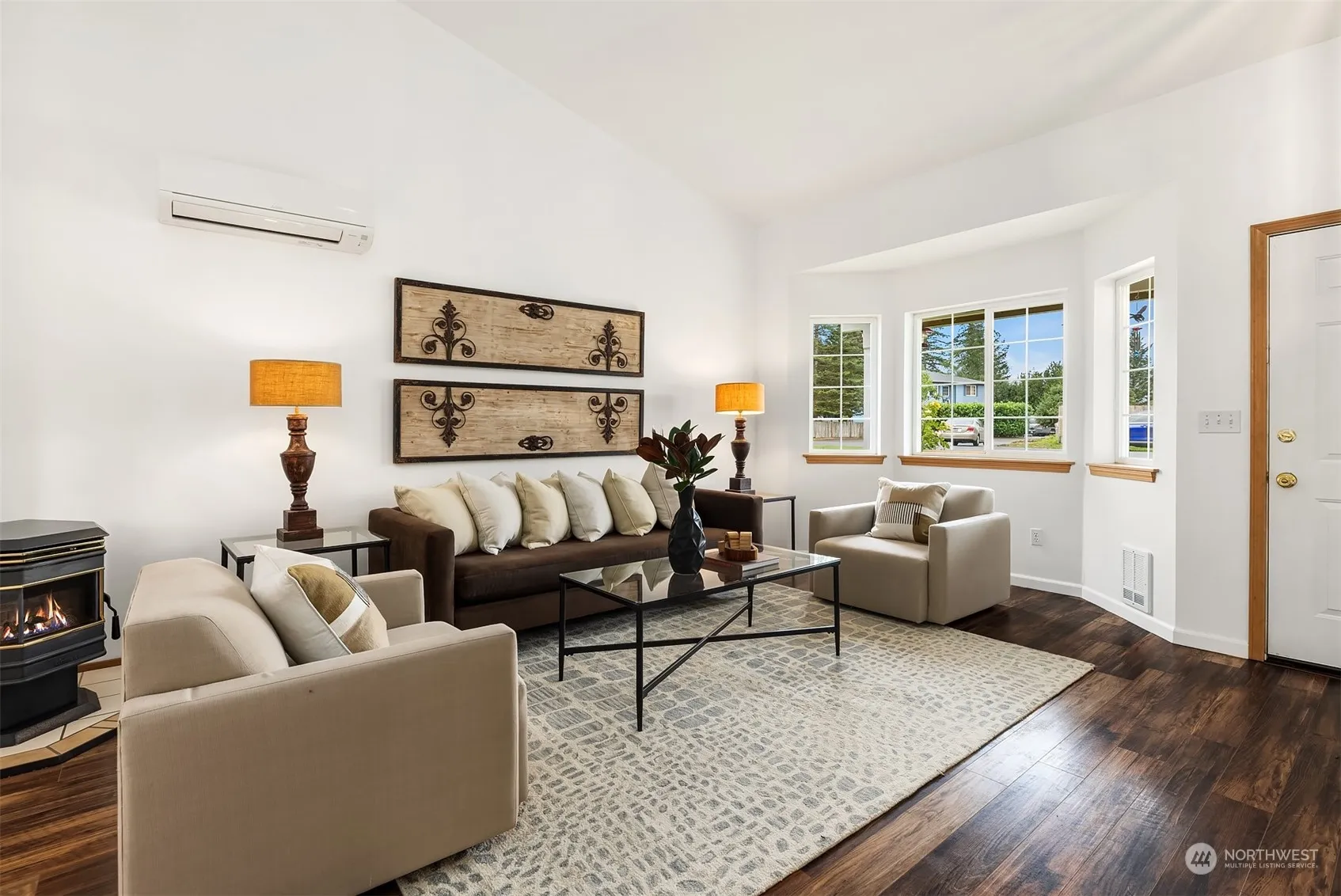 Perfectly situated on a shy third acre level lot, this home has been meticulously maintained, pre-inspected, and is move in ready. The main level includes new flooring, fresh paint, cozy pellet stove for winter ambiance, along with ductless A/C for summer comfort in the living room & primary suite. The kitchen features new stainless appliances & abundant cabinet space. A spacious family room w/ wood burning fireplace opens to a ground level entertainment deck & fully fenced yard with 2 outbuildings (1 w/ electricity) a fire pit & mature fruit trees. The upper level includes new carpet, primary suite with 3/4 bath, 2 additional bedrooms & a full hall bath. Leaf Guard gutters. Quiet neighborhood location yet close to all local amenities.
