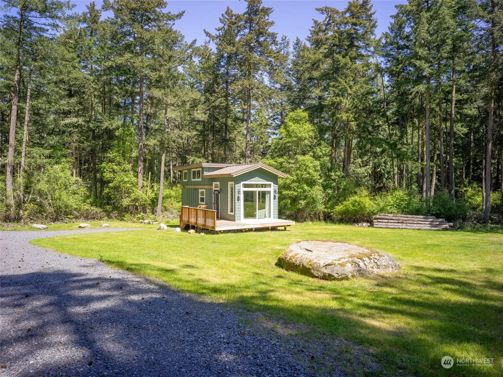 Secluded 3bd/2ba house with flex space, very calm and peaceful setting, surrounded by fir and cedars, with a light and airy high quality tiny home finished in 2023 on a second tax parcel. Very calm and peaceful setting, surrounded by fir and cedars, with a 800 s.f. pole barn in the back, and a single car garage on the way in. New carpet, comfortable layout, a great place to enjoy the sunshine. Tiny home has a minisplit heat pump for inexpensive heating and cooling. Fiber optic internet. Enjoy the benefits of Cape St. Mary estates, including community beach access and common land, with a second 3 bedroom septic for future expansion. Close to the best public beaches and parks on Lopez, and surrounded by beautiful forest.