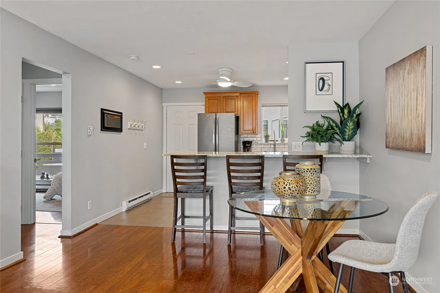 Back on the Market! Buyer’s financing didn’t work out. One block from Des Moines Marina! Beautifully remodeled condo with partial view of Sound. Kitchen with quartz countertops and subway tile back splash, stainless steel appliances, with breakfast bar. Bathroom with porcelain floors, quartz countertops and porcelain shower surround with rain shower head. Cherry finish engineered hardwood floors throughout living area. Deck off of Living Room has Western exposure providing lots of light! No rental cap. Walking distance to restaurants, coffee shops, shopping, marina, and park. One reserved off-street parking space in back (Space #9). Prime location!