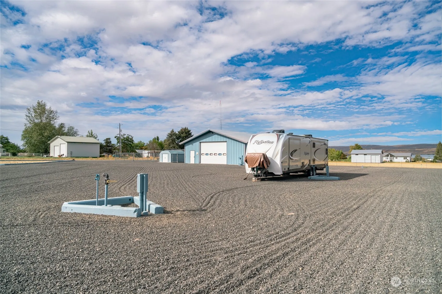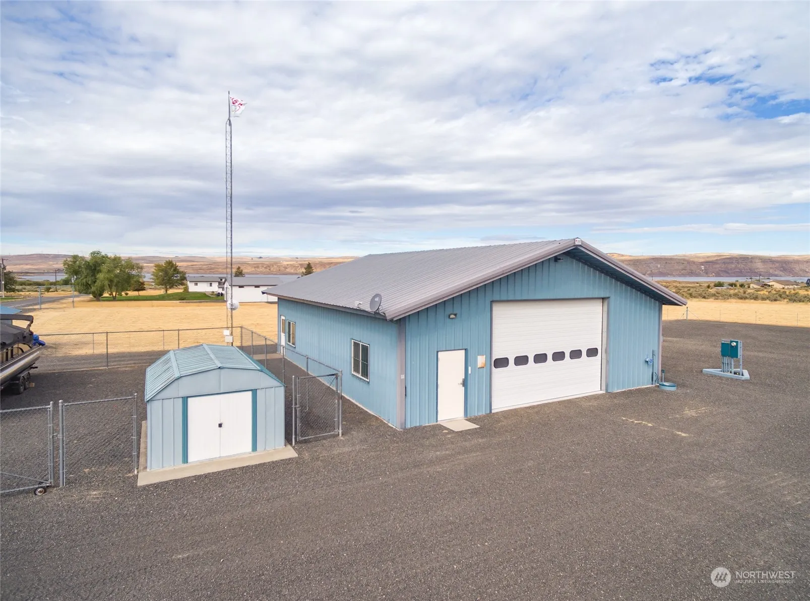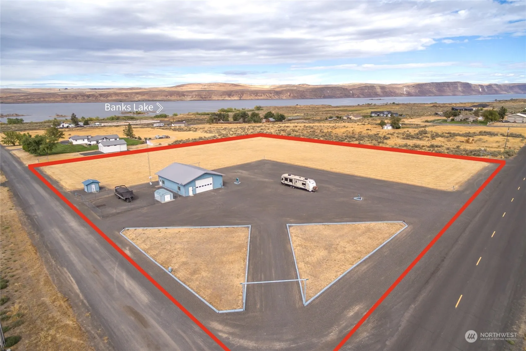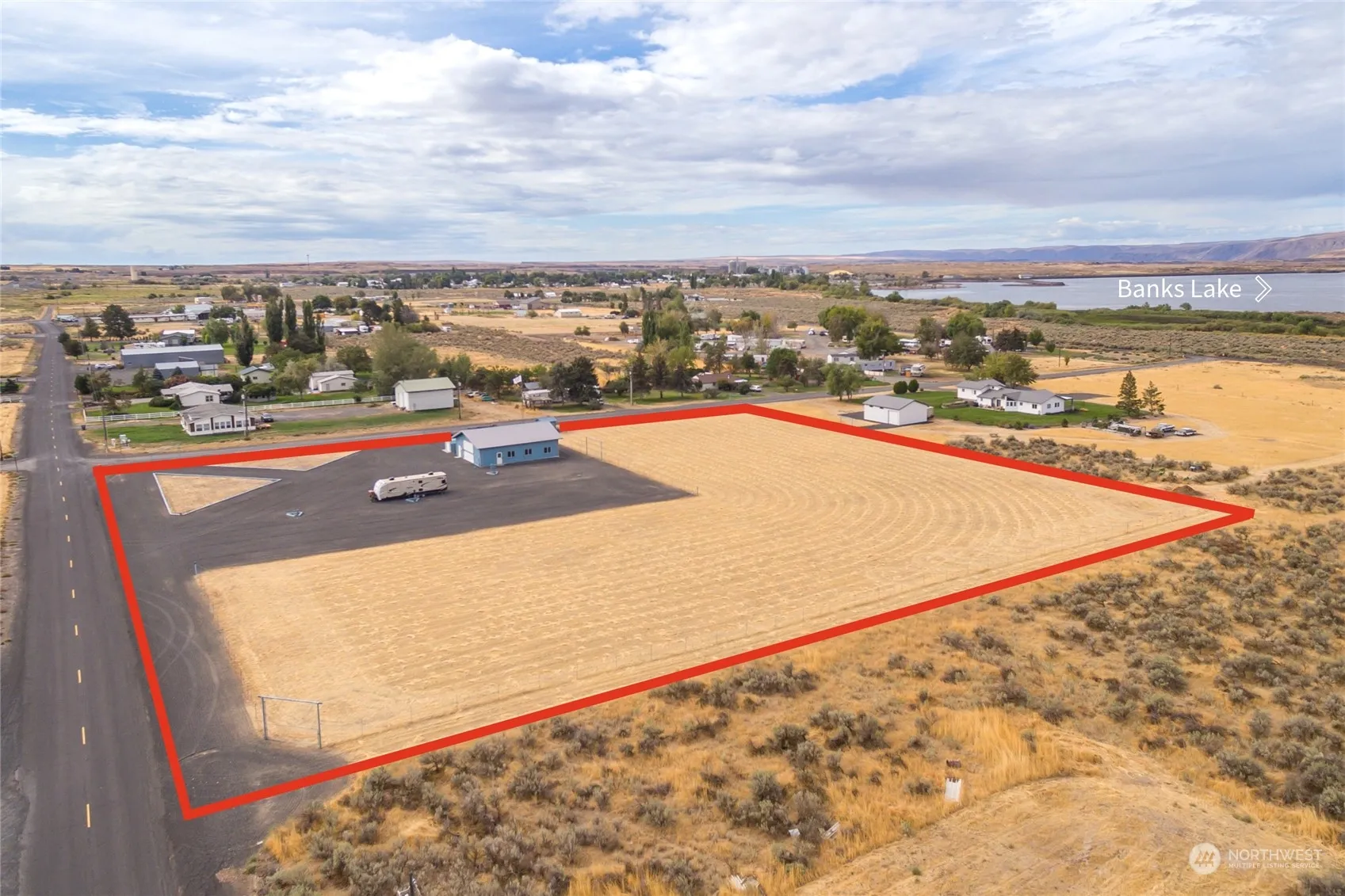 Only a block from Banks Lake, this is a remarkable opportunity to own just under 4 acres in the middle of sun country! Overlooking the lake, this parcel has an enormous 2003-built shop with 2,000 square feet of interior space, a large garage door for easy entry for large vehicles, and power/water. The shop also has concrete, and heated floors and is fully insulated. The property boasts 2 RV hooks, including 50/30 amp service, septic system approved for a bedroom home. private well, and incredibly affordable Grant County PUD electrical costs. Fenced and cross-fenced with pasture area for livestock and a shed for additional storage. Use as is, or bring your building plans and build your dream home.