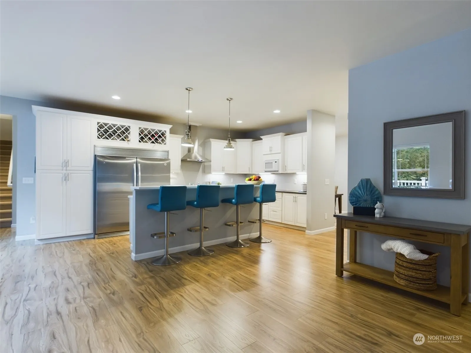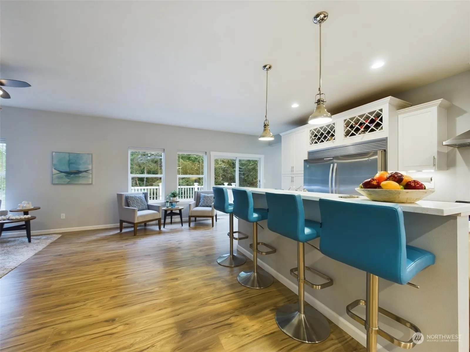 Beautiful no-bank lakefront! This 3-bedroom home, with main floor primary on Trails End Lake offers 150 feet of waterfront along a private deep water canal, complete with a deck and dock. Lake stocked with fish and open year around! The home includes, bonus room, and a gourmet kitchen. Two large waterfront lots are included, one featuring RV parking and a fire pit. Meticulously maintained with numerous improvements, the property boasts a low-maintenance landscape, fresh paint, and new flooring. It is also wired for a hot tub on the deck. Enjoy the tranquility of your own lakeside wildlife sanctuary! (Two bedroom Septic)