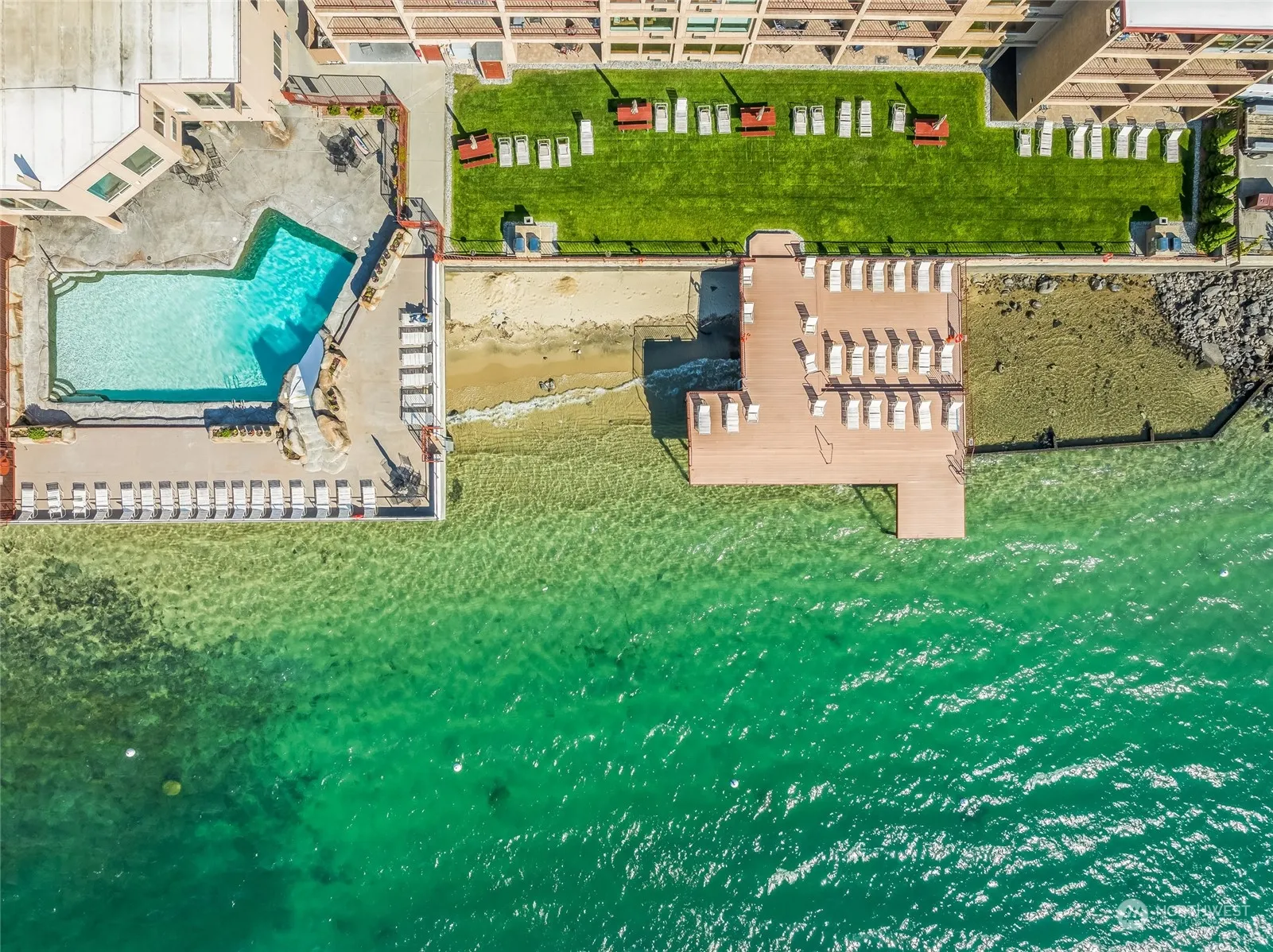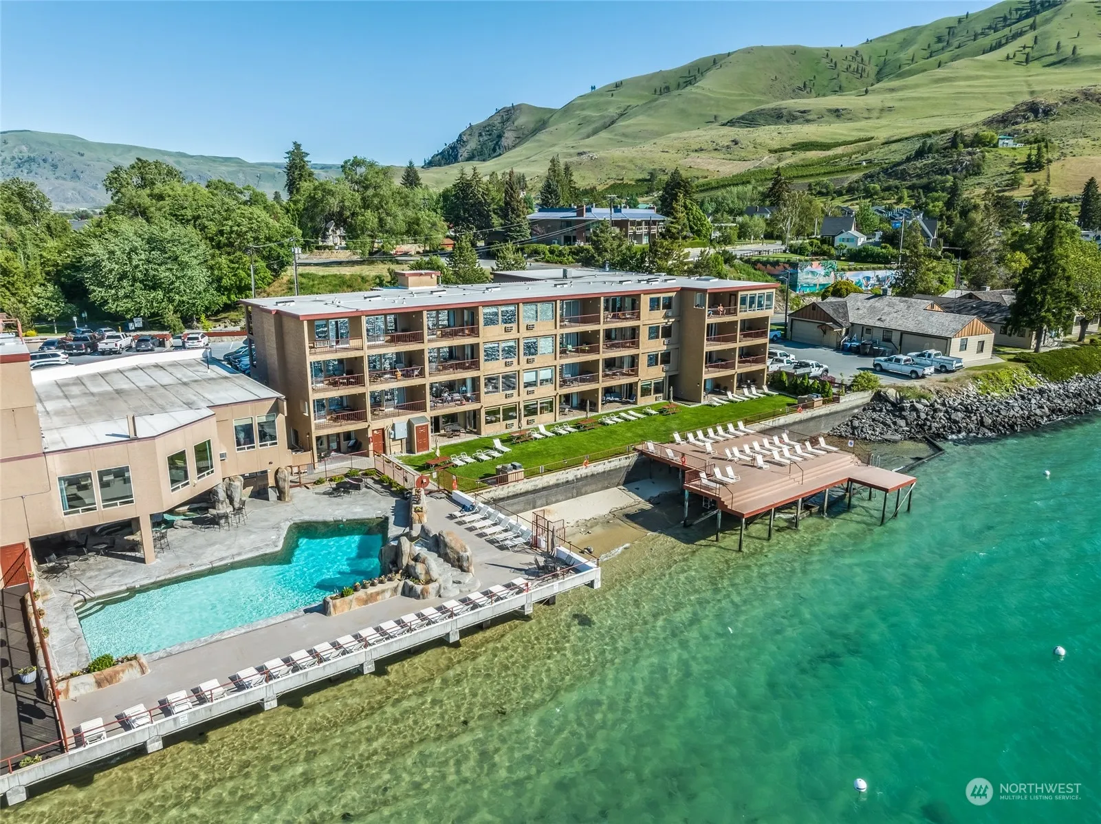 Beautiful Lake Chelan condominium sitting right on the water. Views of the lake and mountains are always open and gorgeous! Very fine craftsmanship, quality cabinets and upgrades at every level on the inside including quartz countertops and all new appliances. This one bedroom, one bathroom condo has been completely redone with wonderful colors tones and stylish accents. This is a turn-key, brand new unit. Very close to downtown Chelan and all that it has to offer. The Grandview has amazing amenities including pool, hot tub, fitness center and concierge. On-site property management is available to keep a continuous flow of income for investors.