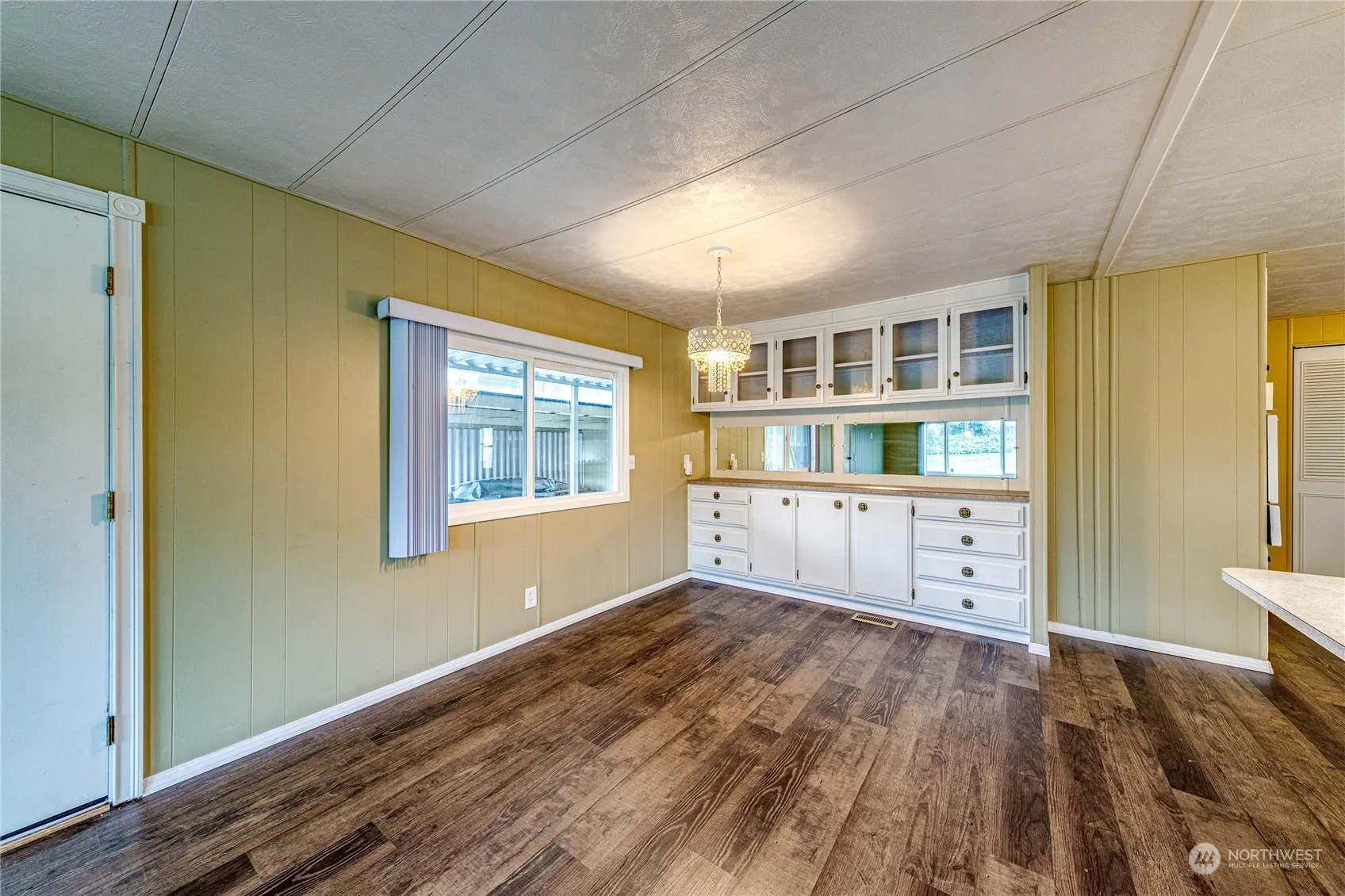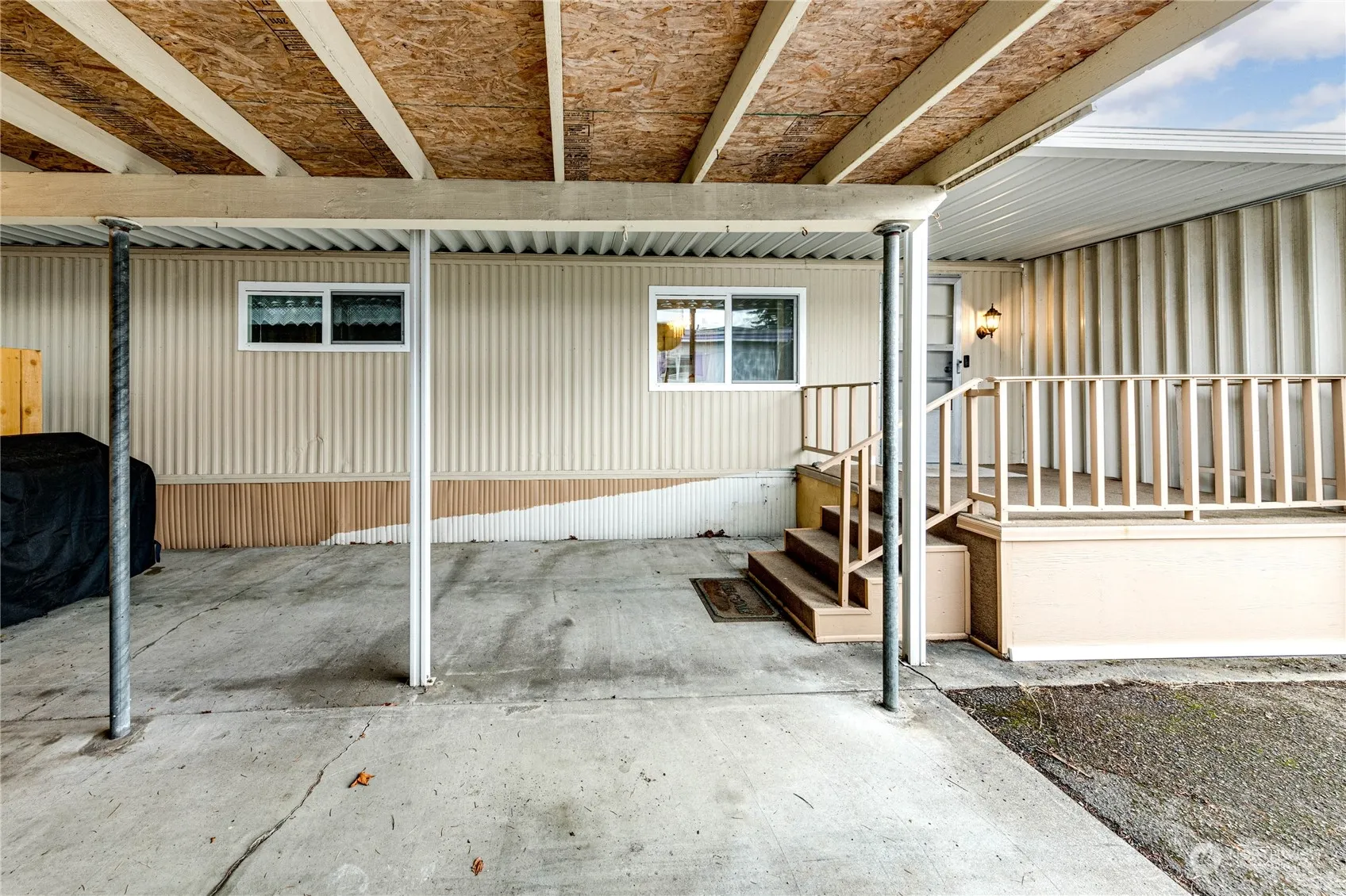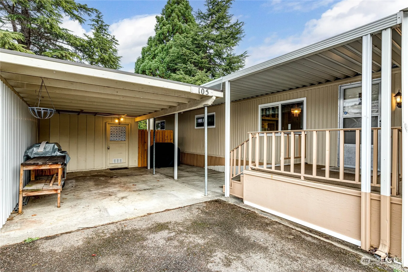 Immaculate 2BR 2BA double wide in desirable Spruce East Park, within walking distance to shopping, transportation, medical facilities, and more! Enjoy peek-a-boo mountain views, lots of parking, carport, storage room, private covered patio and deck, updated electrical, forced air, open concept living/dining/kitchen with new vinyl plank flooring throughout, formal dining area with built-in buffet and eat-in kitchen with peninsula for bar stool seating, pantry, laundry area, refreshed bathrooms, and primary with double closets! Clean, clean, clean – move right in!