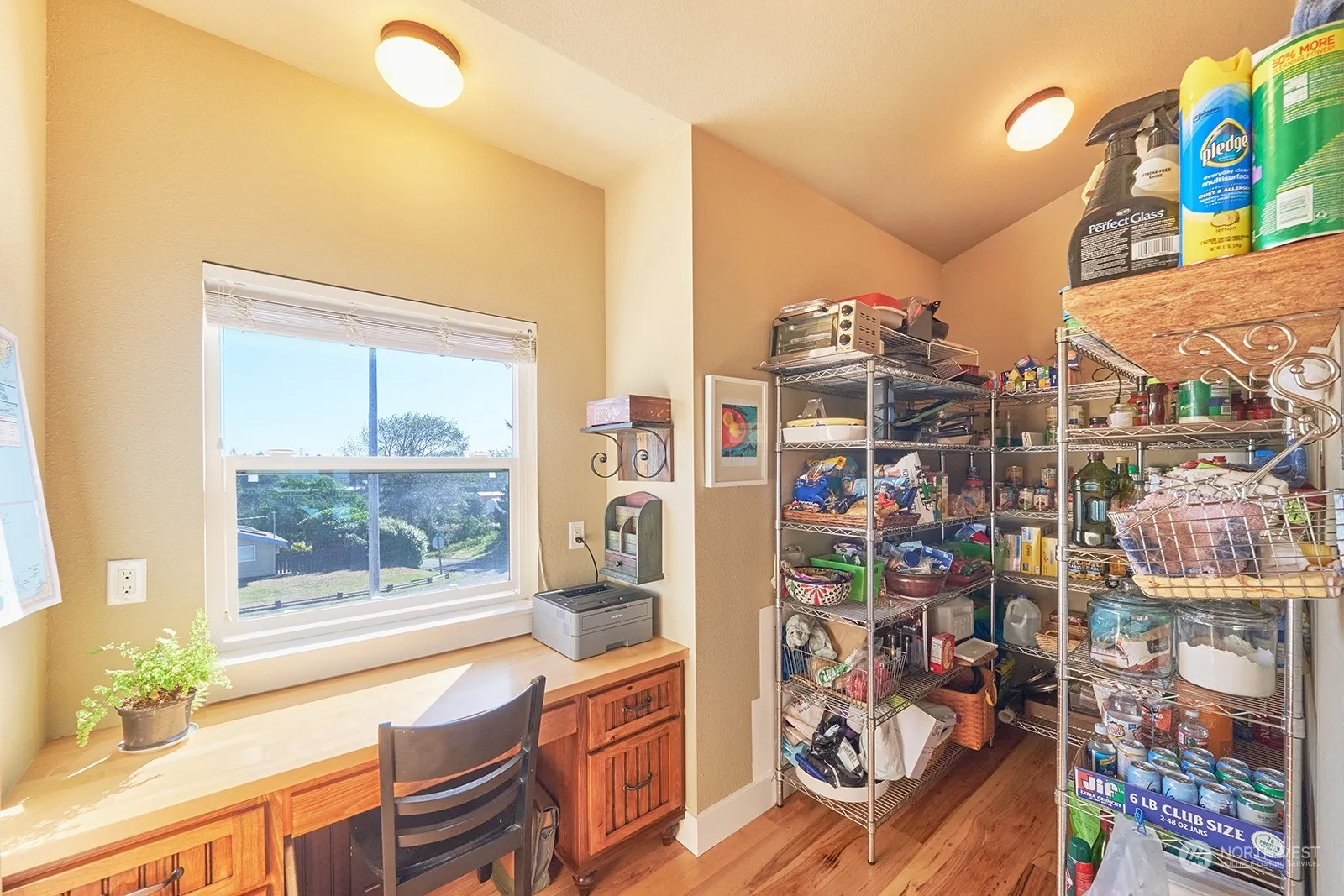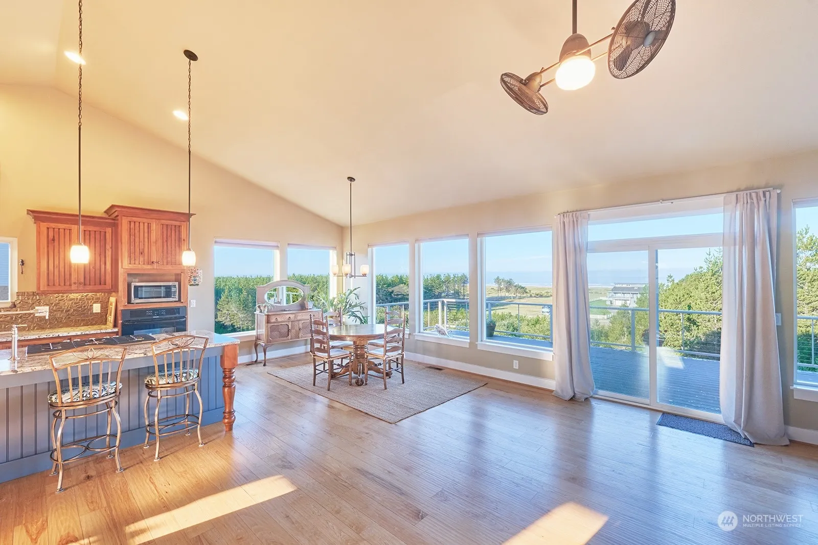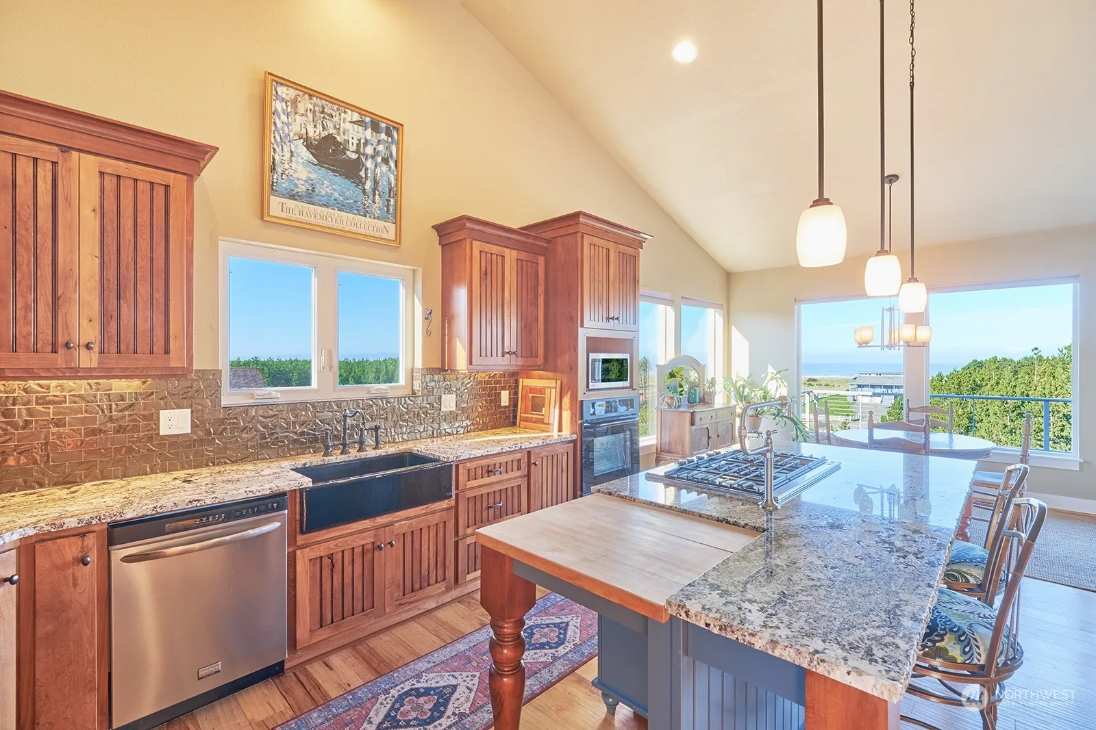 Ocean view garden sanctuary! Ascend the ridge to your modern farm house at the seaside. Ocean facing great room with vaulted ceilings and a wall of windows and slider to expansive deck. Savor the scraped hickory floors glowing throughout this custom light filled home with views from both floors. Watch the sunsets and crab boats as you warm yourself by the fire, or cook in the exquisite kitchen with granite countertops, cherry cabinets, propane downdraft cooktop with pot filler. Enjoy your beverages on the west deck, or on the comfortable sunrise facing porch overlooking the garden. Luxurious primary suite with heated bath floors, 2 more bedrooms and a den downstairs, plus garage and workshop. Turn key serenity awaits!