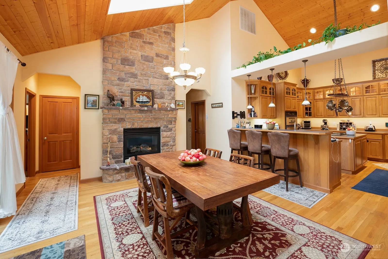 Discover this exceptional rambler home featuring 2,866 sq ft of living space, complemented by a 2,440 sq ft shop. Home boasts vaulted ceilings & skylights. Living room is highlighted by a floor-to-ceiling stone fireplace w/ a wood-burning feature. The gourmet kitchen is a chef’s dream, equipped w/ double ovens, stylish cabinets with accent lighting, & a convenient eating bar. The primary suite is spacious & inviting.Additional amenities include a heat pump with air conditioning and two more gas fireplaces for added comfort.Step outside to a large covered deck, perfect for entertaining or relaxing. Shop is equally impressive, offering a full bath & a large unfinished space upstairs that could be transformed into an ADU. Heated garage & shop.
