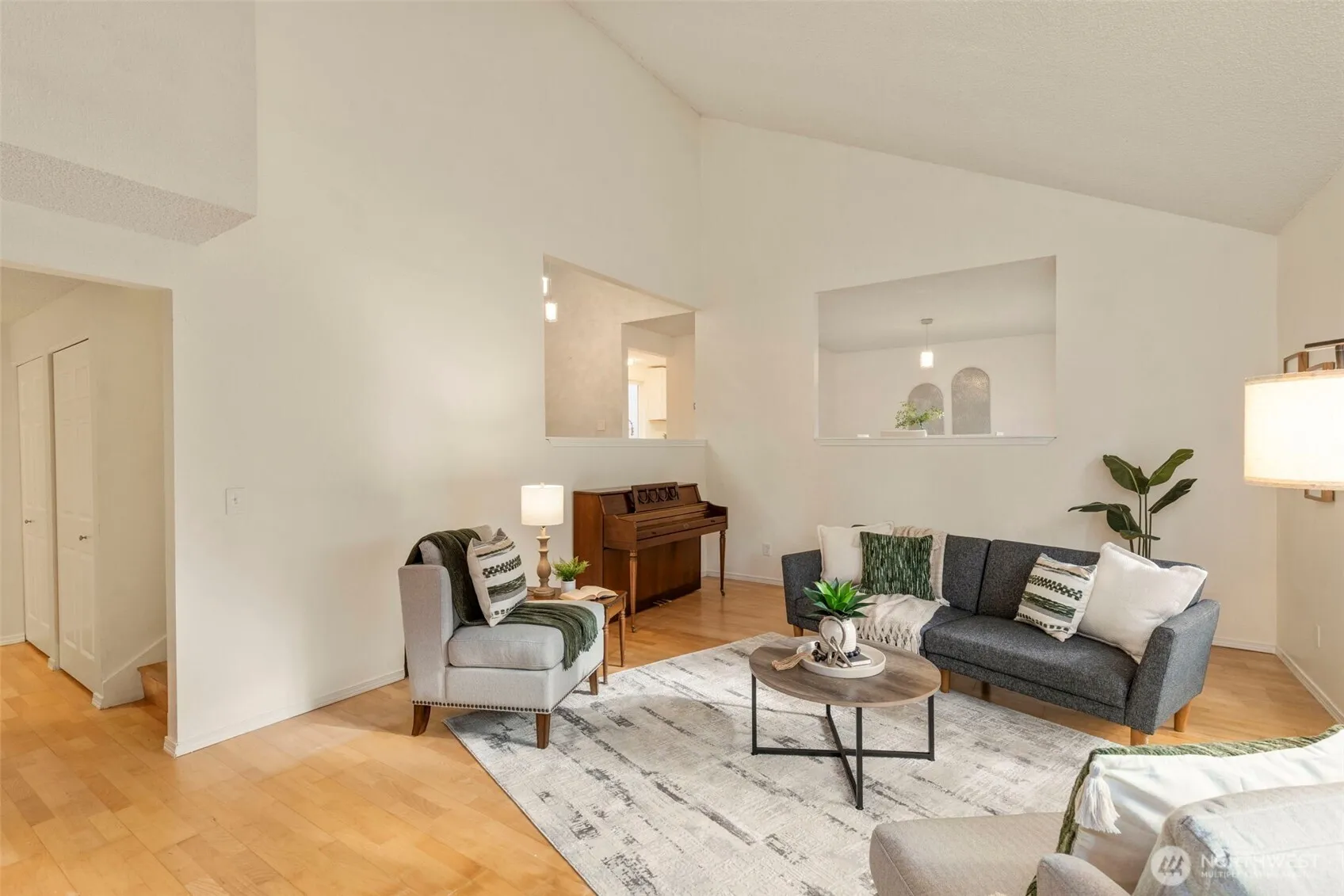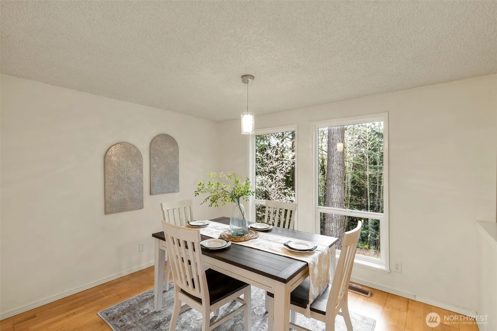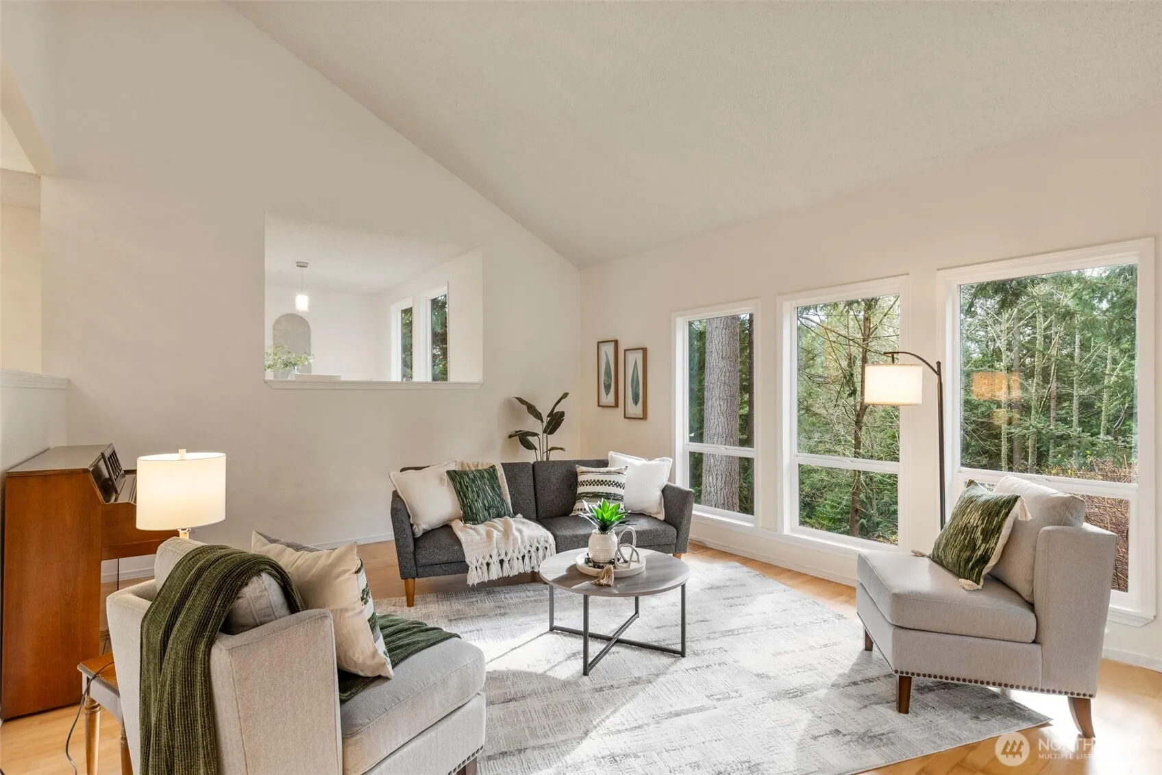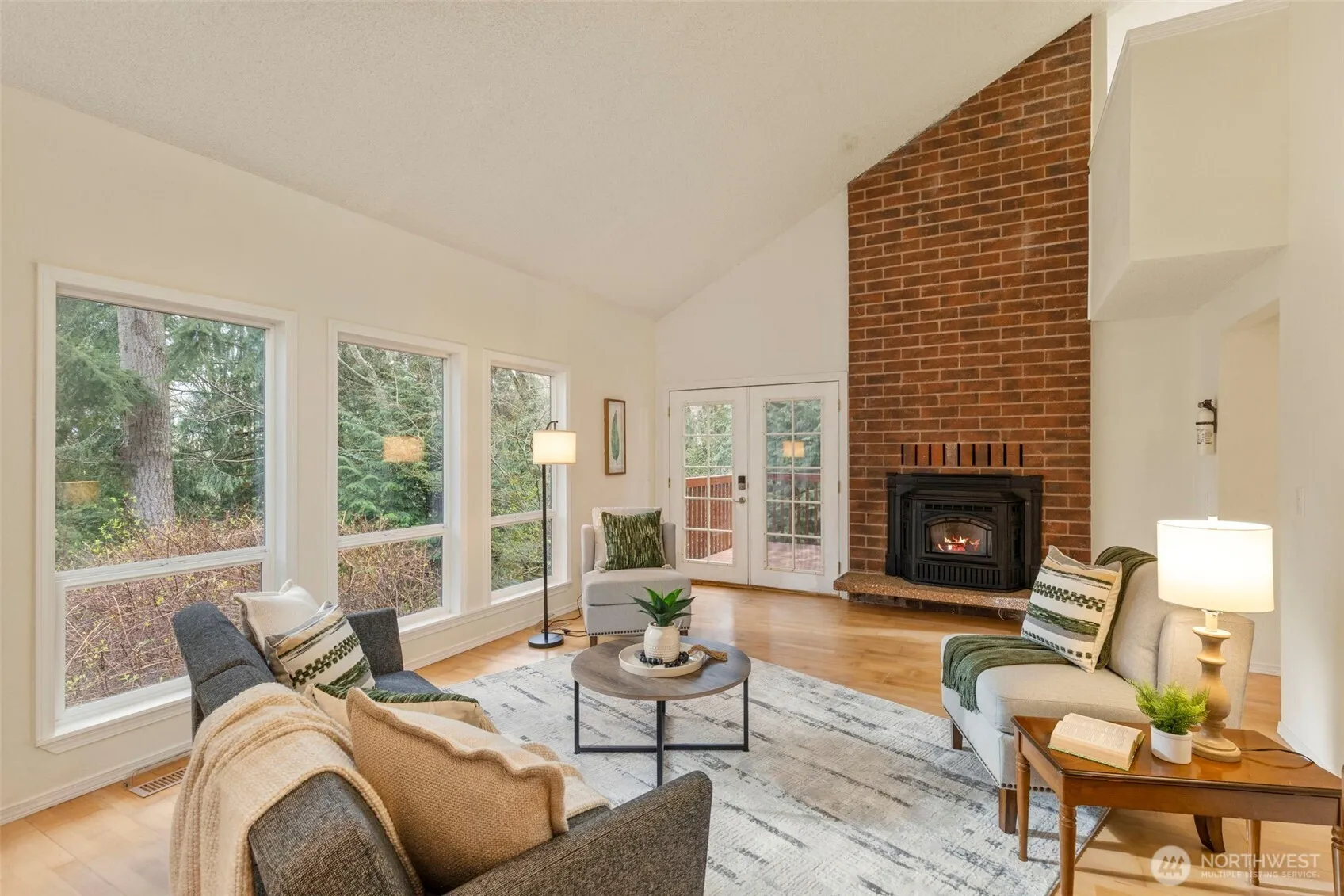 Peaceful 2.33 acre property. Soaring vaulted ceilings, oversized windows overlooking the serene property. Stylish new lighting, plumbing fixtures, and new interior doors. Inviting kitchen has butcher block counters, stainless appliances, and new white cabinets. Formal living room features a dramatic floor to ceiling brick hearth, and French doors leading to the deck. Newly installed fiberoptic for internet and cable keeps things speedy. Upper level primary bedroom boasts a private bath, walk in closet, and a birds eye view of the tranquil grounds. Beautiful low maintenance gardens, with plenty of extra beds if you want to hone your green thumb! Welcome to your home sweet home!