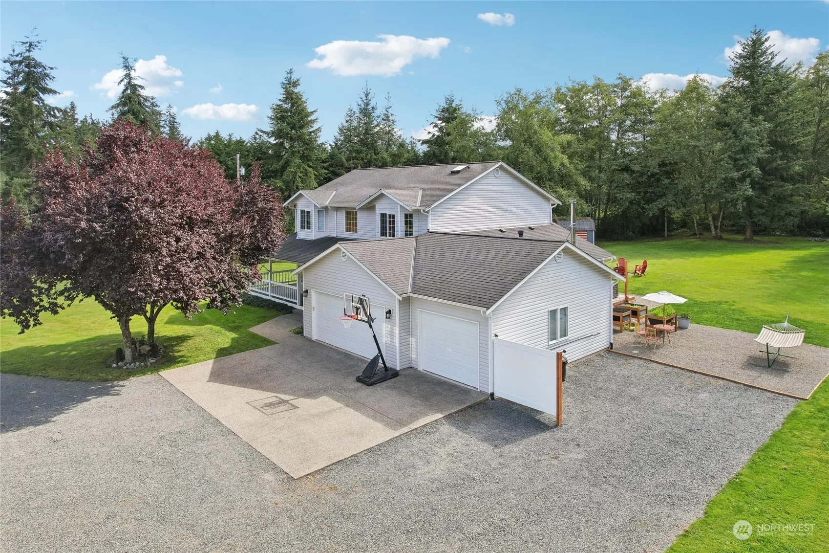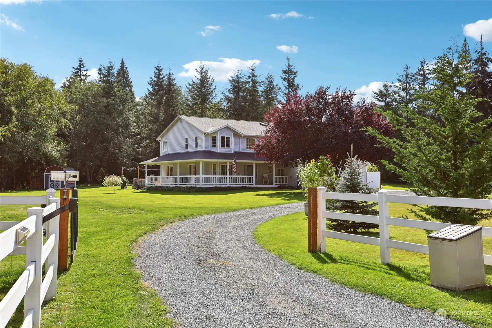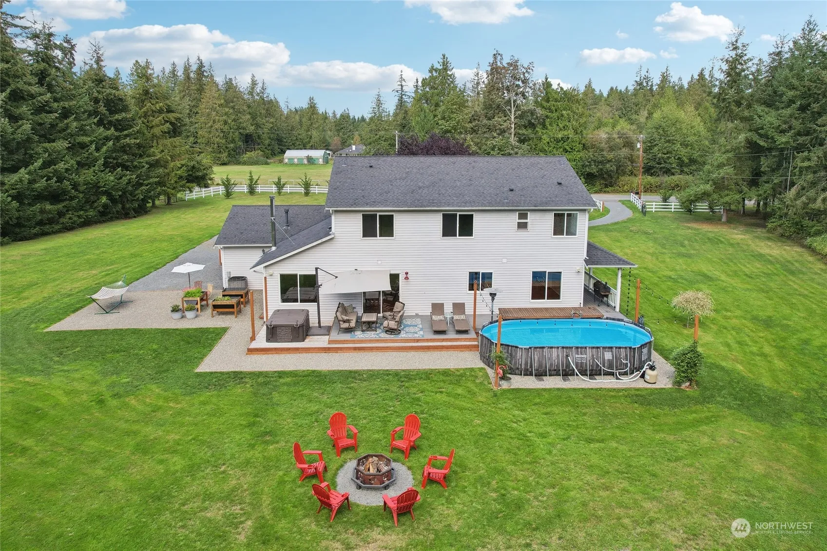 This charming 2-story farmhouse with gated entry, sits on shy 6.5 acres of flourishing pristine landscape. The veranda offers expansive pastoral views. Upon entering , enjoy a formal living and dining area w/ beautiful flooring. Hm offers an open-concept, kitchen & family rm w- a cozy wood stove. The primary bd rm w- bay window seat & considerable storage. Lrg bthrm w/ luxurious soaking tub, walk-in closet & dual sinks. Outdoor you will love the wooded acreage with trails for walking, ATV’s ,etc. Home has Green grass, mature garden, fire pit, pool & chicken coop. This home is equipped for a generator, 2 propane tanks, a/c, wood in shed, outbuildings, RV parking w/septic hook up. Potential for an ADU (do your research). Easy access to I-5.