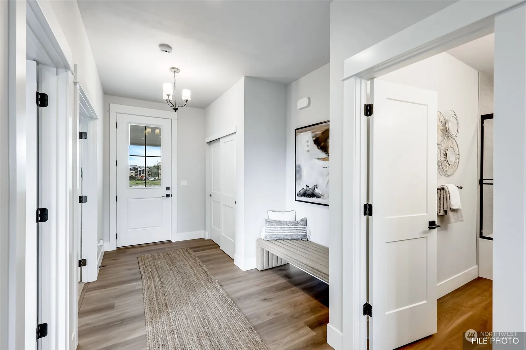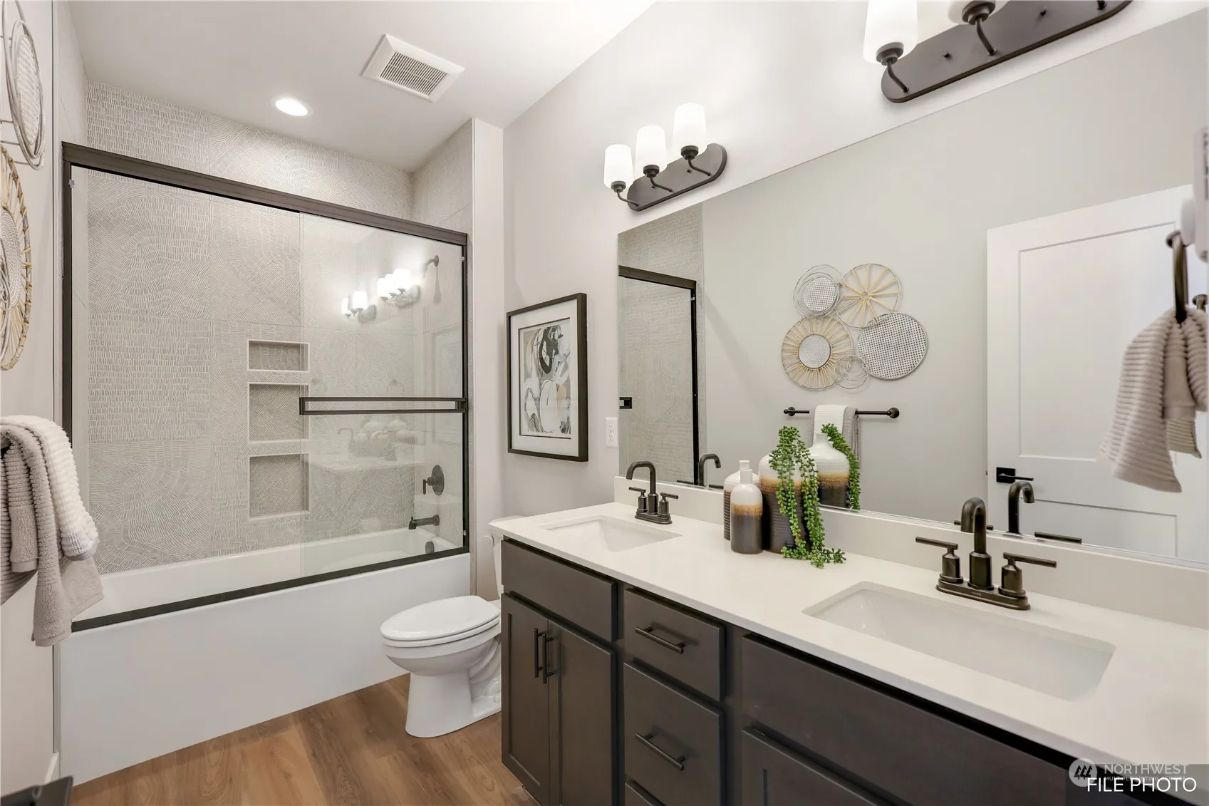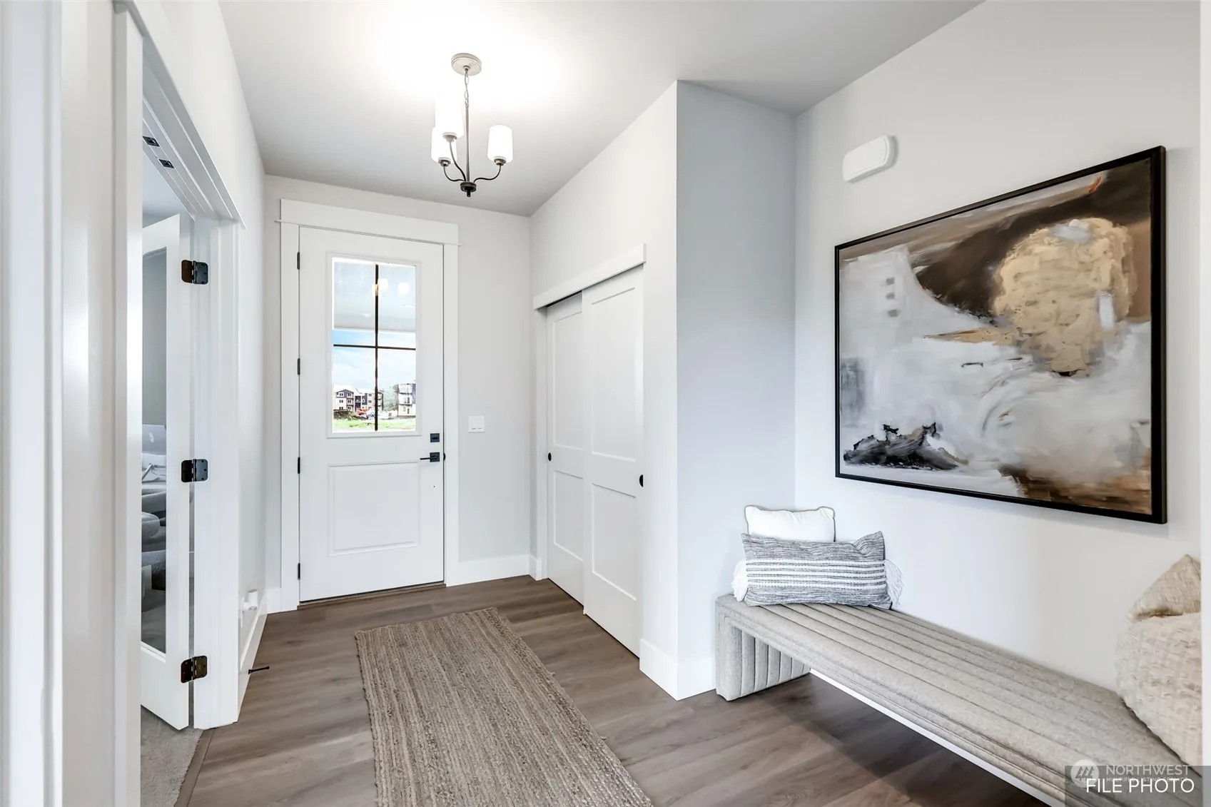 Experience modern living in the Calvary by Azure Northwest Homes. This 3-bedroom, 2-bathroom home combines comfort and style. The great room boasts vaulted ceilings and a cozy fireplace, with natural light streaming through large windows and a double slider. The kitchen is designed for the home chef, featuring 42″ upper cabinets, stunning countertops, an island, stainless steel appliances, and a roomy pantry. The primary bathroom offers a luxurious tile shower/tub combo and double sinks. Outside, enjoy the covered back patio and professionally landscaped front yard. With air conditioning and a 3-car garage, the Calvary blends elegance with practical living. Photos are from our model home, featuring the same floor plan.
