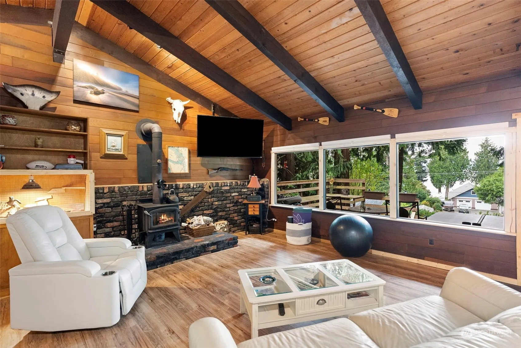 Your own piece of heaven awaits! Discover the beauty of Hood Canal and Olympic Mountains from this charming Kingston property w/2 buildings! Main home features 2 bdrms, a 3/4 bath, & 1,136 sqft of living space, complete with new LVP flooring, AC, & cozy free-standing stove. Adjacent guest house, offering 1 bdrm, a 3/4 bath is approx 224 sqft, adding versatility—perfect for guests or home office. Large 12X14 finished shed provides terrific storage. New roof/skylights in 2023, new 4bdrm septic 2018, new waterline from road to house in 2018, new underground powerline & updated panels in both buildings 2018. Short distance to the community beach and boat ramp, this property is ideal for a home business or an incredible $ Air B&B opportunity!