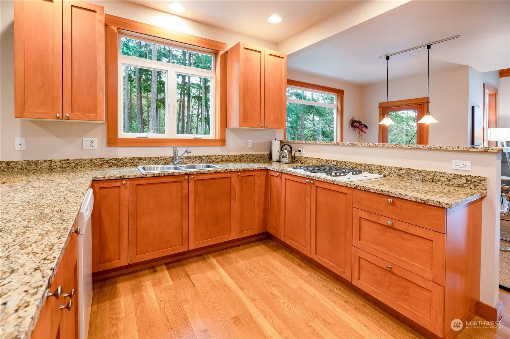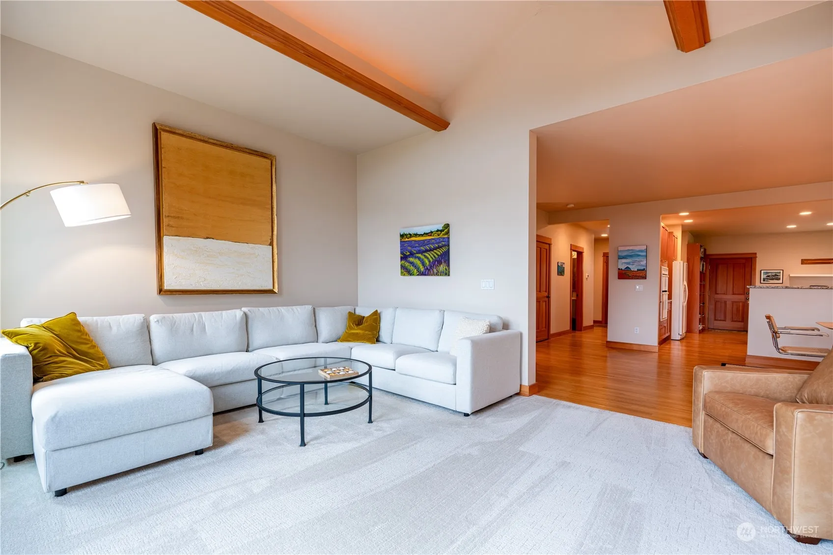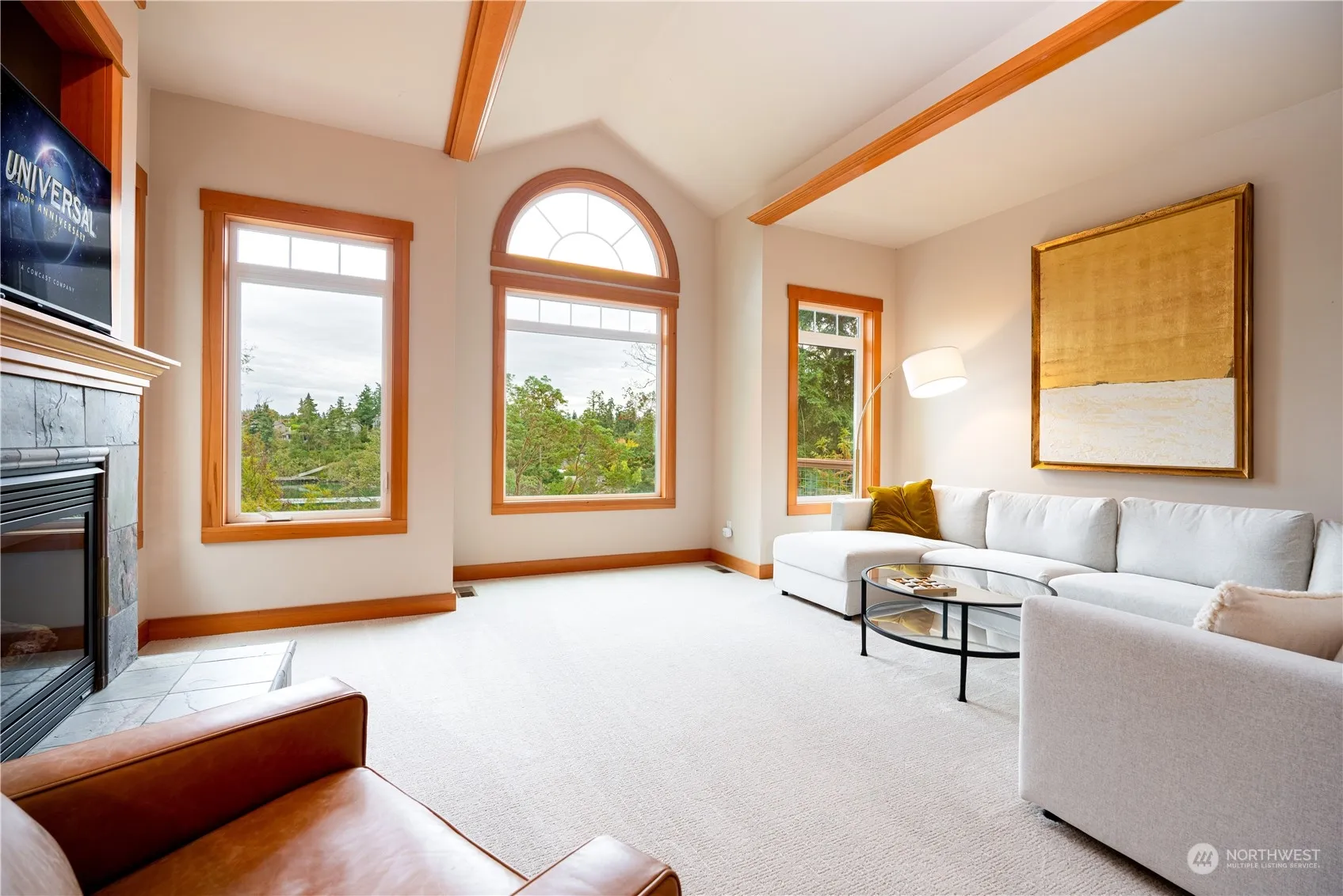 Easy island living in this great end unit with a small water view. This condo unit borders over 400 acres of University of Washington owned land which gives you privacy and peaceful views. Main entry floor is open concept with a nice kitchen, office space and living room with propane fireplace. Primary bedroom and extra bedroom are on lower floor and are both ensuite. Separate laundry room with plenty of storage. Extra finished bonus room off closet in bedroom with shelving and door to outside. A single car garage with new flooring adds to the tidiness of this condo. Close proximity to town of Friday Harbor on foot or by car.