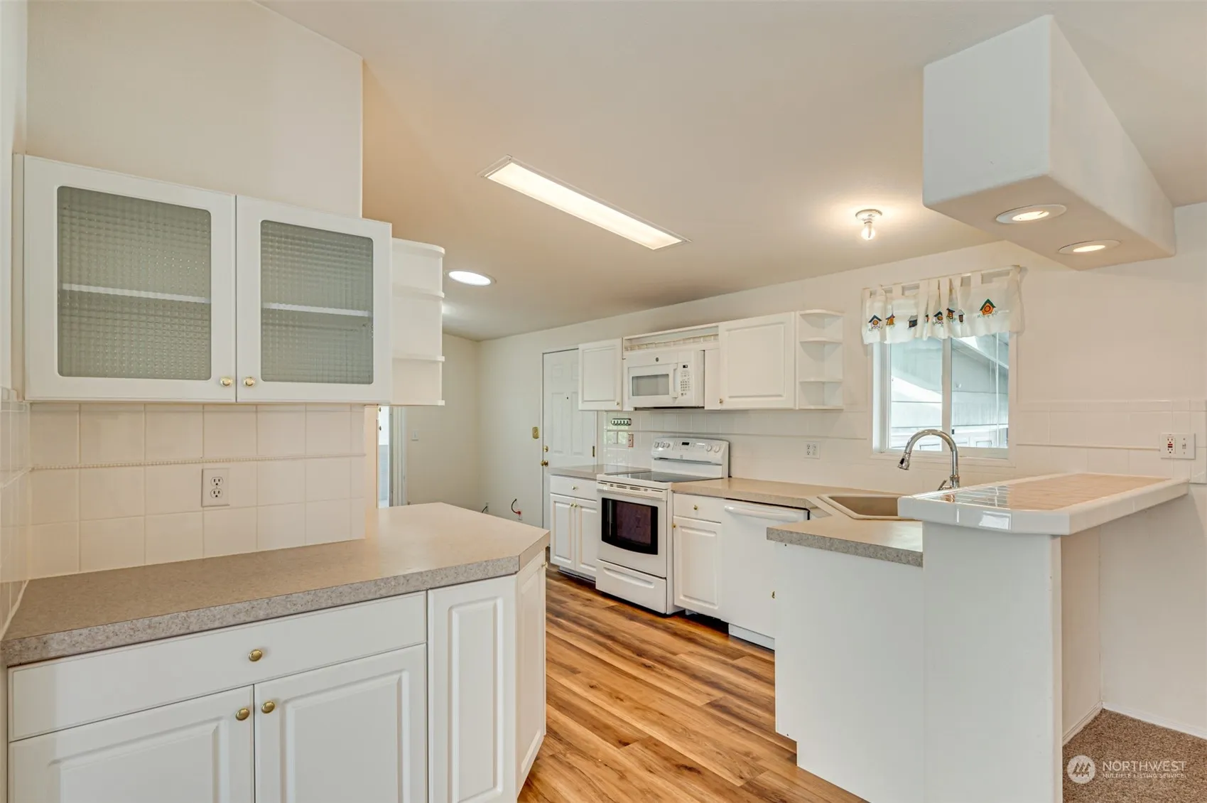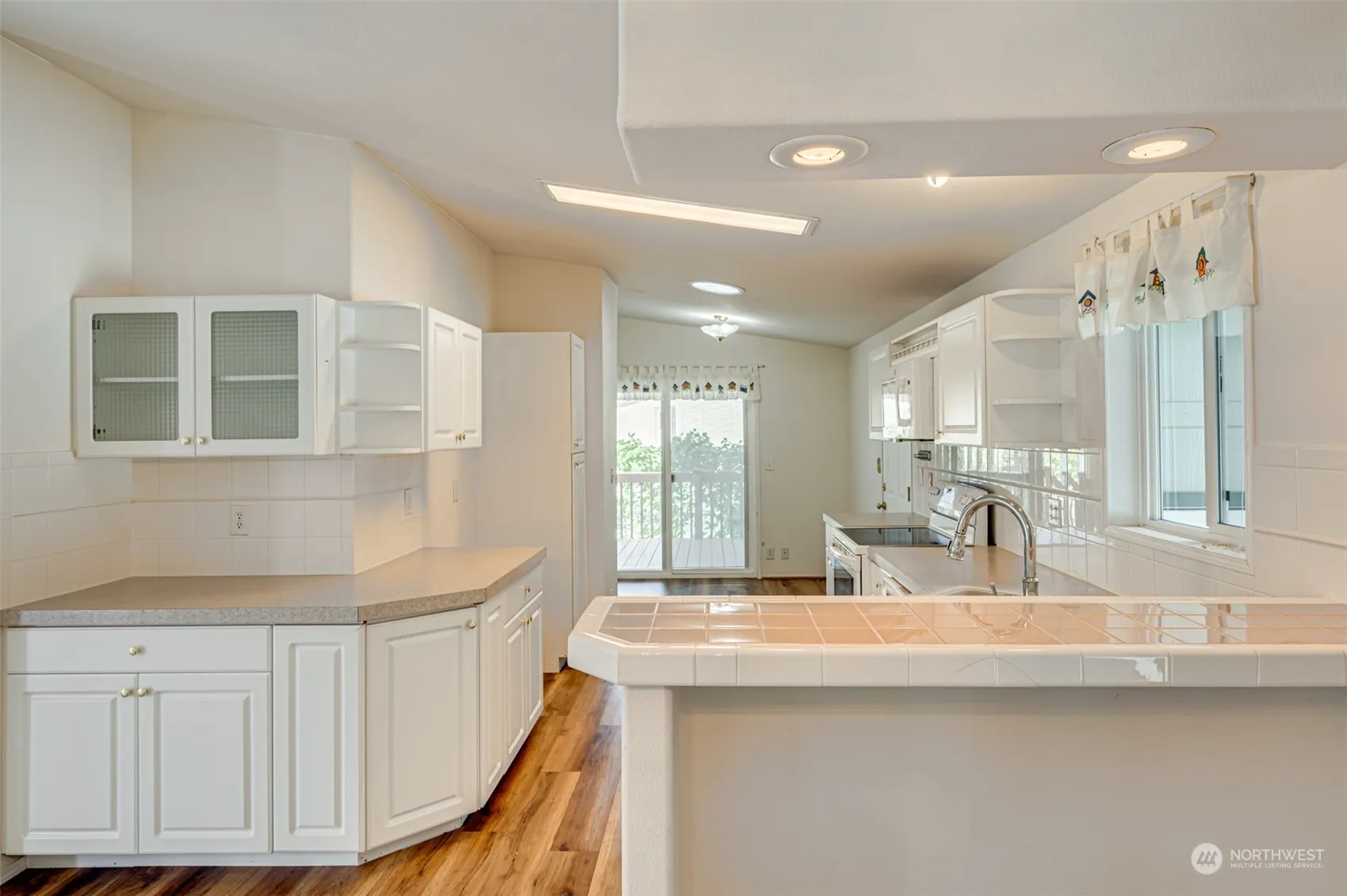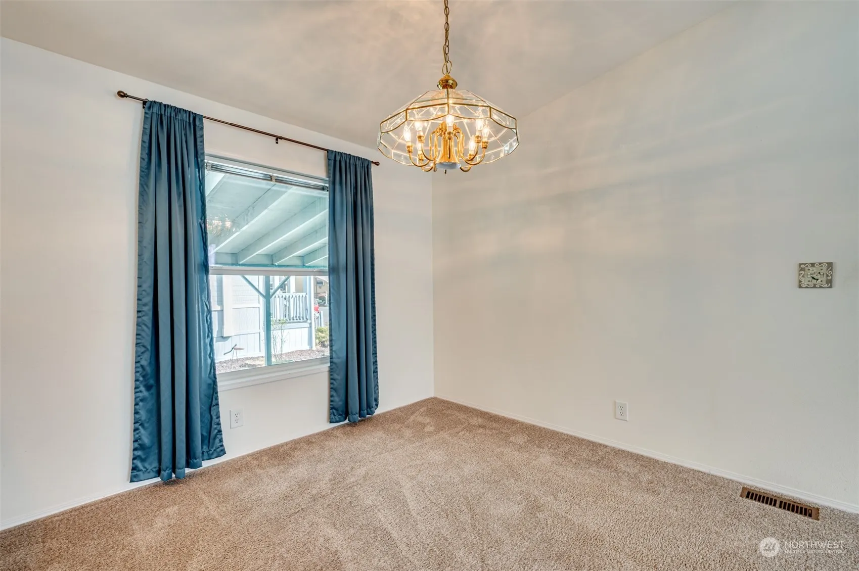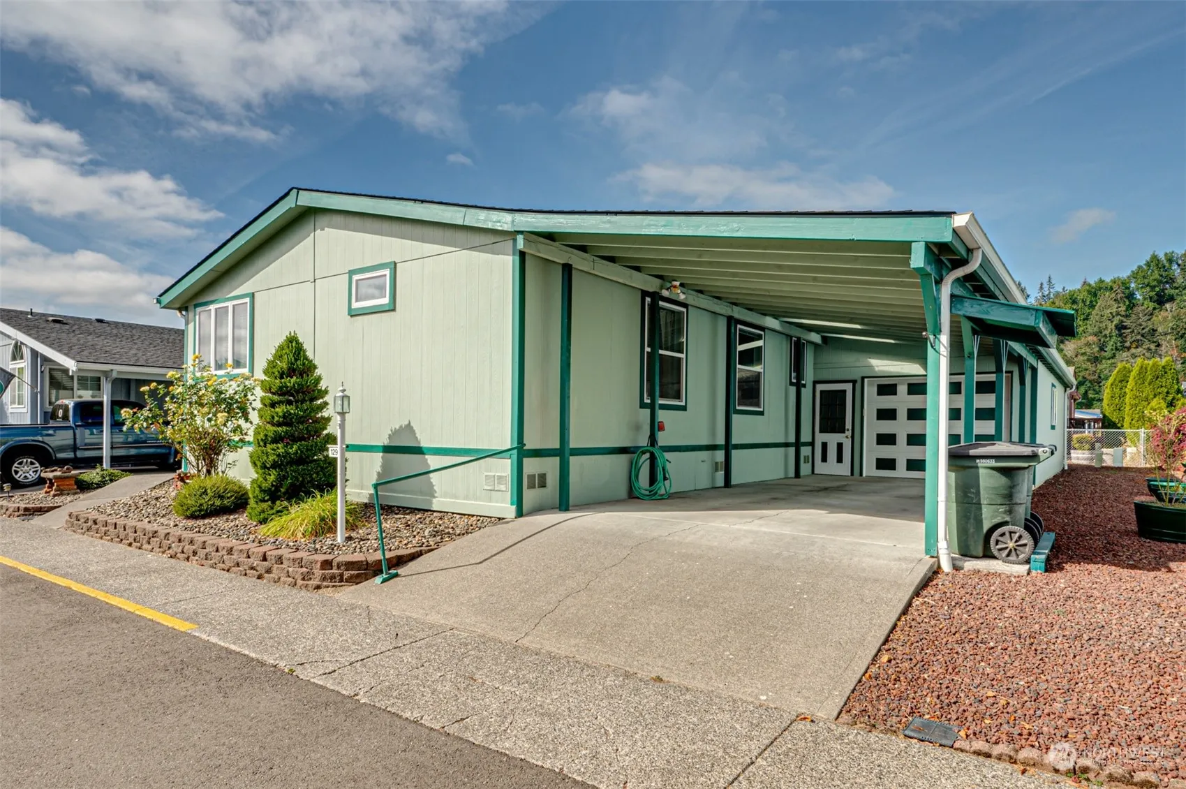 This spacious doublewide manufactured home features an open floor plan with a large kitchen that flows into a spacious living room with vaulted ceilings. Step out from the dining room onto a covered deck, perfect for outdoor enjoyment. The primary bedroom suite includes a jetted tub and a walk-in closet. There are also two additional bedrooms and a full guest bathroom. The yard is easy to maintain and includes raised garden beds. Parking is convenient with an attached garage plus an extended carport. Located in a desirable 55+ park with gated entry and a community area. Recently replaced roof & heat pump make it move in ready! Monthly space rent is $1,250.