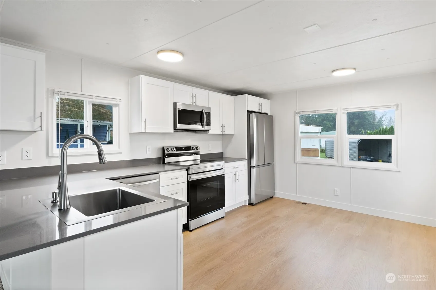 This beautifully remodeled manufactured home, nestled in the heart of Carnation, offers a perfect blend of comfort and tranquility within a welcoming 55+ community. This 2 bedroom / 1 bathroom home boasts modern upgrades including new flooring, kitchen, bathroom, water heater, furnace, carpet, roof, and fresh paint throughout. The open-concept layout allows natural light to flow through, creating a perfect space for hosting or relaxing. Enjoy the peaceful surroundings with the added convenience of being only minutes from nearby shops, restaurants, parks, and other amenities. Lot rent is $750 a month. This is an opportunity you don’t want to miss!