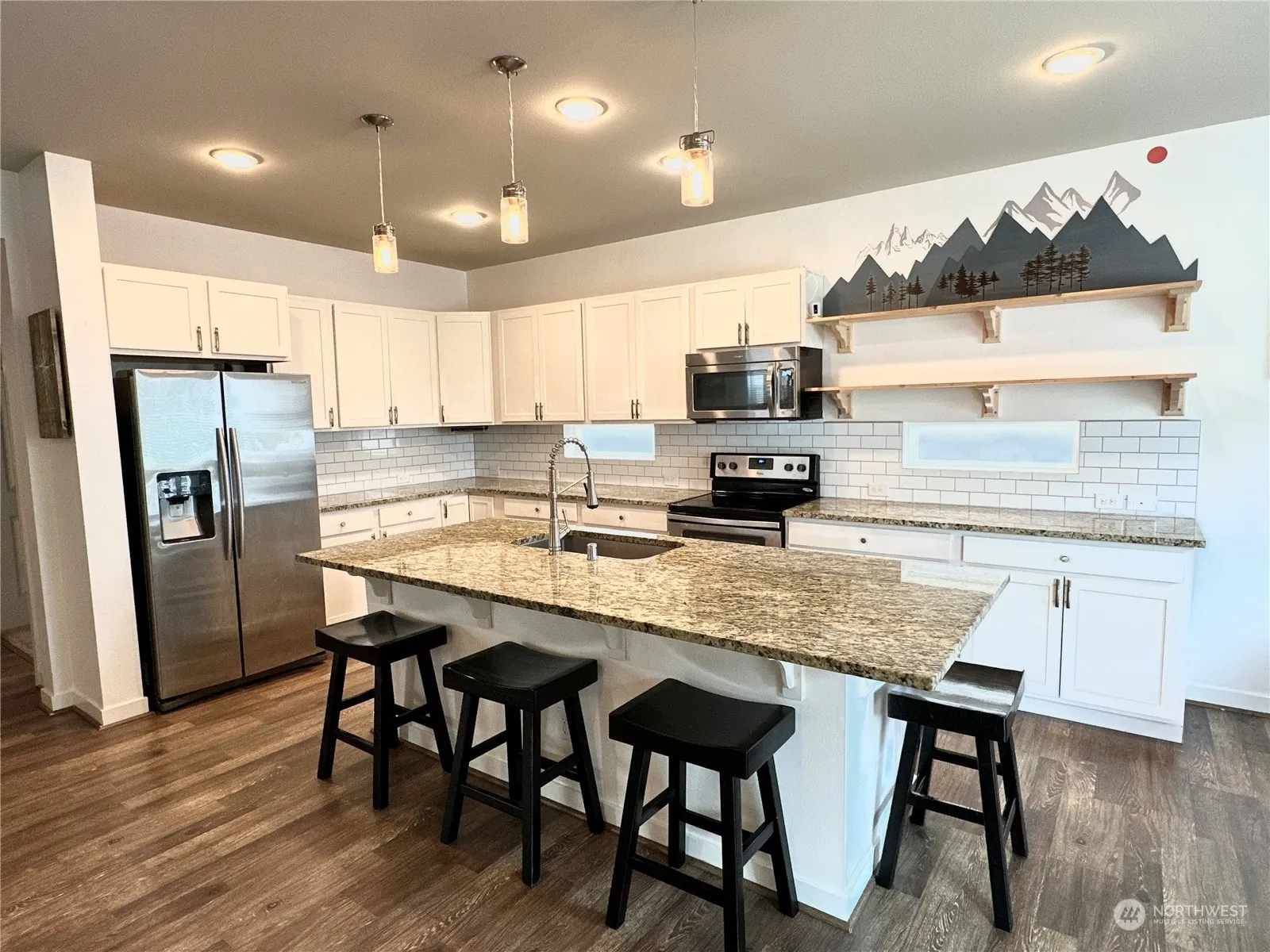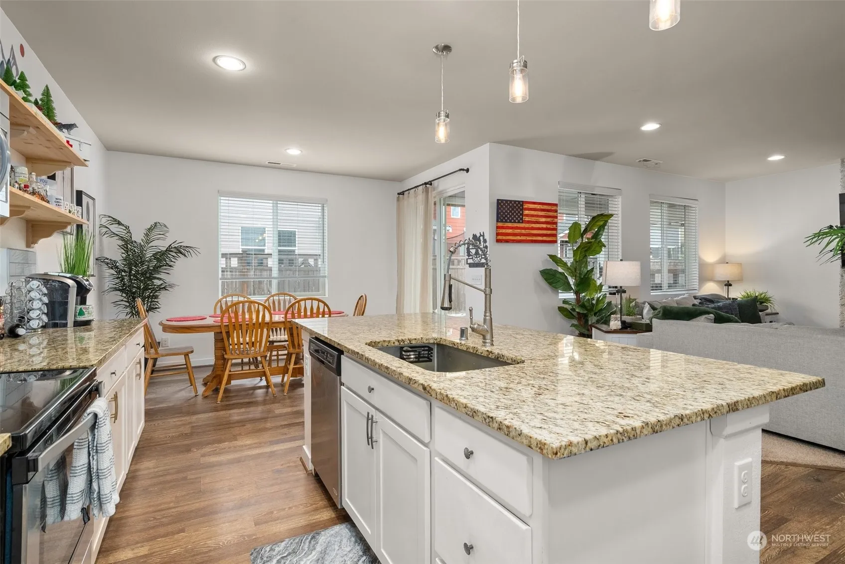 4 Bedrooms + MAIN FLOOR office/den (or 5th bedroom). Kitchen boasts a HUGE granite island and subway tile backspace with white cabinetry. Stainless steel appliances and washer/dryer stay! Beautiful white millwork, luxury vinyl plank flooring, vaulted ceilings and big windows throughout the main floor. Completely updated primary suite bathroom complete with step-in shower and custom tile. Front and backyard has turf- no need for a lawnmower! Complete with a dog run! Backyard has covered patio with extended sitting area perfect for entertaining. Great schools, easy commute to JBLM and I5.