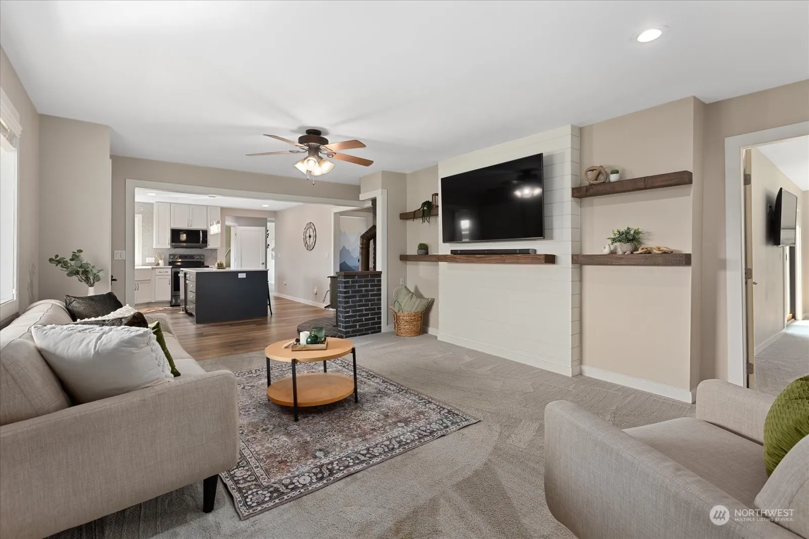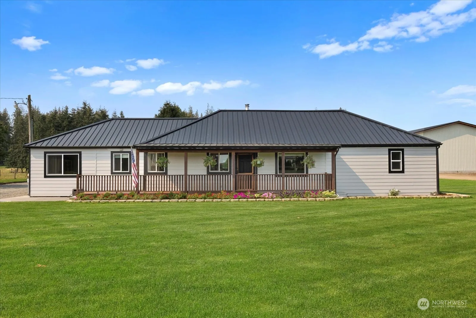 Picture-perfect Modern Farmhouse with impressive 4 bay shop! Situated on a 1.29 acre lot, this tastefully updated single story home is a true showstopper. Stunning eat-in kitchen, quartz countertops, white shaker cabinets and stainless appliances complete with walk in pantry and formal dining area. Luxurious primary suite with magazine worthy ensuite bathroom and walk in closet. Expansive design with two additional bedrooms, an office and bonus space. Spend quiet mornings on the covered porch, evenings entertaining on the back patio or gardening with dazzling views of the Canadian mountains. A brand new 44X82 shop with 14′ doors plus overhang and 26X40 shop with lean-to leaves nothing to be desired – perfect for hobbies, equipment, & toys!