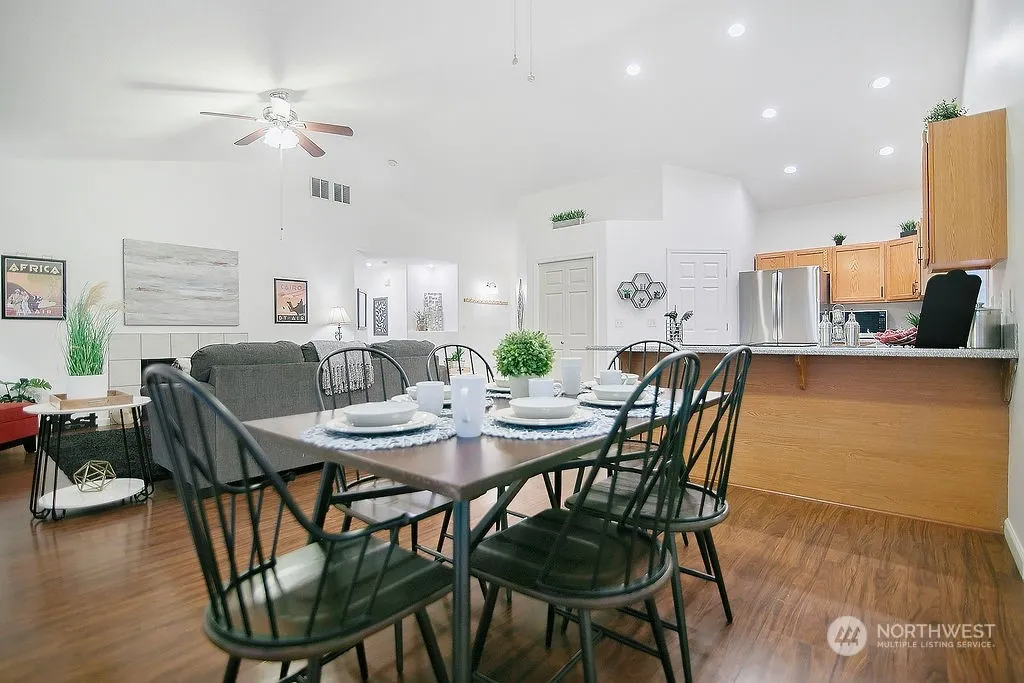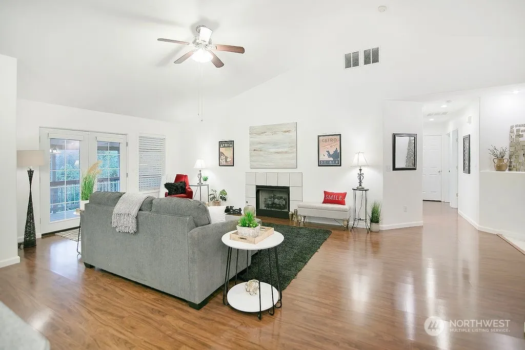 KELSO — 3 Bedroom / 2 Bathroom — 1617 Sqft — 1 Level — Highlander Estates — Living Room w/ Fireplace & French Doors to Covered Deck — Kitchen w/ Stainless Appliances, Pantry & Corian Countertops — Dining Area — Primary Bedroom w/ Bathroom, Walk-in Closet & Access to Covered Deck — Laundry Room — Vaulted — Ceiling Fans — Laminate & Ceramic Flooring — Heat Pump & A/C — HardiPlank Siding — 3 Car Garage — Yard — Garden Space — Firepit — Stand Up Crawl Space w/ Power — Approximately 45 Minutes to Vancouver/PDX — Easy Access to Interstate — Close to Town