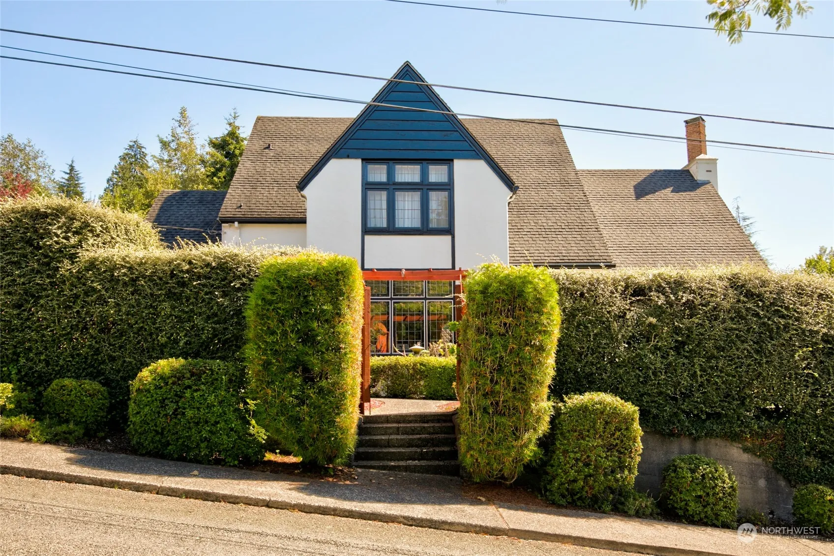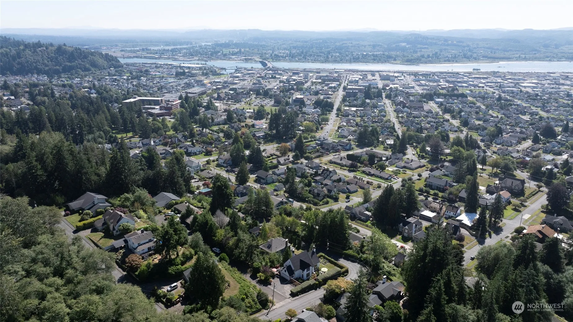 Nestled in Broadway Hill, this historic Tudor home boasts bay, city, and Chehalis River Views. The residence features four bdrms, 2 1/4 baths, hardwood floors, & multi-level flooring. The grand living room is complete with cathedral ceiling, period wood detailing, and an imposing gas fireplace. Leaded glass windows adorn the entire home. The delightful kitchen is equipped with stainless-steel retro ovens and concealed stovetop burners. Mutiple patios, a flat yard, & garden beds enhance the outdoor space. The front is terraced with fragrant lavender, and the property is fully fenced to deter deer, ensuring privacy with a surrounding hedge. Conveniently located close to shopping, parks, and schools. Includes 2-car garage, basement & storage.