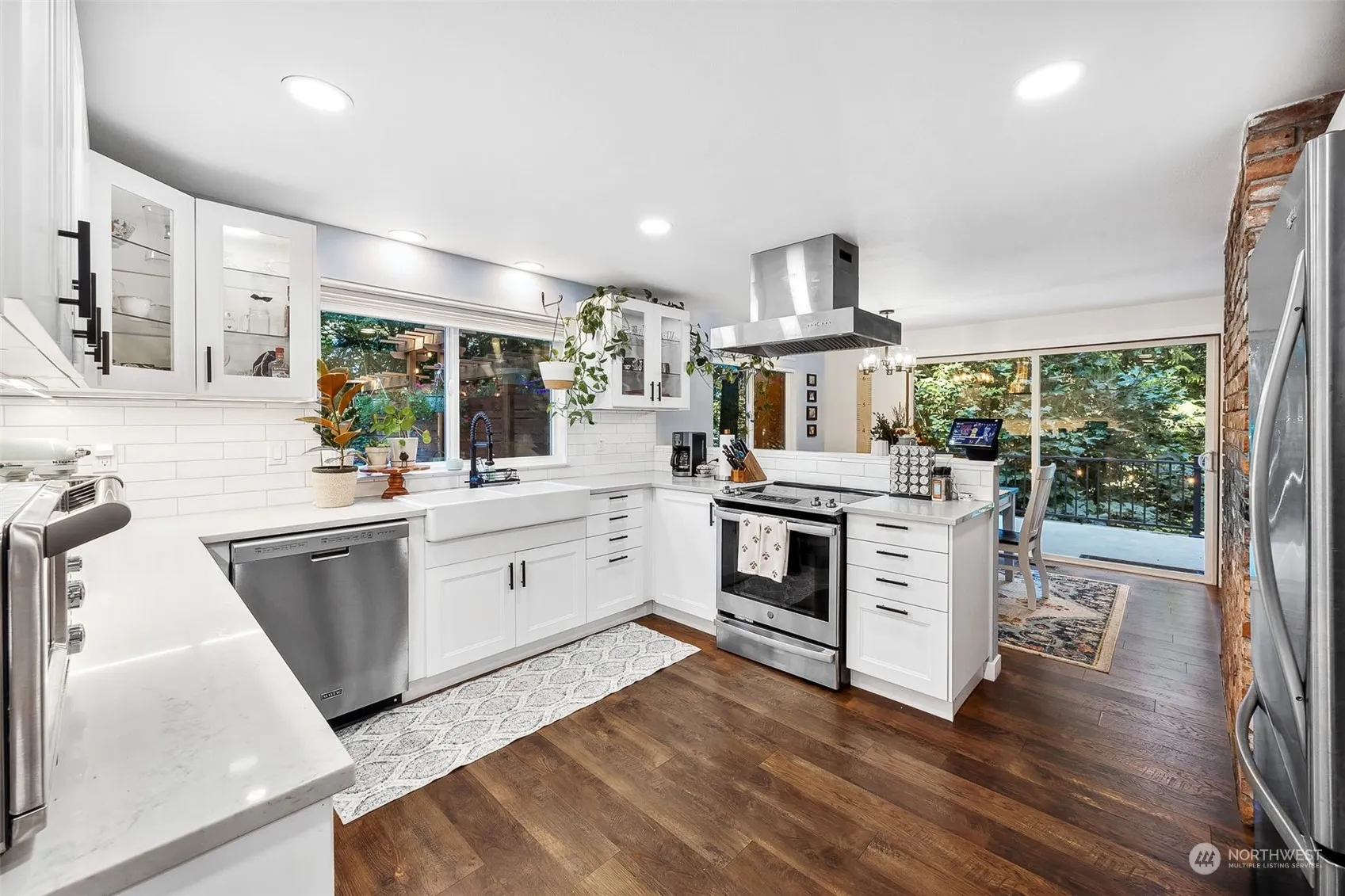 Welcome to your dream home, nestled on a stunning park-like property in Enumclaw! This meticulously maintained home ft. modern upgrades, inc. NEW roof, windows, flooring, & deck. Enjoy a bright, airy layout W/cozy FP W/full-height brick surround. Dining area W/fresh paint! Cook in style W/white shaker cabinets, SS apps, full-height tile bcksplsh, & luxury quartz countertops. The primary suite is a serene retreat W/private deck access, LVP floors, & beautifully designed ¾ bath ft. quartz counters & tile shower! 2 addtl. bdrms & full bath. ALL baths W/heated tile floors! Fully finished bsmt W/extra living space, bdrm & ¾ bath! Expansive deck overlooking breathtaking, fenced grounds W/stream & stunning territorial views.