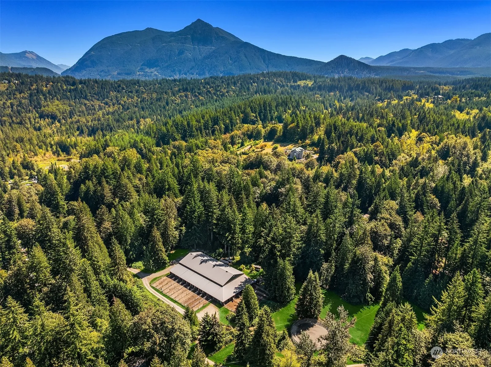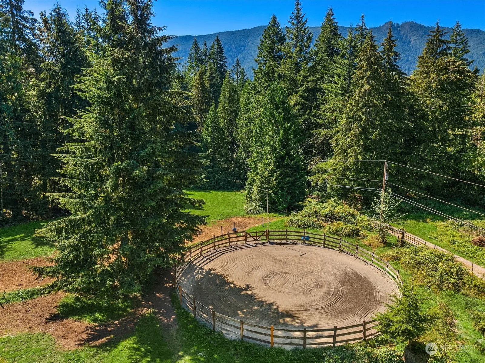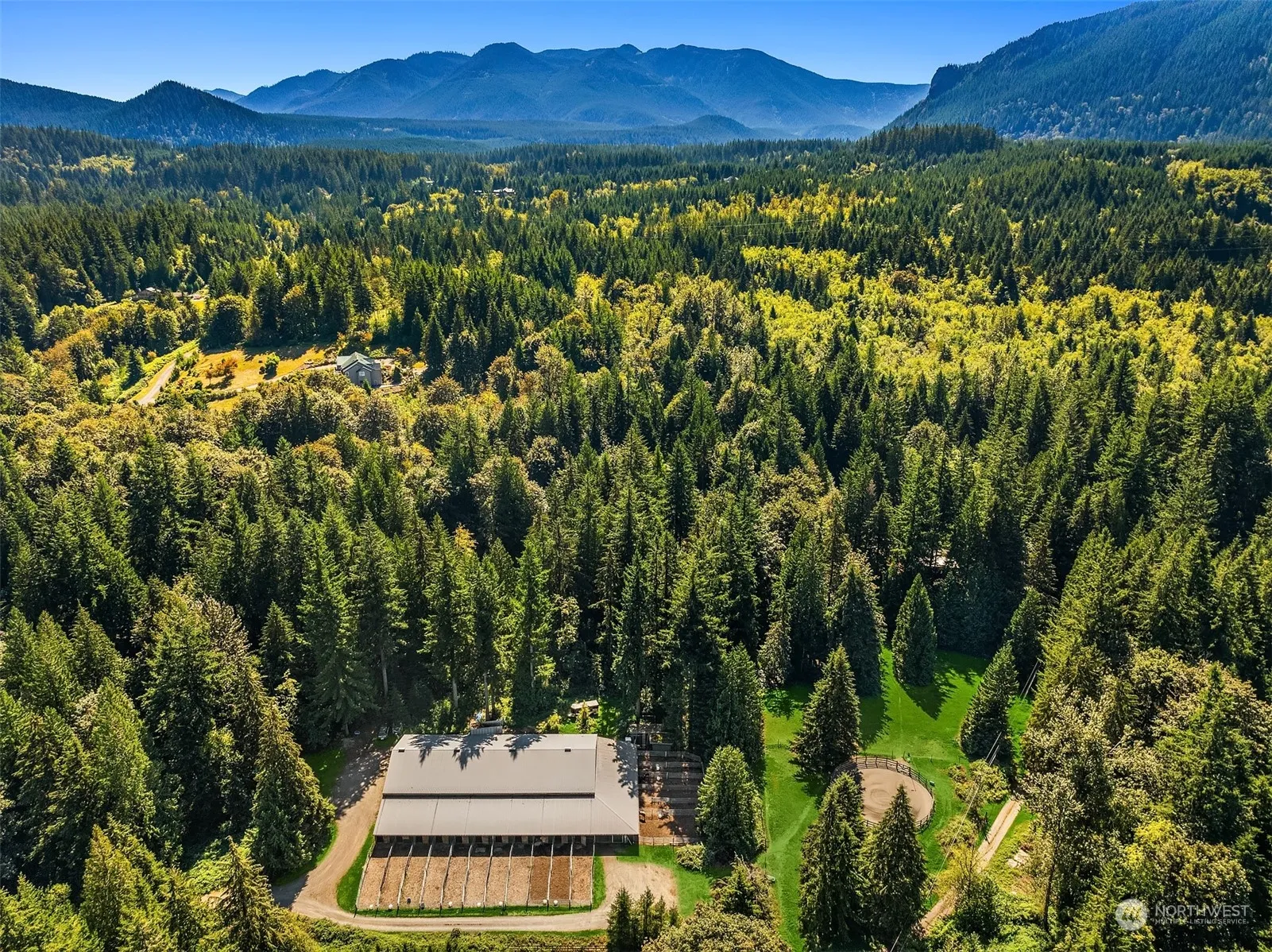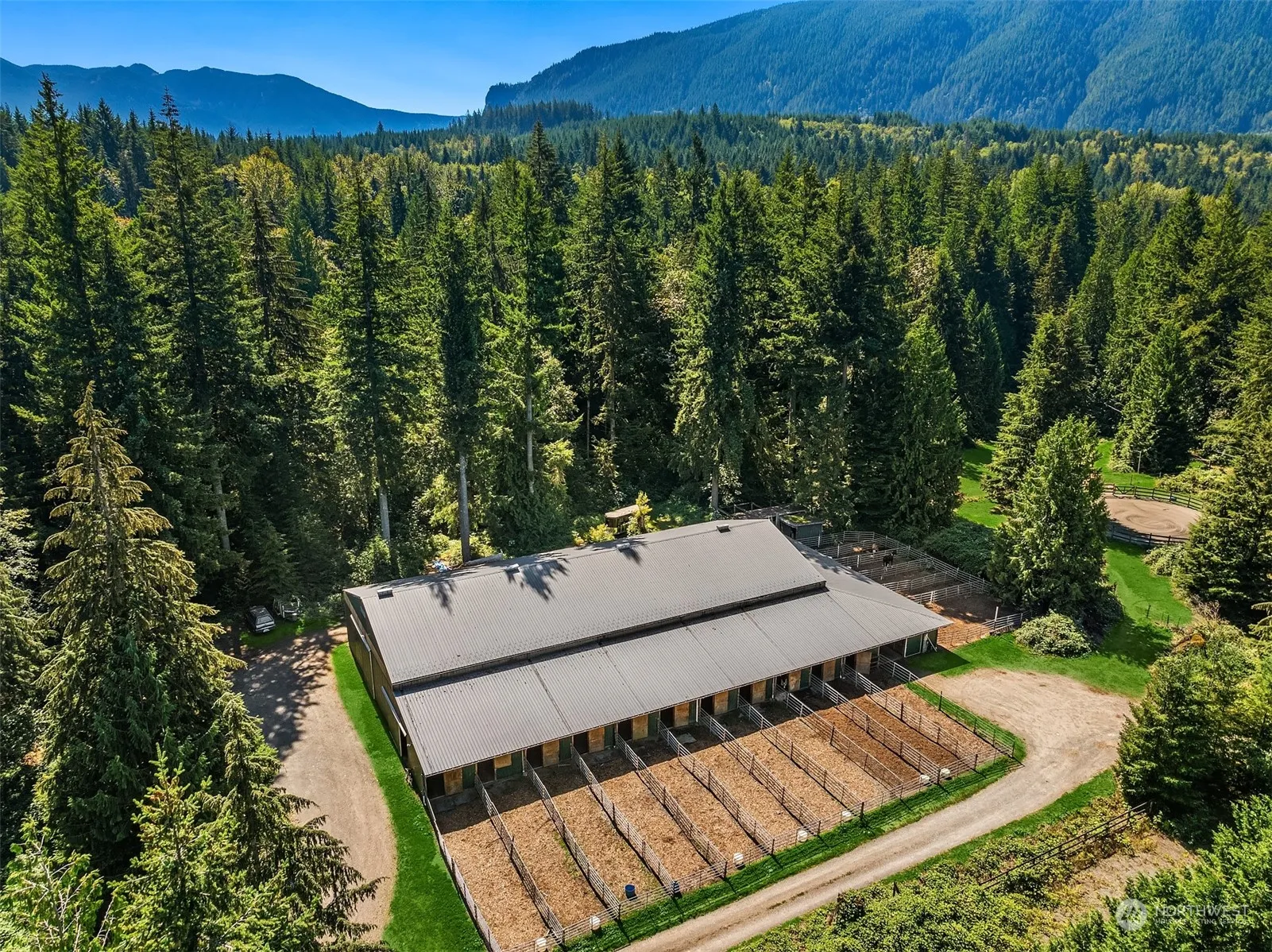 Wildbrook Stables, a rare North Bend opportunity on over 8 private acres. Explore this unique horse property offering an all encompassed 18 stall barn, paddocks off stalls and 60 x 120 indoor arena. The facility offers hot/cold wash rack, 2 tack rooms, viewing room, grain room, two groom bays, round pen and an additional 4 stall barn. Multiple covered parking areas and storage. Reverse floor plan 2 story home nestled onto this gorgeous parklike setting offers 2 updated baths, open room concept on upper level with vaulted wood beamed ceilings. Tranquil Creekside setting, lots of potential here for someone wanting to update and or expand on this tremendous property. Quiet dead end street location! Extra finished rm used as bedroom.