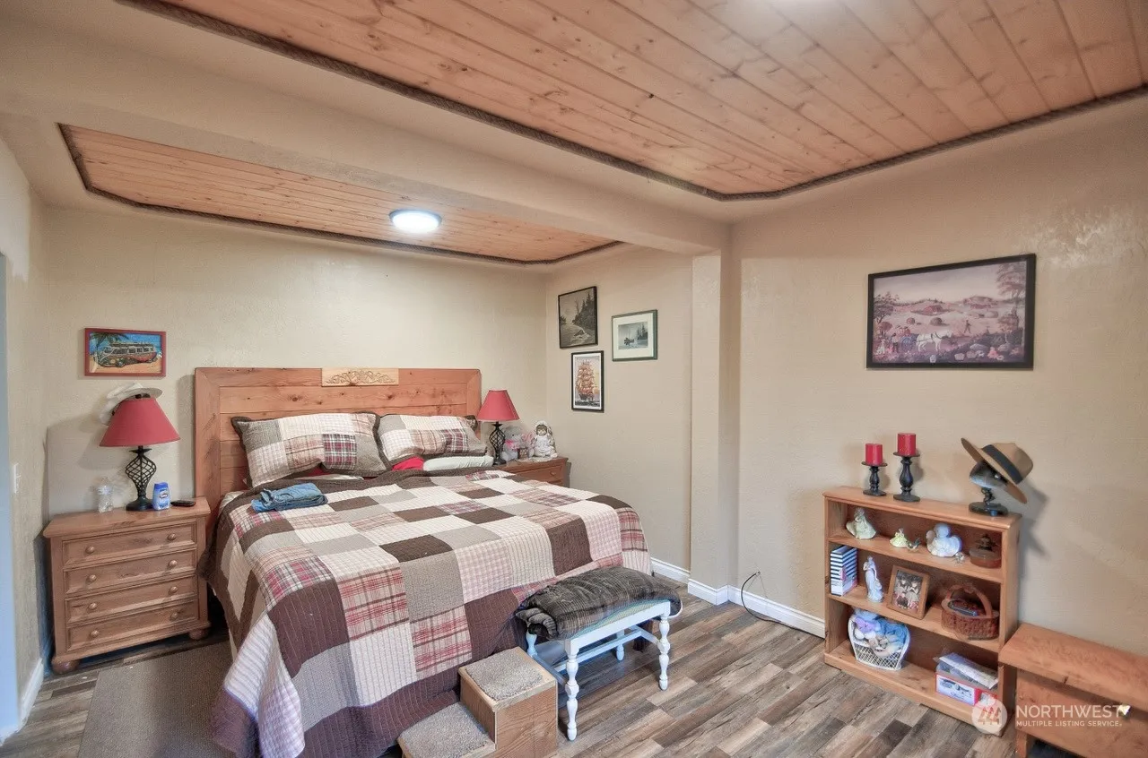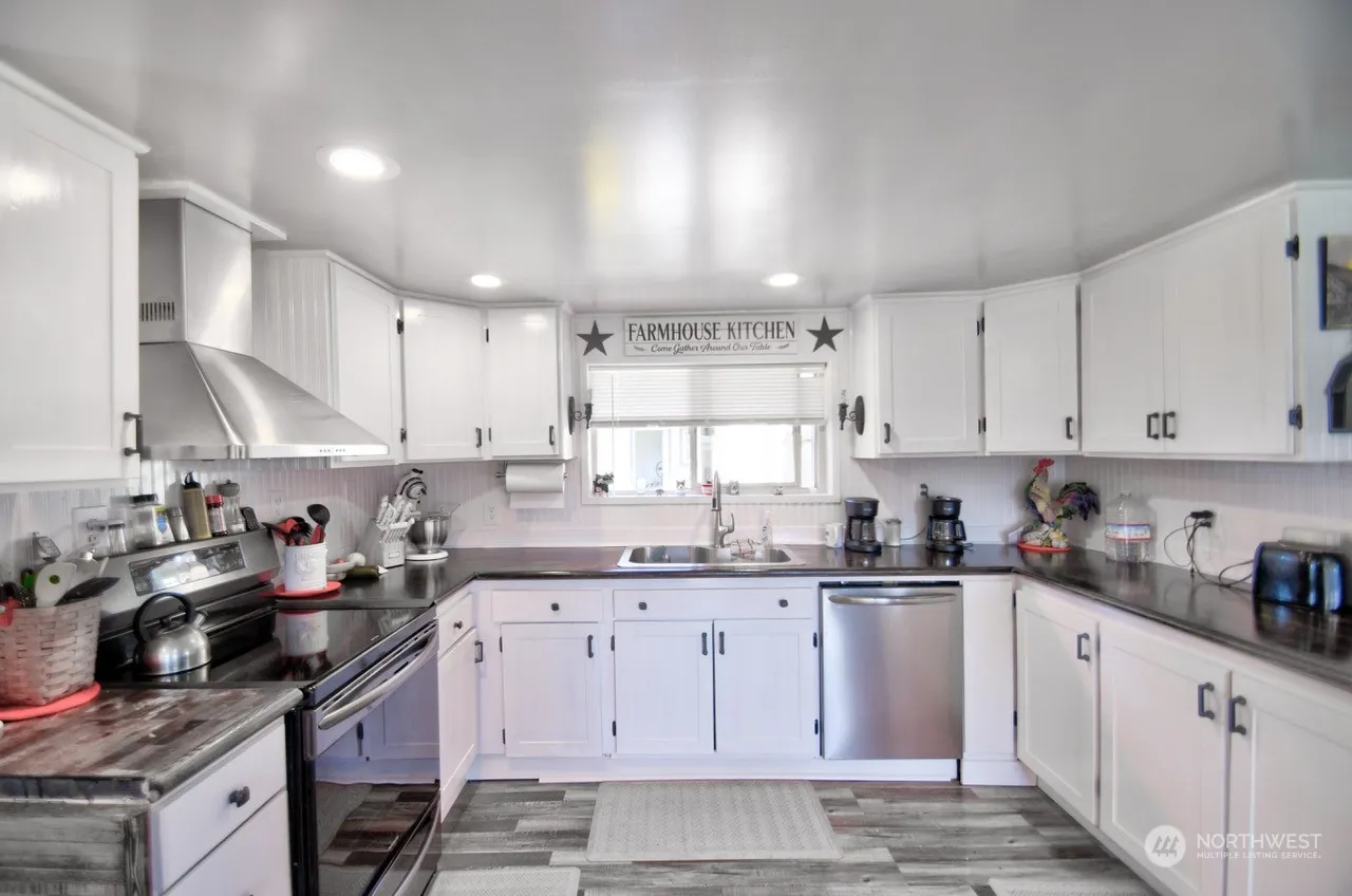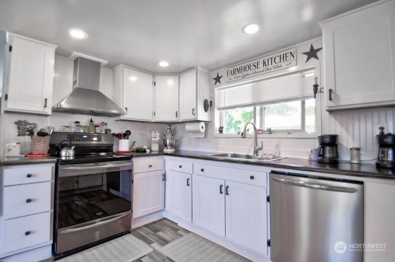 1686 sq ft. 3 bedroom 1 bath, 1.5 story completely updated home. All fenced large county lot. New kitchen with walk in pantry, vaulted ceiling living room, with over head loft that could be an office or family/game room. new flooring thru out, new vinyl windows, hardy plank siding. Multiple out buildings that could be great for garden tools and another nicely finished building, excellent for a craft, hobby, workshop room. 1 car new detached garage with alley access. excellent landscaped back yard with fish pond and a large covered patio for year around entertaining.