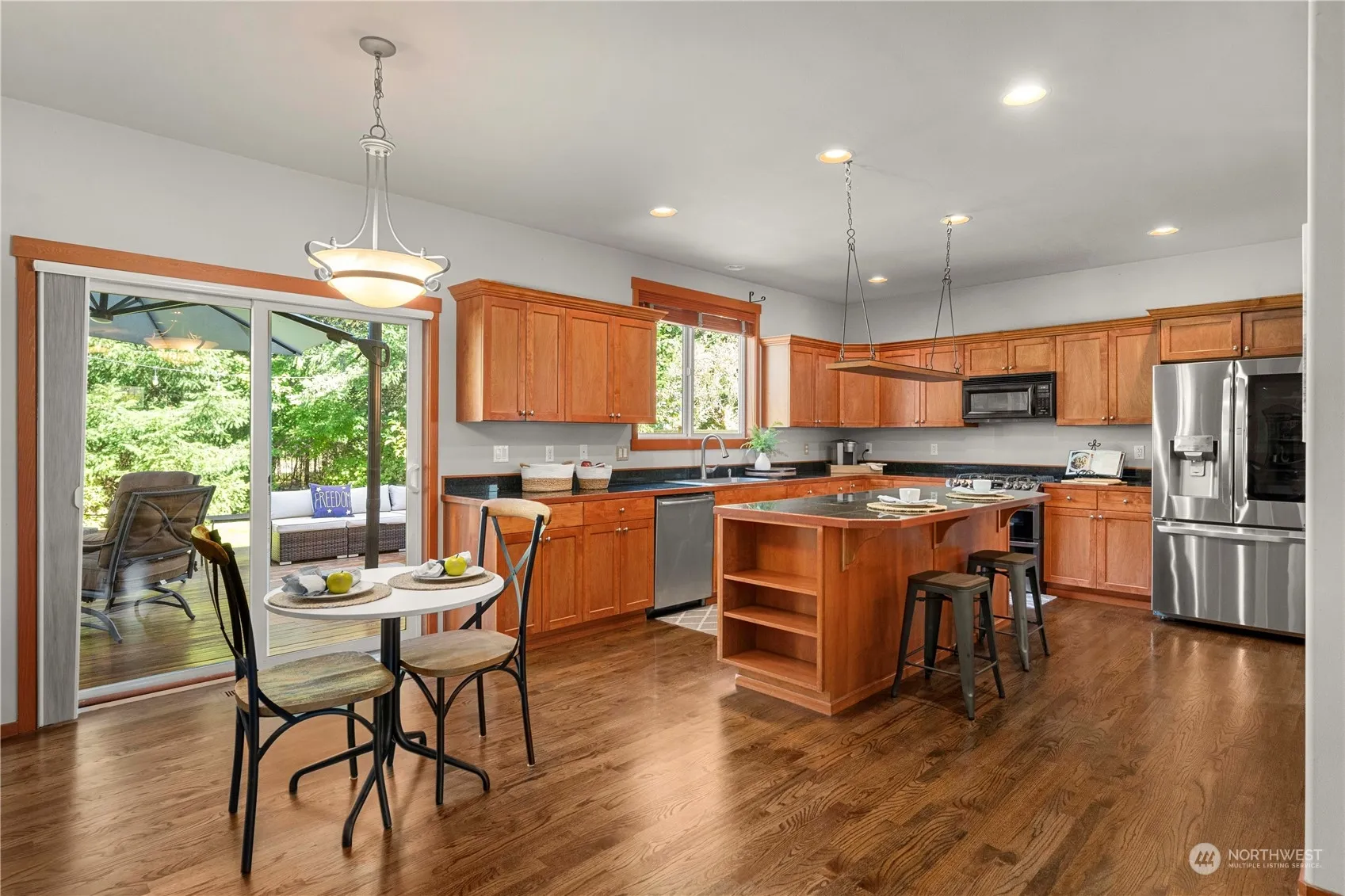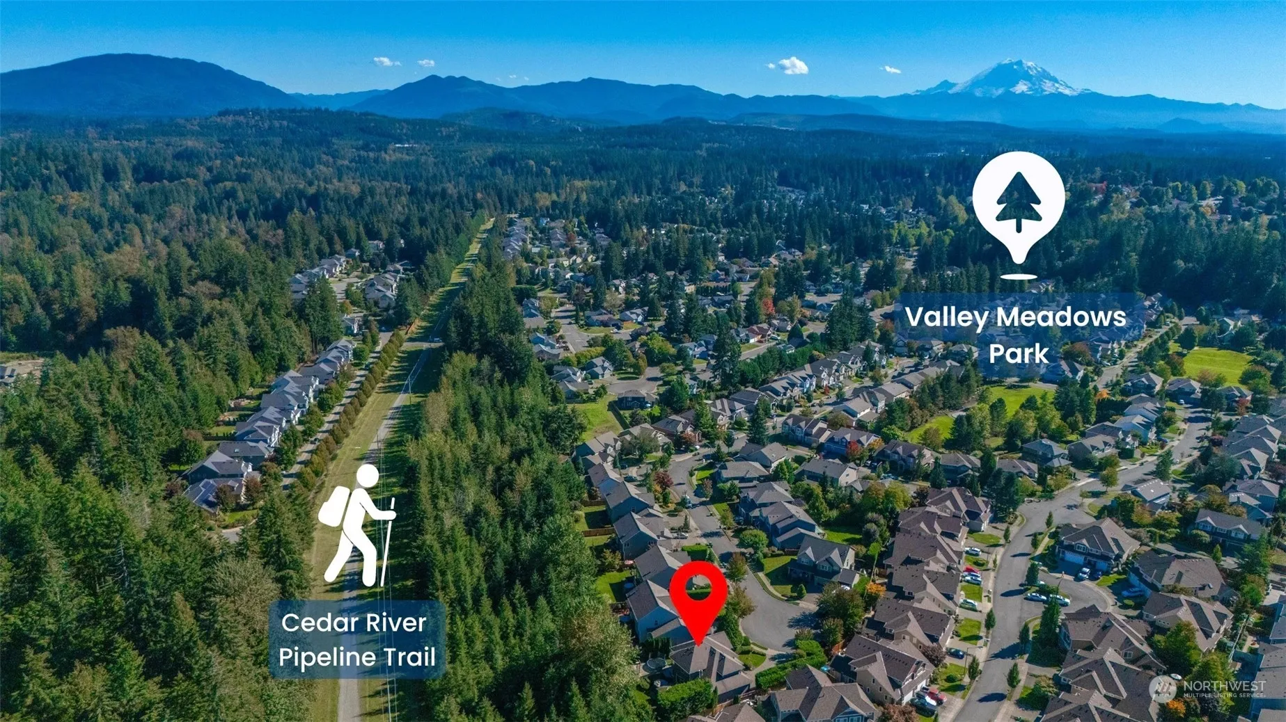 Discover this Valley Meadows gem, perfectly positioned on a prime lot at the end of a cul-de-sac, backing to a tranquil tree line with access to miles of scenic trails. Located in North Maple Valley, this home offers excellent proximity to highways, shops, and more, all within the sought-after Tahoma School District. Built by Curtis Lang, known for quality craftsmanship, this home features an open great room concept with a spacious family room, cozy fireplace, and a gourmet chef’s kitchen with granite counters, hardwood flooring, and a butler’s pantry leading to the dining. The main floor includes a versatile bedroom or office with a full bath. Upstairs, enjoy a bonus room and a luxurious owner’s suite with peaked ceiling. Rare opportunity!
