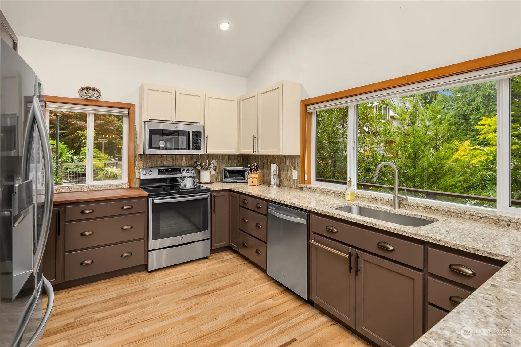 Beautifully maintained and updated home close to Battle Point Park and waterfront trails. Easy one story living with the primary bedroom and remodeled primary bath on the main floor. Vaulted ceilings and large skylights bring in the natural light. The updated kitchen has great prep space, lots of storage and soothing colors. A large deck is easily accessed by sliding glass doors for outdoor entertaining. The lower level greets you with a large family room in the center of the floor plan, with 2 bedrooms, one on either side. A large laundry room and tastefully remodeled 3/4 bath, plus more storage. The landscaping is delightful as well as easy maintenance. Don’t miss the large fenced side yard with lounge area and fire pit.