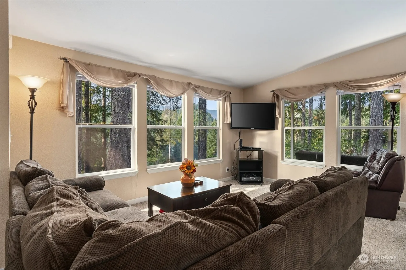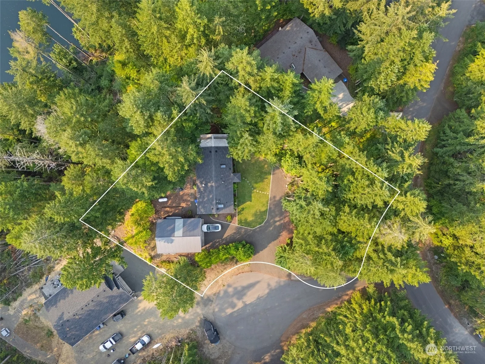 Imagine stepping out onto your covered deck in the morning, having coffee and a glorious view of Lake Kokanee. That is every morning in this special Lake Cushman home with two bedrooms, open kitchen, dining, and livingroom. Newer stainless appliances and a heat pump/AC unit are a bonus. Keep warm in front of the double sided fireplace between living rm and primary. Detached two car garage is huge with fully insulated shop.Guests will love to bring their RVs. Full hook up is in the driveway. A beautiful flat lawn greets you when you drive up.The extra lot in the front of the property is a wonderful privacy buffer.Home is two minutes from the golf course and pickleball/tennis cts.Close to boat launch on Cushman, Kokanee,Hoodsport, shopping