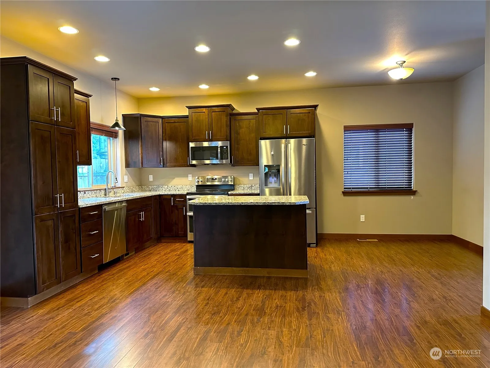 Home is the “Madrona Model” featuring a large master bedroom, 5 piece master bath and walk in closet, 3 guest bedrooms, and laundry all up. Upgrades when built included 9ft ceilings on the 1st floor, additional pantry cabinet, comfort height toilets, slab granite kitchen counters, chocolate cherry cabinets and stainless steel appliances, laminate flooring in living room and large family which has a gas fireplace with tile accent, upgraded carpet pad and some faux wood window blinds. The home has low maintenance cement plank exterior siding with exterior stone accent, air conditioning and a 95% efficient gas furnace. Front yard landscaped and the back yard is fully fenced with a nice sized patio.