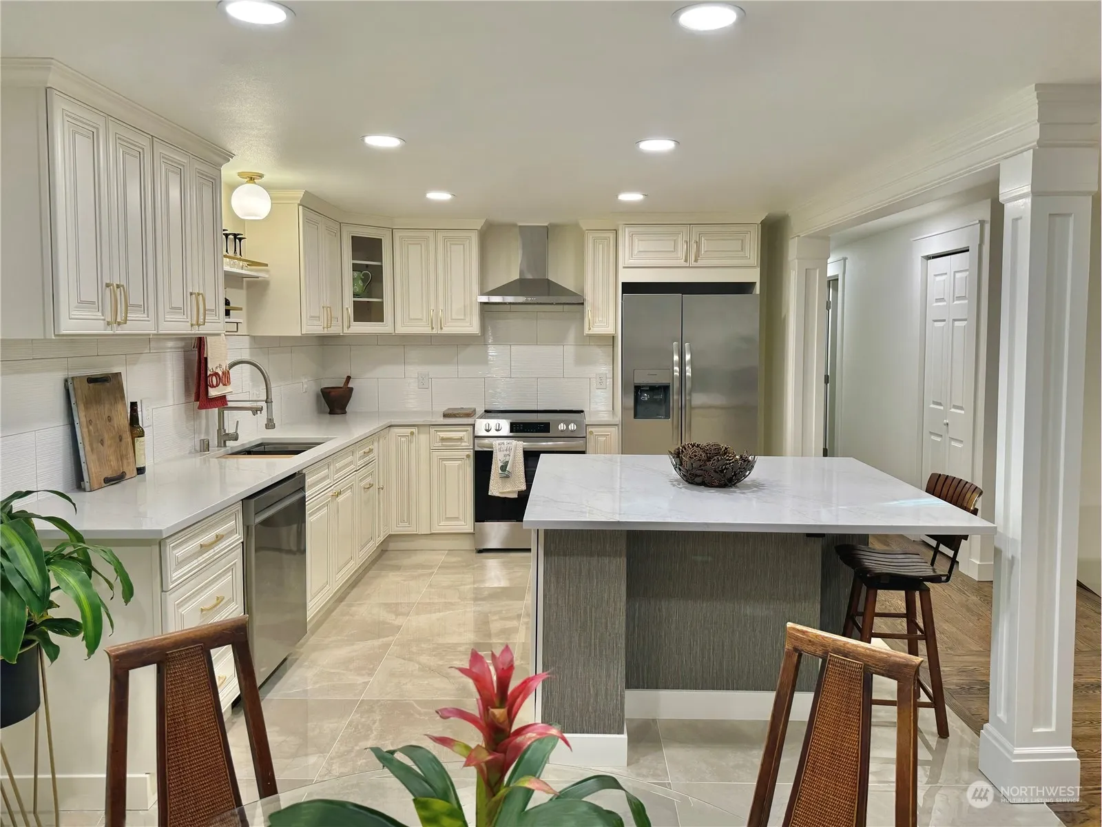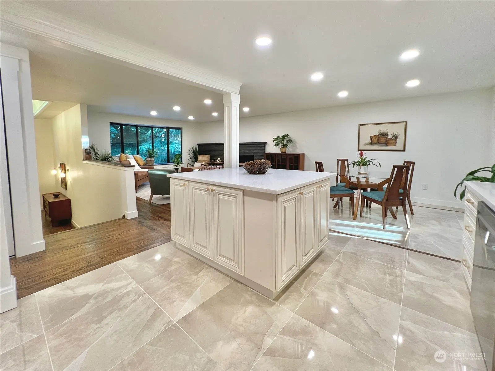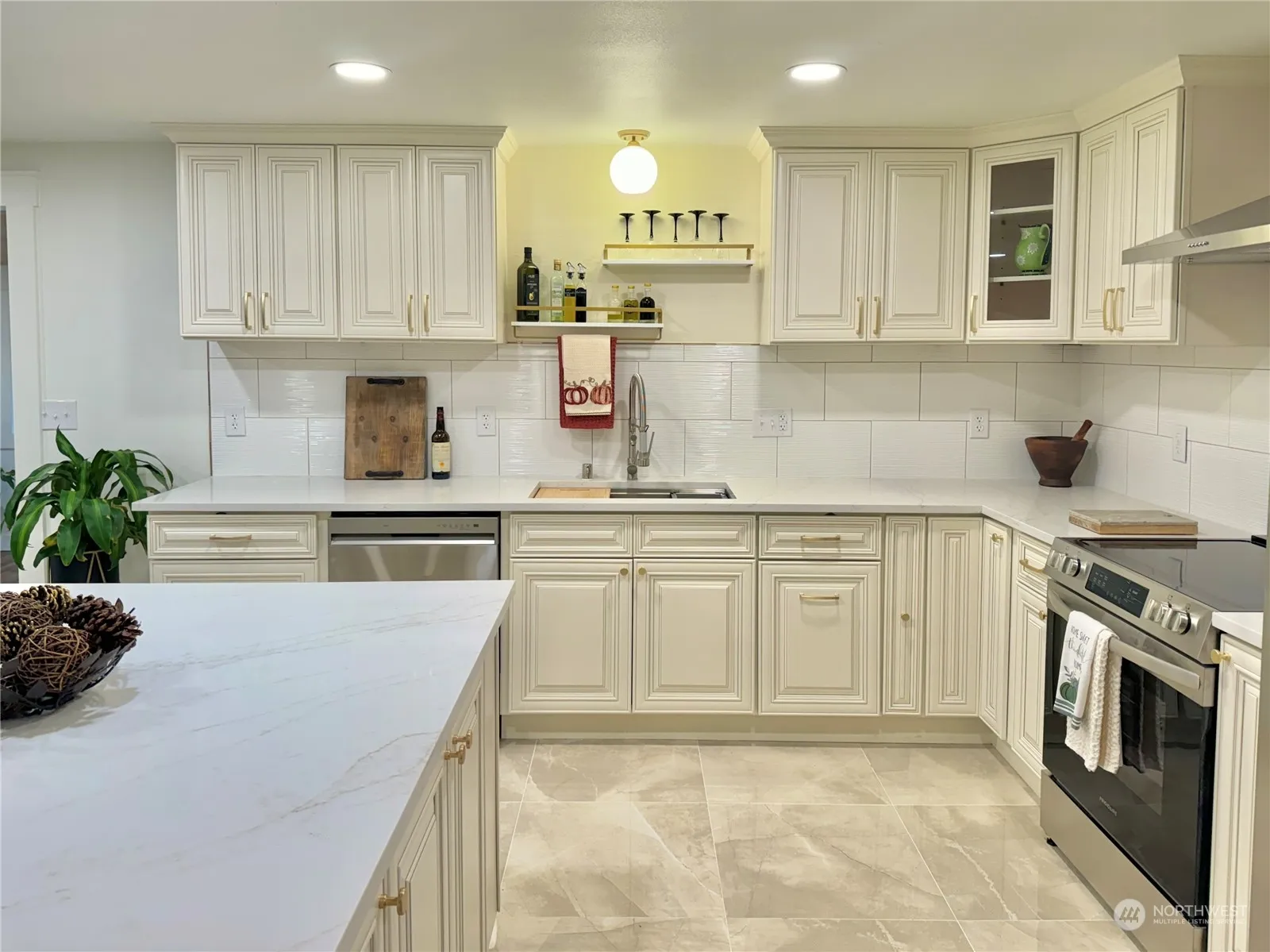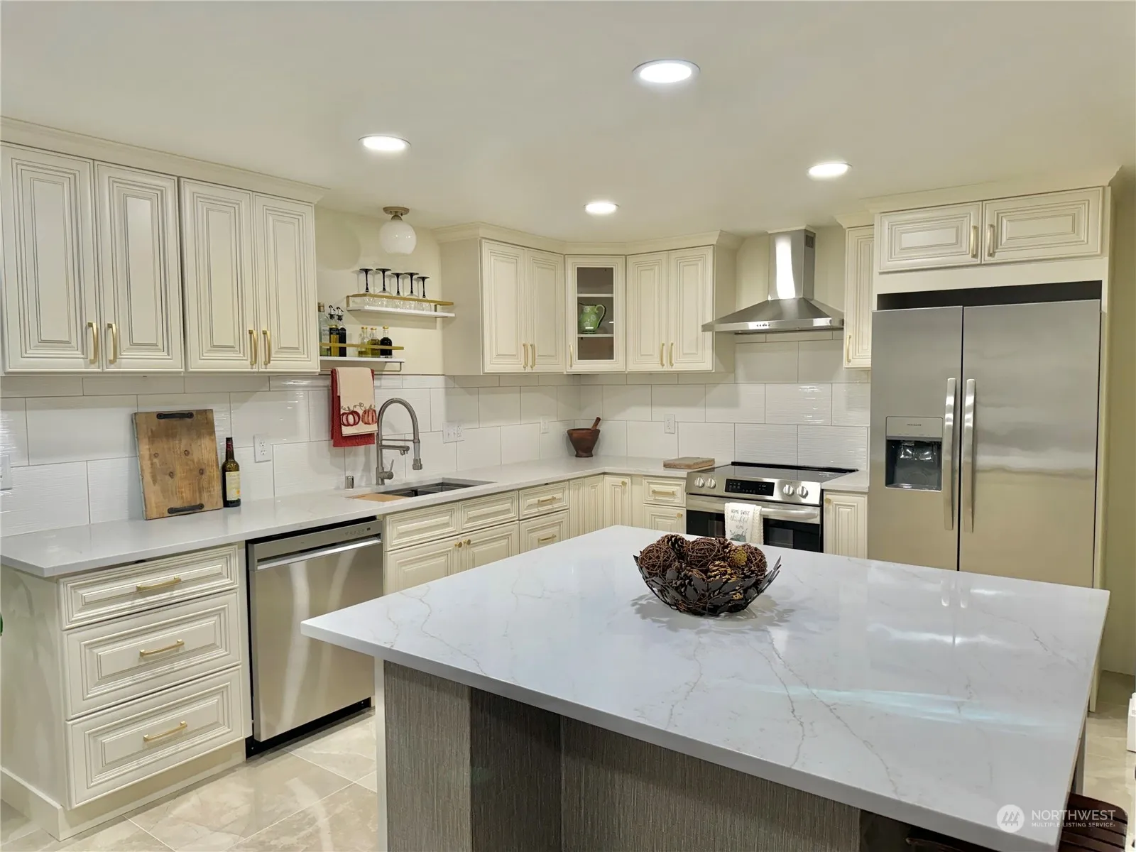 Showstopper! 4 Bedrooms, 4 Bathrooms, 2 Kitchens, 2 Laundry Rooms, 2 Primary Bedrooms, & 2 Garages on 0.52 acres. Masterfully remodeled inside & out. Spacious kitchen w/ quartz countertops, porcelain tile floors, & large island. Living rm w/ fireplace & hardwood floors. Primary bdrms on main & lower levels feature walk-in closets & en suite baths w/ heated tile floors. Laundry on main & lower levels. Great room w/ kitchenette on lower level plus primary bdrm w/ sliding glass door to covered patio w/ tongue & groove walls/ceiling. New windows, new roof, new heat pump w/ AC, & so much more! Open concept layout w/ multi-generational living possibilities. Both garages are each attached 2-car. Lot of storage & parking. Close to Lake Sawyer.