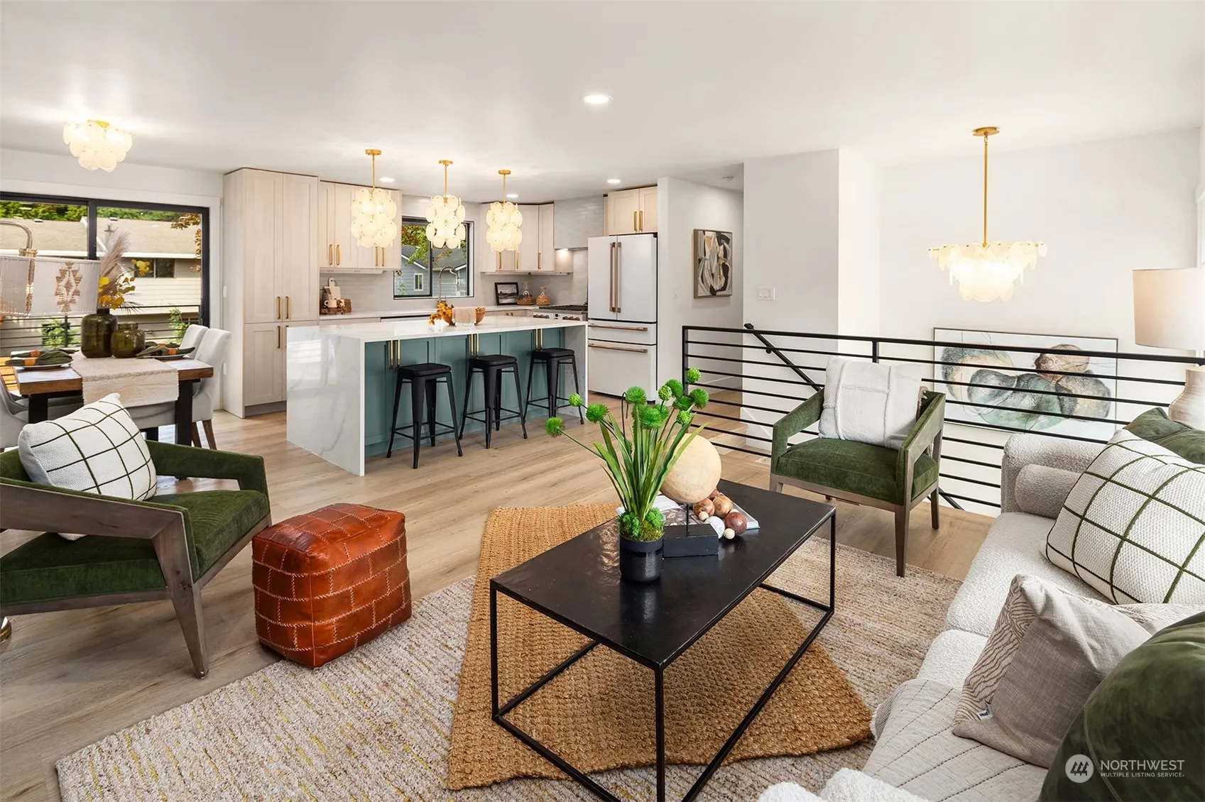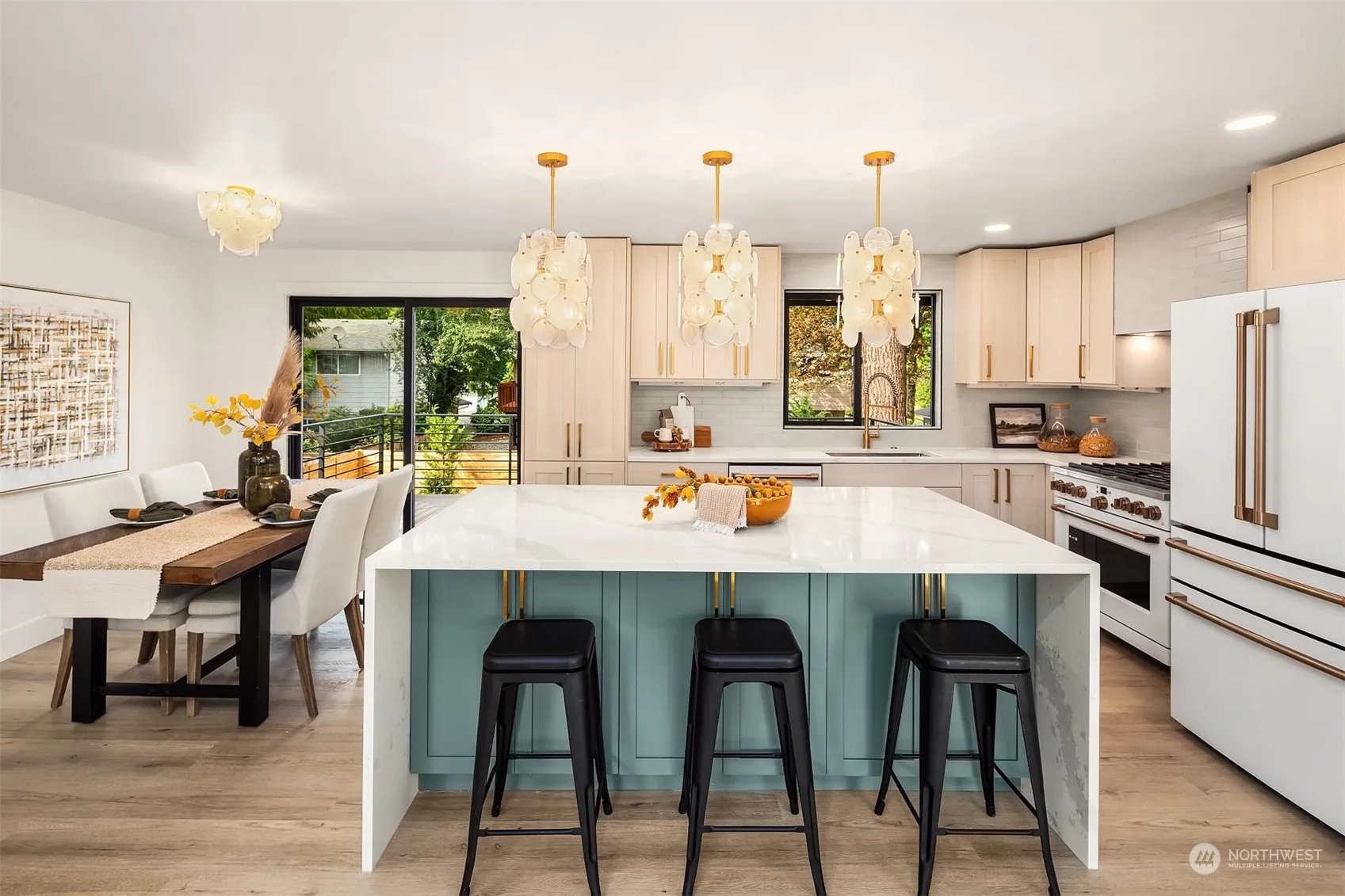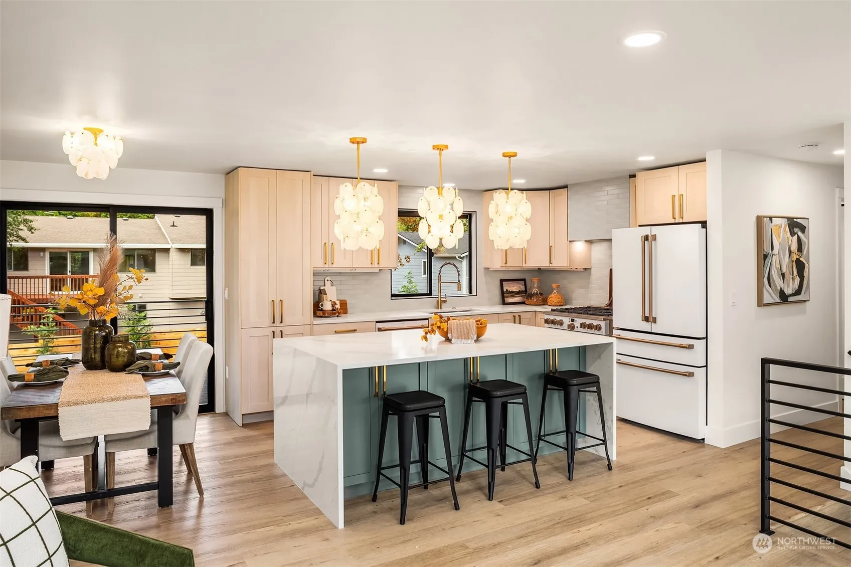Elegant and elevated redesign, striking blend of modern and approachable warmth. Oversized custom front door welcomes you to airy vaulted living space with wall of windows, inviting natural light with unparalleled flow. Opulent champagne fixtures throughout, high end Café appliances, and dramatic lighting. Primary with attached spa level en-suite beckons you to relax and unwind. Notable upgrades include flattened wall texture, new paint throughout, luxury vinyl plank flooring, custom tile and cabinetry. Grand Azek deck opens from eat-in kitchen to fully landscaped large private lot for those who love an outdoor soiree. Centrally located cul-de-sac within established community, prime access to local retail, amenities and main arterials.