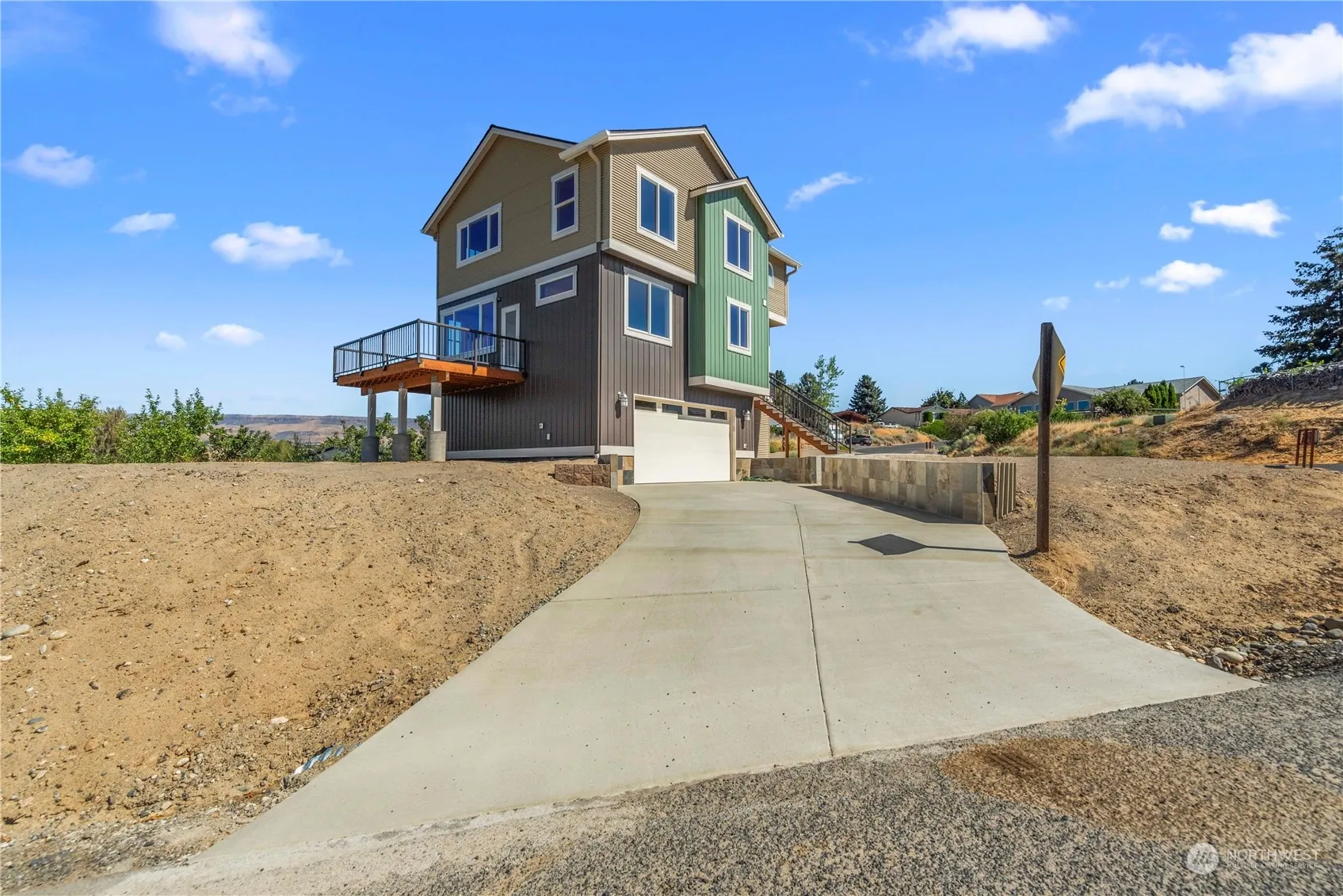 Superb new view house in Malaga. This unique 3 story home will dazzle with extensive tile floors, granite counter tops, open floor plan, vaulted ceiling, laminate floors upstairs (no carpet in the house) and ceiling fans. The builder stepped out of the box and used all metal siding, trex decking and railing for extremely low maintenance living. There is nothing like this home on the market with privacy and views of the valley, mountains and river. Enjoy the city lights in the evening on the 10′ x 16′ elevated deck. Views from all rooms in this home will surprise. This lot has a nice level front yard area. The driveway has an added slate wall for style. This Three Lakes development has community waterfront and pool. See it soon.