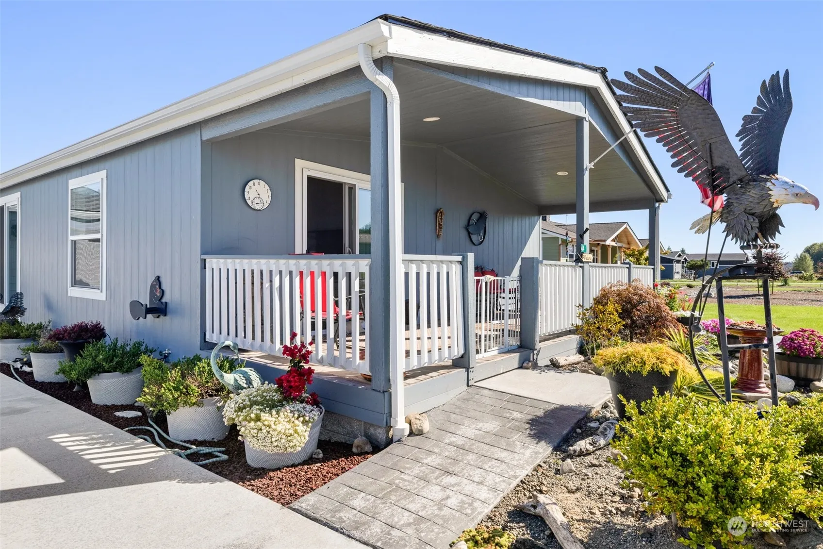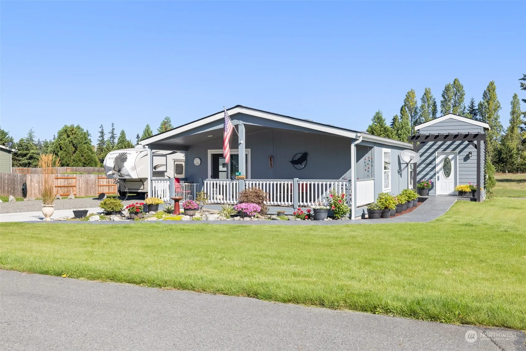 This delightful recently constructed manufactured home is finessed to a “T”. It’s in immaculate condition, complimented with a comfy patio area to the rear, a greenhouse and a separate out building for storage or hobbies. The neighborhood is a quiet cul-de-sac with friendly neighbors. This home has two bedrooms and an office. The east side is a well manicured lawn. The west side has double garage with a RV area that can accommodate a 38-40′ RV that includes water, 50 amp power and a dump! A large gravel area for additional vehicles is on the West side. Be sure and include this one in your search for a new home. Come and see, you’ll want it.