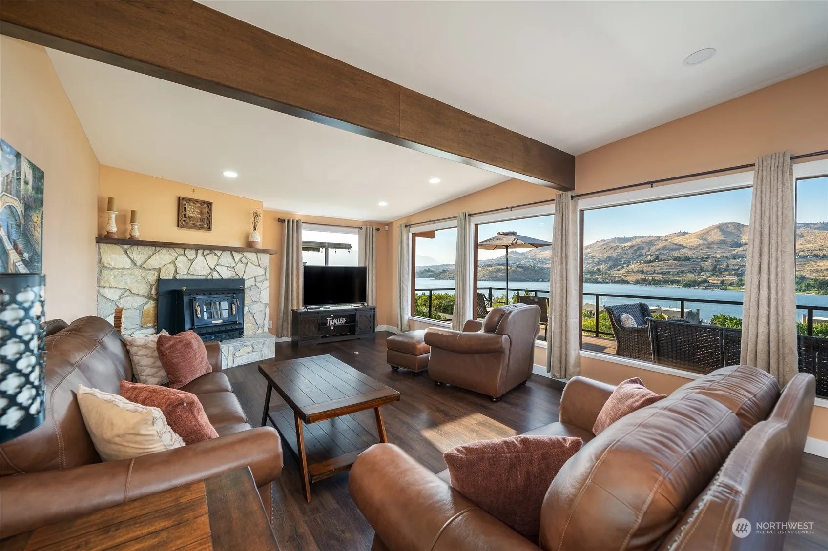 Motivated seller considering all offers! Set on a quiet street with just a short walk to downtown, wineries, & the lake, this beautiful home blends modern amenities with natural beauty – perfect for indoor/outdoor living. Incredible panoramic Lake Chelan & mountain views from every vantage point. Take in all the views on the sprawling wrap-around deck. Spacious fenced backyard oasis boasts private pool & hot tub, expansive patio, & manicured landscaping. Complete remodel inside & out with high-end finishes including luxury plank floors, exquisite tile & millwork, granite counters, island kitchen, 5-piece bath, large picture windows, cabinetry & doors, AC, furnace, heat pump, & appliances. Deep 2-car garage & plenty of storage. No HOA.