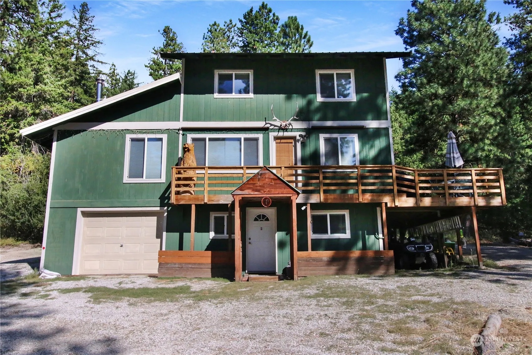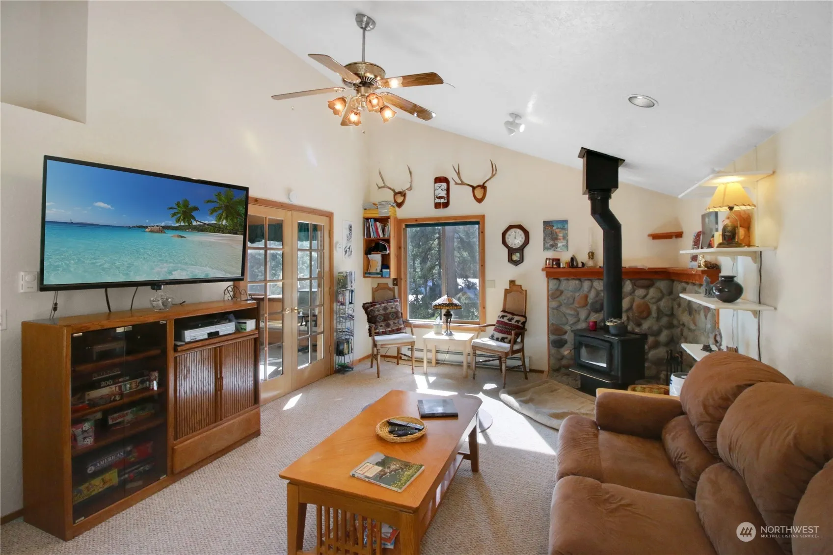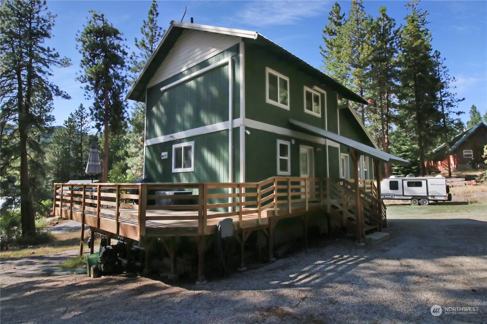 Welcome to your dream retreat in the heart of the Ponderosa Pines Community! This charming 3-bedroom, 2-bathroom cabin offers a unique opportunity with two lots, providing extra space for your RV, trailer, boat, or any outdoor toys. Step inside to a cozy living room featuring a wood-burning fireplace and beautiful french doors that open up to the dining and kitchen areas, perfect for entertaining. The finished basement offers additional living space with a bedroom and bathroom, ideal for guests or a private retreat. Enjoy the comfort of a brand-new mini-split system, ensuring year-round comfort. The property also boasts a newly installed French drain along the driveway, adding peace of mind during wet seasons.