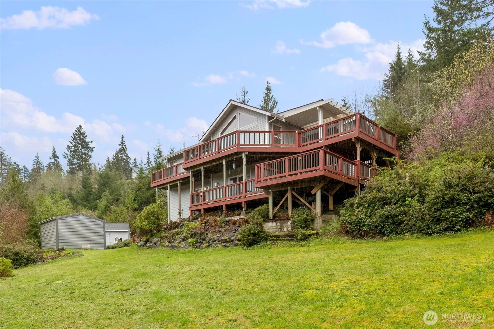 Exceptionally cared for home on 2.5 fully fenced acres! Vaulted ceilings and real hardwoods highlight the bright living room, which opens to a large deck with mountain views, ideal for entertaining. The kitchen features granite counters, stainless steel appliances, and a propane cooktop. The primary suite offers a soaking tub, while the lower level provides space for a second suite or multi-gen living. Recent updates: new roof, furnace, heat pump, and tankless water heater. Enjoy a 2-car garage, storage shed, RV hookups w/50-amp service, and generator wiring. Just 10 minutes to Alderbrook Resort and Hood Canal!
