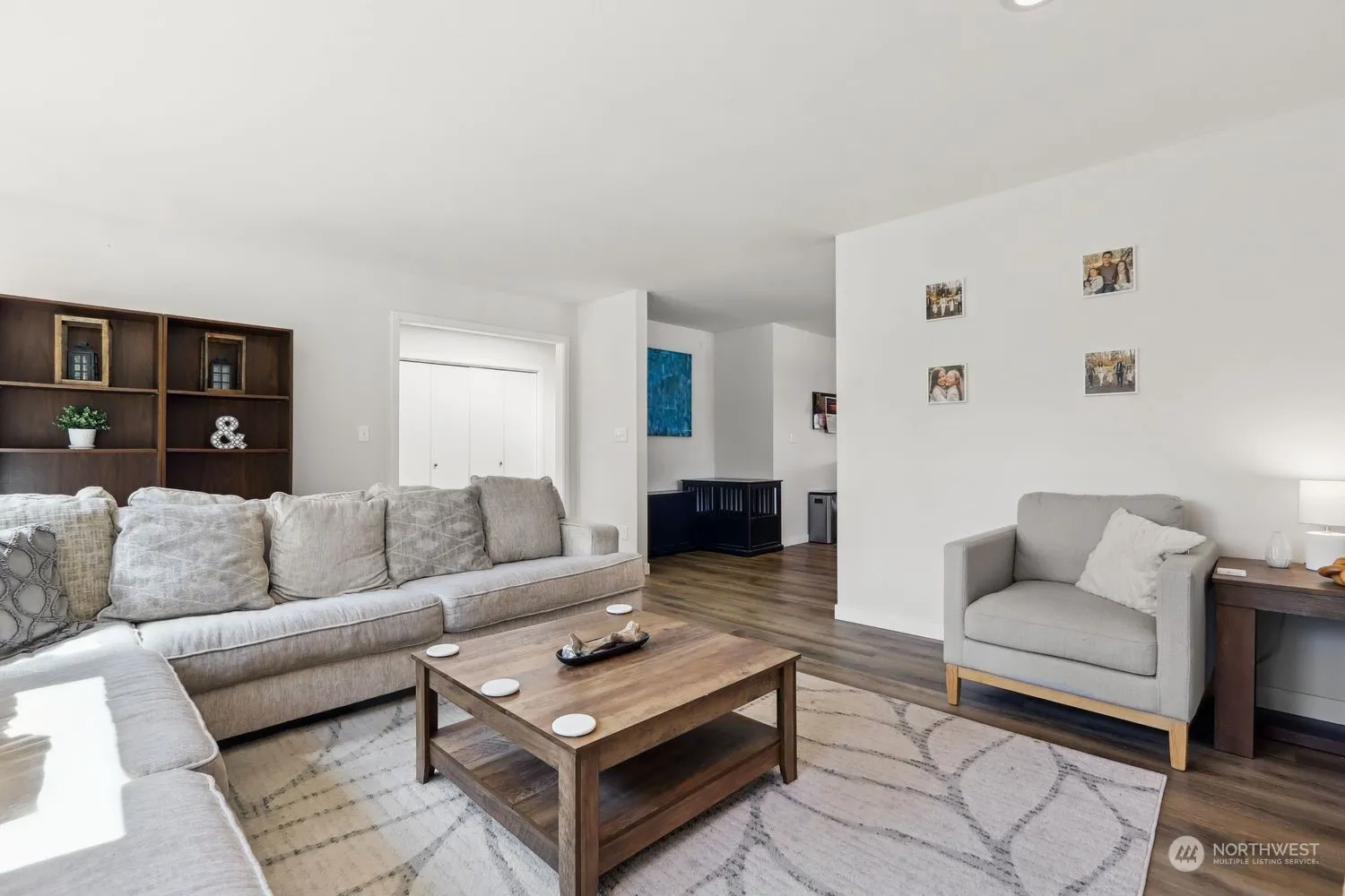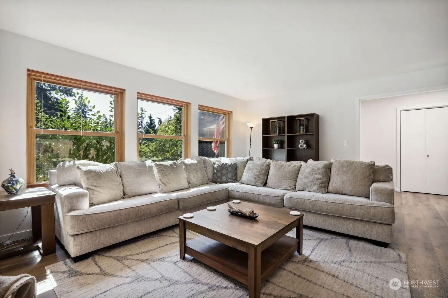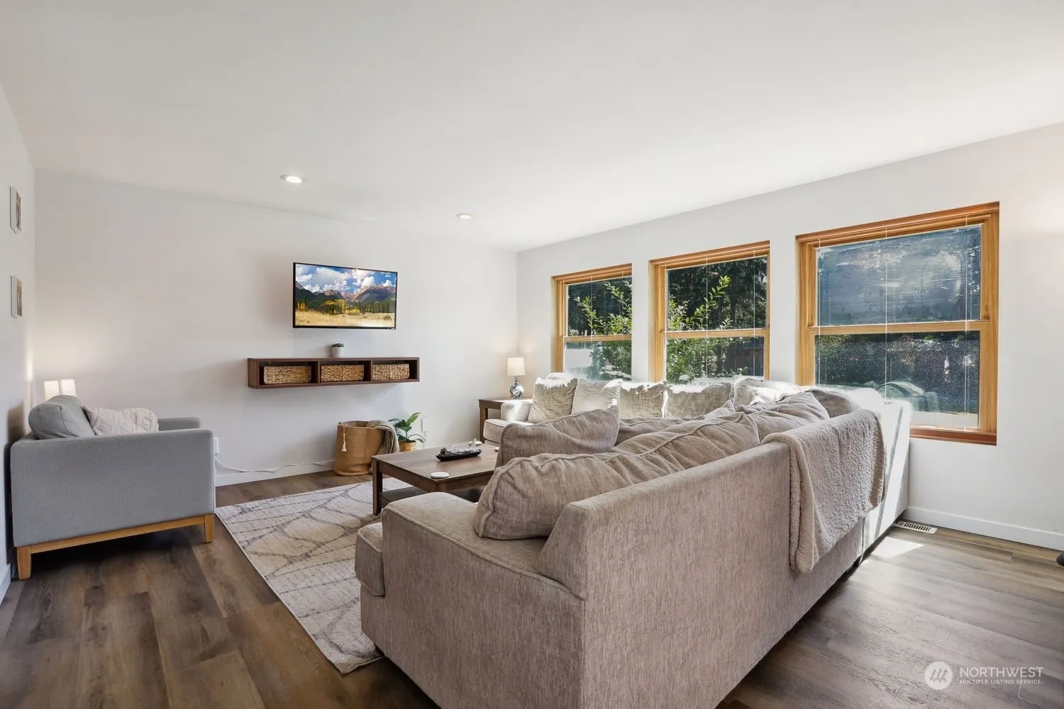 Charming & spacious rambler! This delightful home features 3 bedrooms, 1.75 bathrooms, a 2-car garage w/ electric car charger, & a generously sized fenced yard. It boasts new flooring, updated kitchen, a metal shingle roof & an efficient heat pump/AC system. The inviting floor plan includes a living room, family room, & dining room. Perfect for summer gatherings, the expansive backyard offers ample space for BBQs & large garden space w/ fruit trees. Plenty of parking for all your toys! Lost Lake community enhances the appeal w/ a clubhouse, a private lake stocked w/ trout, an island picnic area, & walking trails. Enjoy nearby state park beaches, golfing, & shopping. Experience the best of island living without a ferry ride right here!