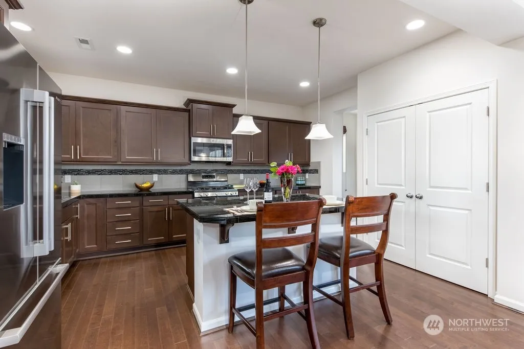 Welcome to this beautiful Cedars Falls home in a prime North Bend location w/ easy access to downtown. Enjoy Mt. Si Views, covered tongue & groove porch, meticulously maintained fully fenced yard w/ new turf & mature landscaping. Inside boasts- open concept floor plan w/ Great room, chef’s kitchen w/ breakfast bar, cozy gas fire place for those cool Fall nights, expansive primary bedroom w/ oversize walk in closet & ensuite bath. Upgrades include- New premium carpet, new (led) lighting throughout, UV window treatments/antiglare on the backside of the home, new exterior paint, insulated garage & central AC. The Cedar Falls Neighborhood has sidewalks throughout, parks, easy access path to OES Elementary & close to I-90, river, & more.