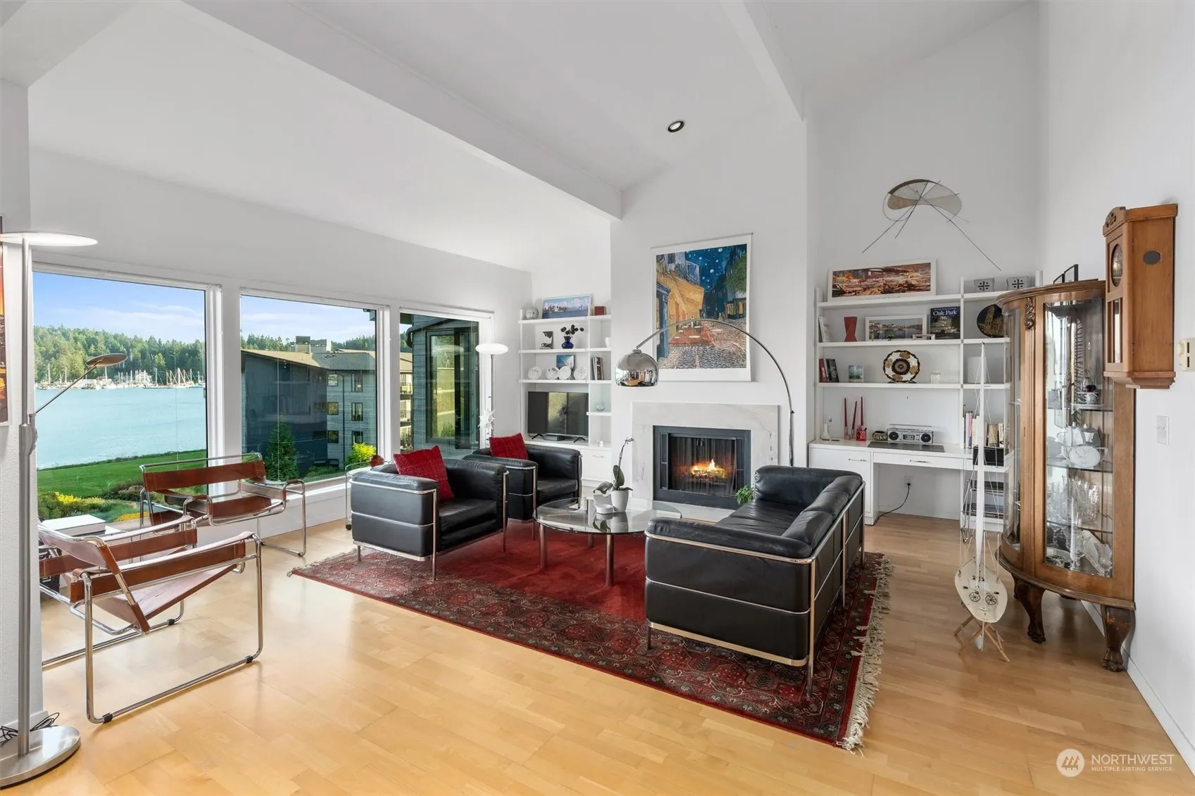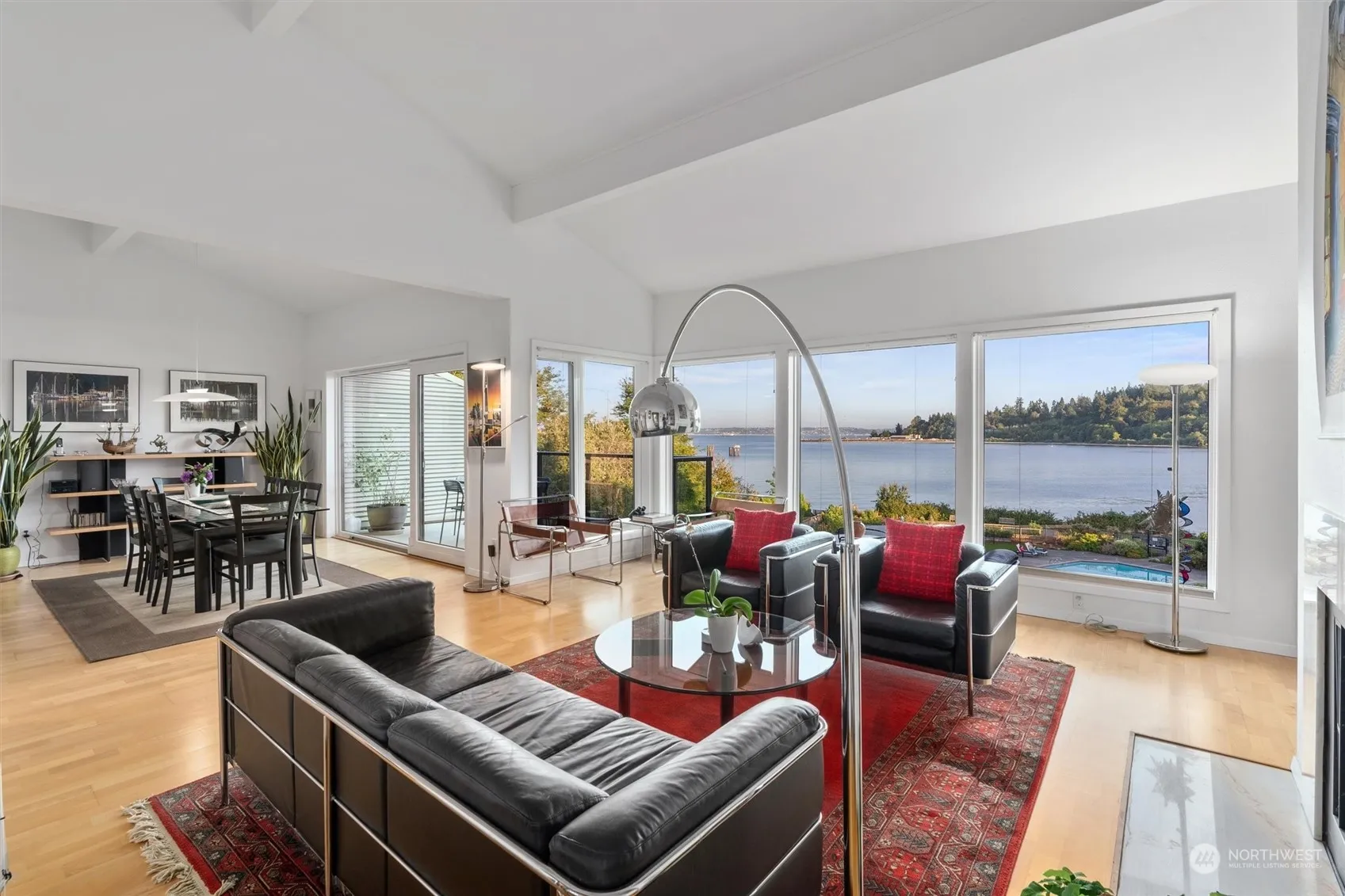 Welcome home to an ideally located, beautiful waterfront community w/extraordinary views of Eagle Harbor, Puget Sound & the Cascade Mountains. Steps to the ferry, Winslow & so much more. Walk through the vibrantly landscaped grounds or lounge poolside w/a heated pool & spa. This incredible top floor luxury condo boasts vaulted ceilings, skylights, a fireplace, & a sizable deck w/sweeping waterfront views. Sunlight pours in throughout this unit w/a wall of south facing floor to ceiling windows. The large primary suite has a balcony & great closet space. The guest bedroom/office is nicely sized. The kitchen, living and dining room soak in the views. A well executed kitchen bar functions perfectly. Your invitation to convenience & easy living!