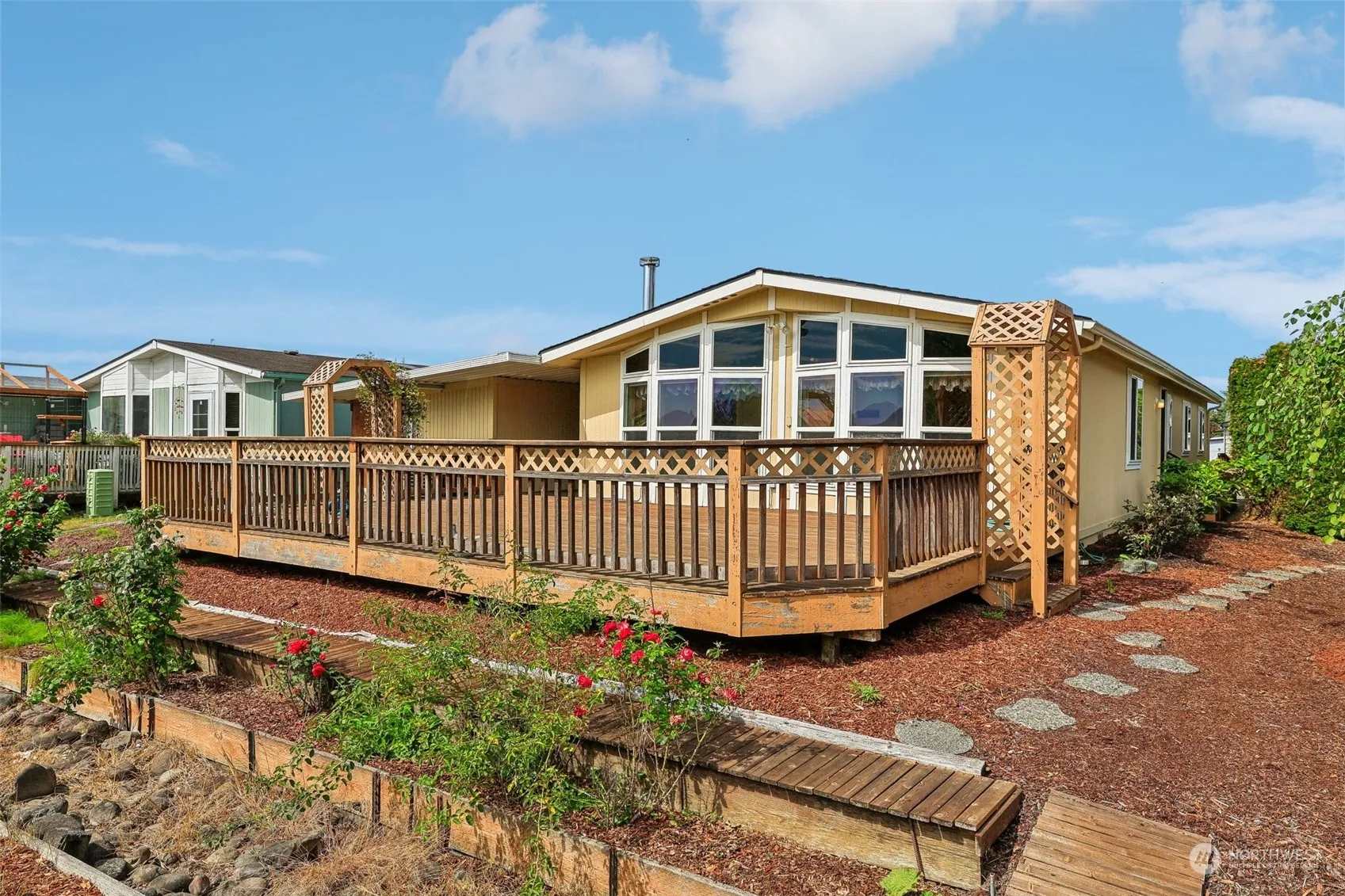 Wake up to sunshine and unobstructed views of Mt. Rainer while enjoying your morning coffee. This AGE RESTRICTED 55+ community of Mountain View Estates is a retirement oasis. Enter your well kept home, with very few stairs, featuring two large bedrooms and two bathrooms with multiple entertaining spaces with A/C. For those who love to travel, the community offers RV storage for rent, along with 3 undercover parking spaces on your lot. A large shed with a garage door provides ample storage or workspace. Gardening enthusiasts will be thrilled with the numerous sun-filled flower beds, home to several varieties of roses. And best of all, you can bring up to two of your furry companions to share in this tranquil retreat. Virtually Staged.