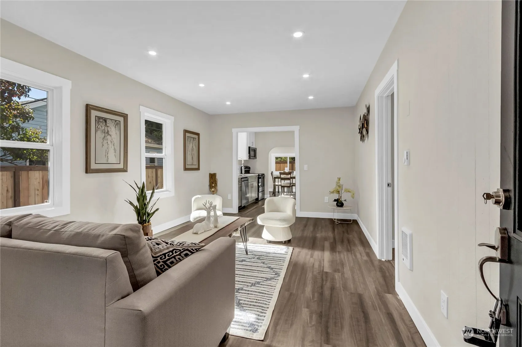 This beautifully renovated 4-bedroom, 2-bathroom home features a well-designed layout with soaring ceilings and a spacious living room. The main floor boasts a large primary suite with an en-suite bathroom, while the fully upgraded kitchen is equipped with elegant white shaker cabinets, sleek quartz countertops, and modern stainless steel appliances. Luxury vinyl plank flooring and custom tilework enhance the home’s appeal. Conveniently located near local amenities and with easy freeway access, this home is a must-see!