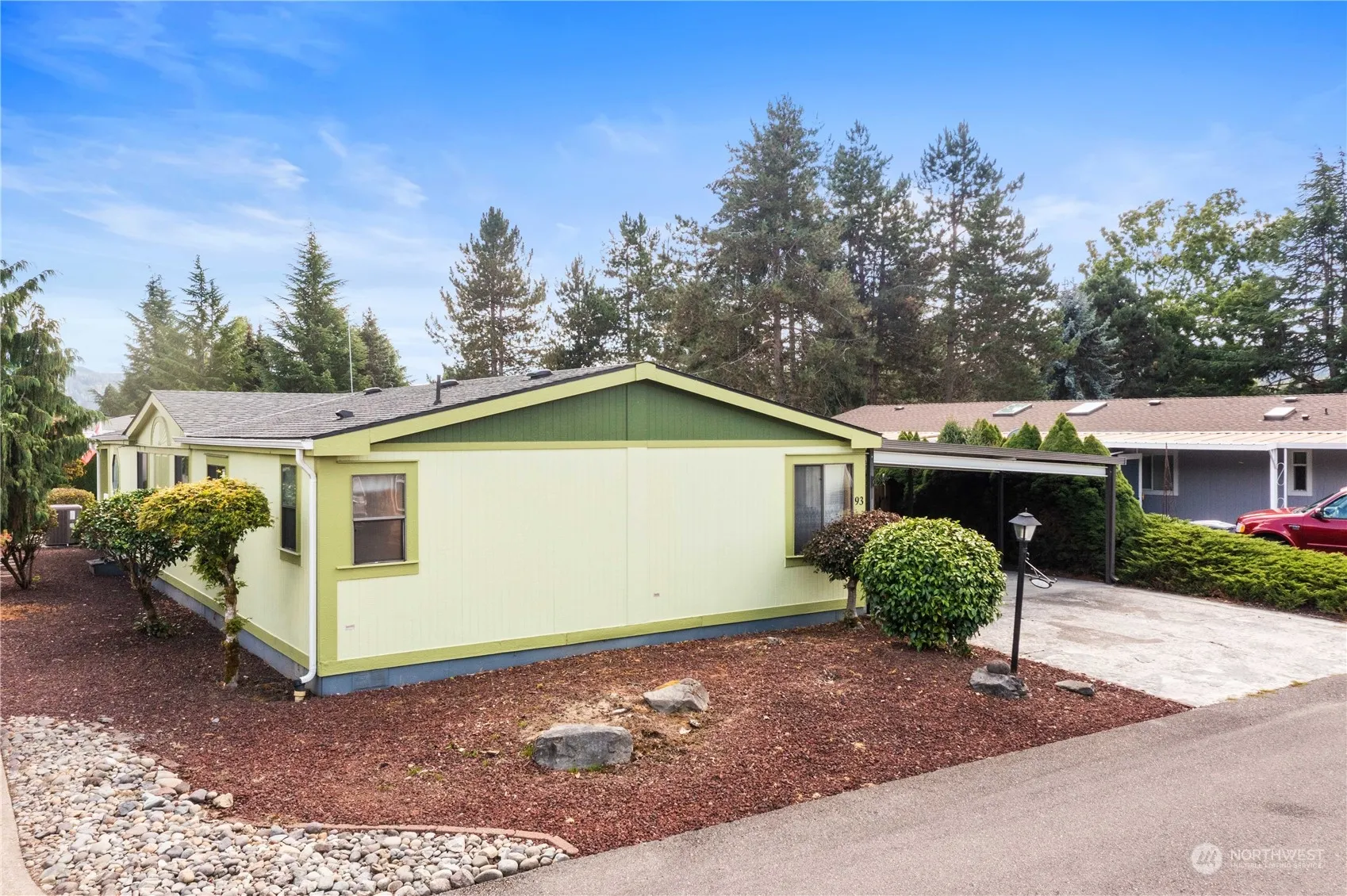 Beautiful light-filled home w/SPECTACULAR Mount Rainier views, open floorplan & vaulted ceilings. Spacious bright kitchen w/recessed lighting, island, tons of cabinetry & dining spc w/built-in buffet. Huge living rm w/wonderful lead glass entry & brand new deck w/ramp-perfect for enjoying wonderful mountain & territorial views. Primary suite w/3 closets, ceiling fan & prvt bath w/dbl sinks, soaking tub & ADA shower. Spare bdrm w/dbl closets. Lrg office w/skylght, ceiling fan & slider to massive, covered patio w/aluminum ramp & 12’X15’ storage shed/shop w/tons of shelving. Tile floors & brand new carpet. Heat pump for heat/cooling, wired for generator, ring alarm sys & a weather station w/digital panel. 55+ community. Clean & Move-In Ready!