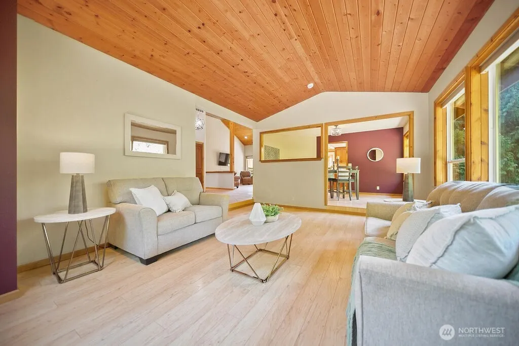 Escape to your own private retreat! This rare 1-story gated home on 2.43 fully fenced acres offers 1,958 sq. ft., 2 bedrooms, office, 2 full baths, utility room, living room with woodstove, dining area & family room. Enjoy a patio, 2-car garage, and kitchen with custom old-growth Cedar cabinets & vaulted ceiling crafted from property-harvested Cedar. 2,400 sq. ft. shop provides space for vehicles/boat plus an upstairs loft with living area, ¾ bath & small kitchen. Unfinished basement/garage under shop (exterior access). RV parking, mini barn, pig pen, outbuildings, 2 ponds & pastures—just 5 minutes to Kingston Ferry.