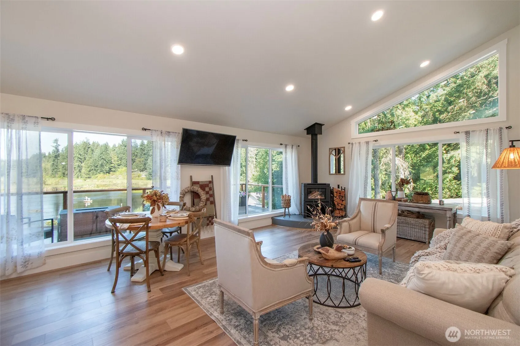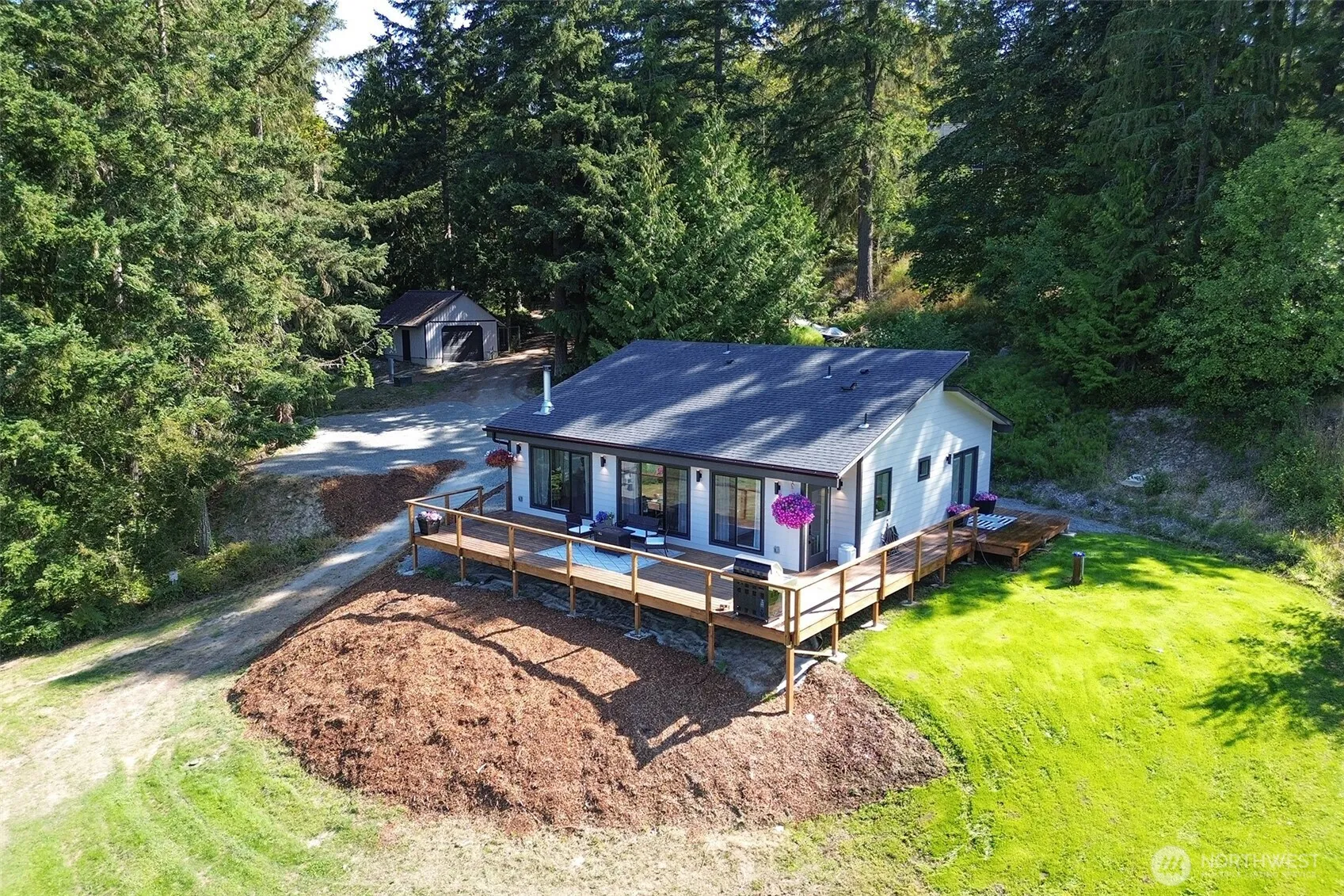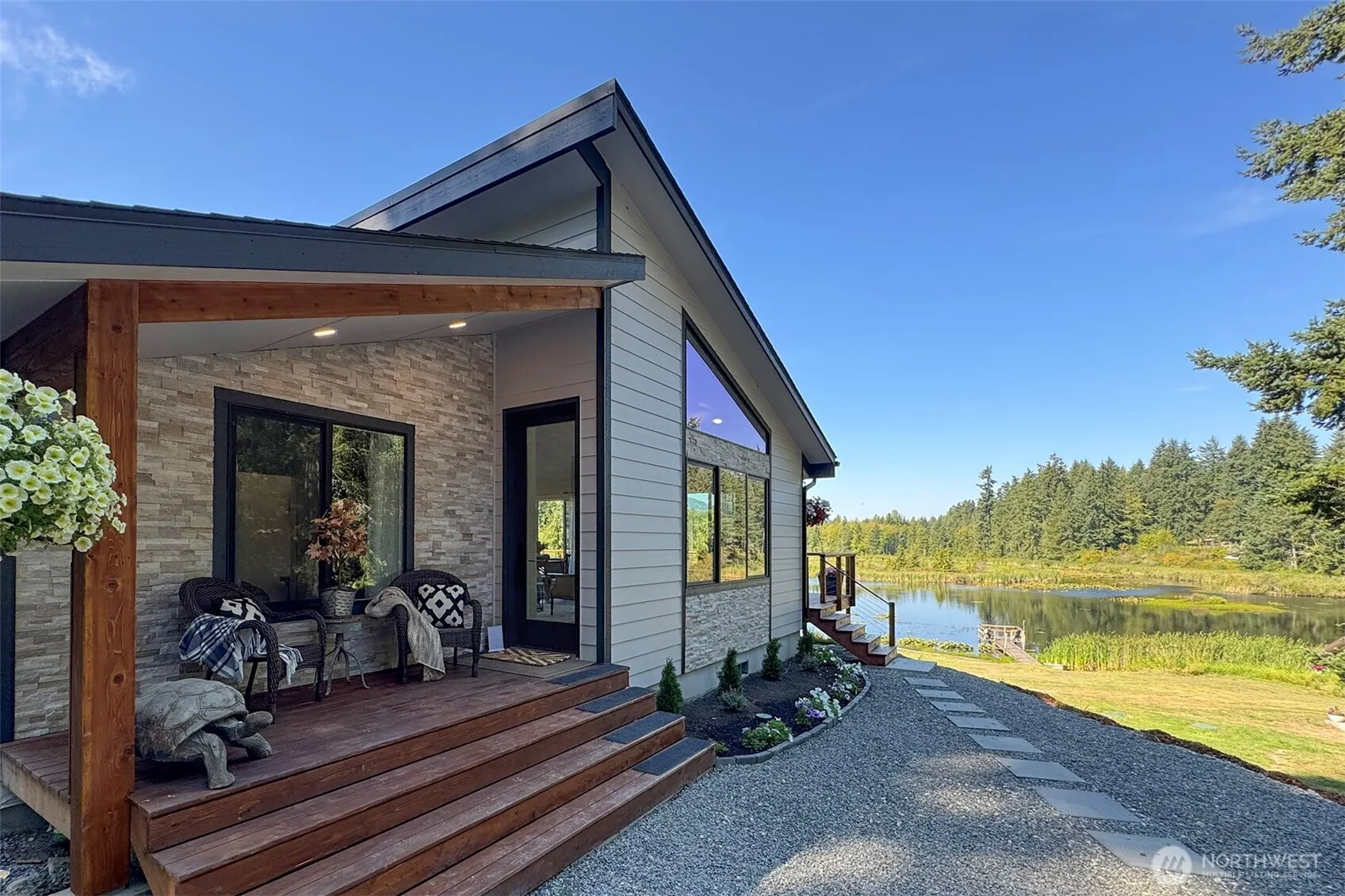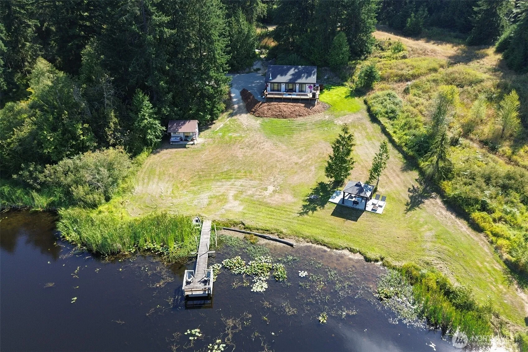 Abode Northwest is a modern, minimalist home inspired by the Pacific Northwest. With nearly 6 acres of premier waterfront on private Lake Sharon, this brand-new 2025 custom build boasts sweeping views of Lake Sharon and the Olympic Mountains, with a private dock and great bass fishing at your back door. Sunlit single-level 2 bed 2 bath living with vaulted ceilings and French doors to a west-facing deck for golden-hour sunsets. Spa-style primary bath with custom tile work and heated floors. Detached finished shed, detached garage, cabana/gazebo, and outbuildings for gear and hobbies. Quiet dead-end lane—enjoy birdsong, stargazing, and the rhythms of nature. Classic simple Northwest living minutes to town, trails, and salt water