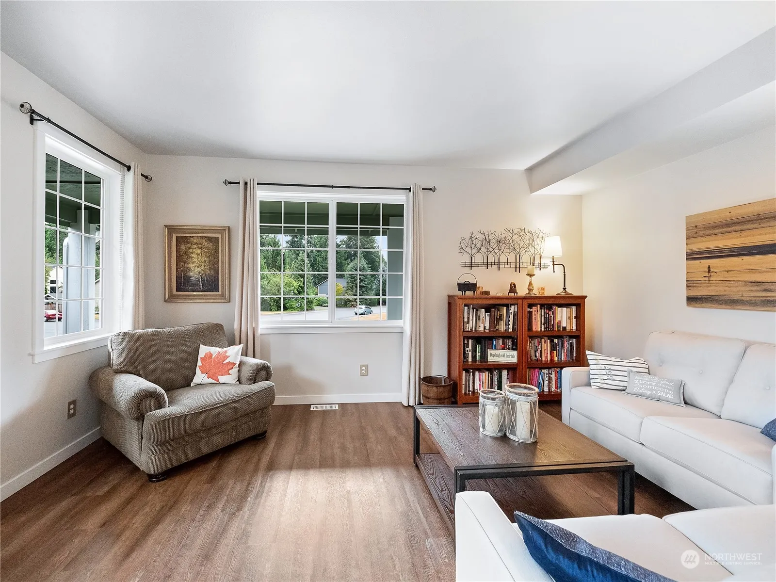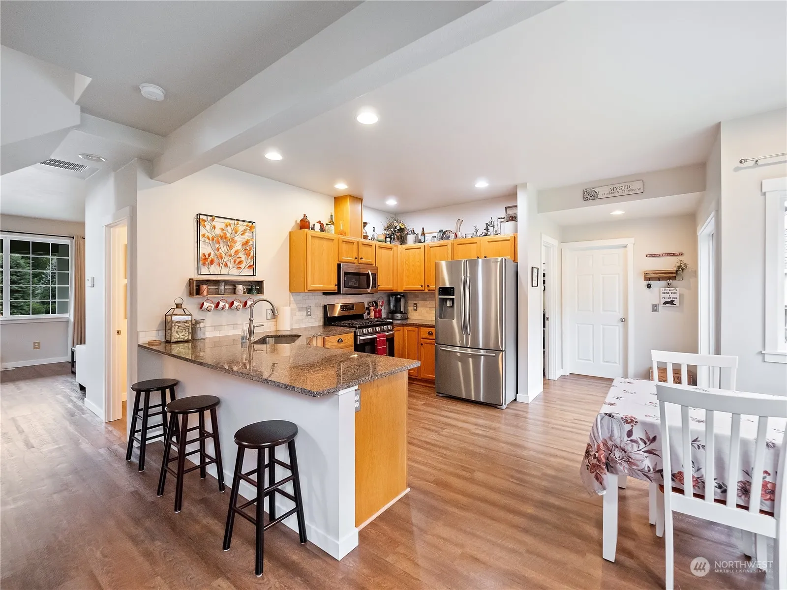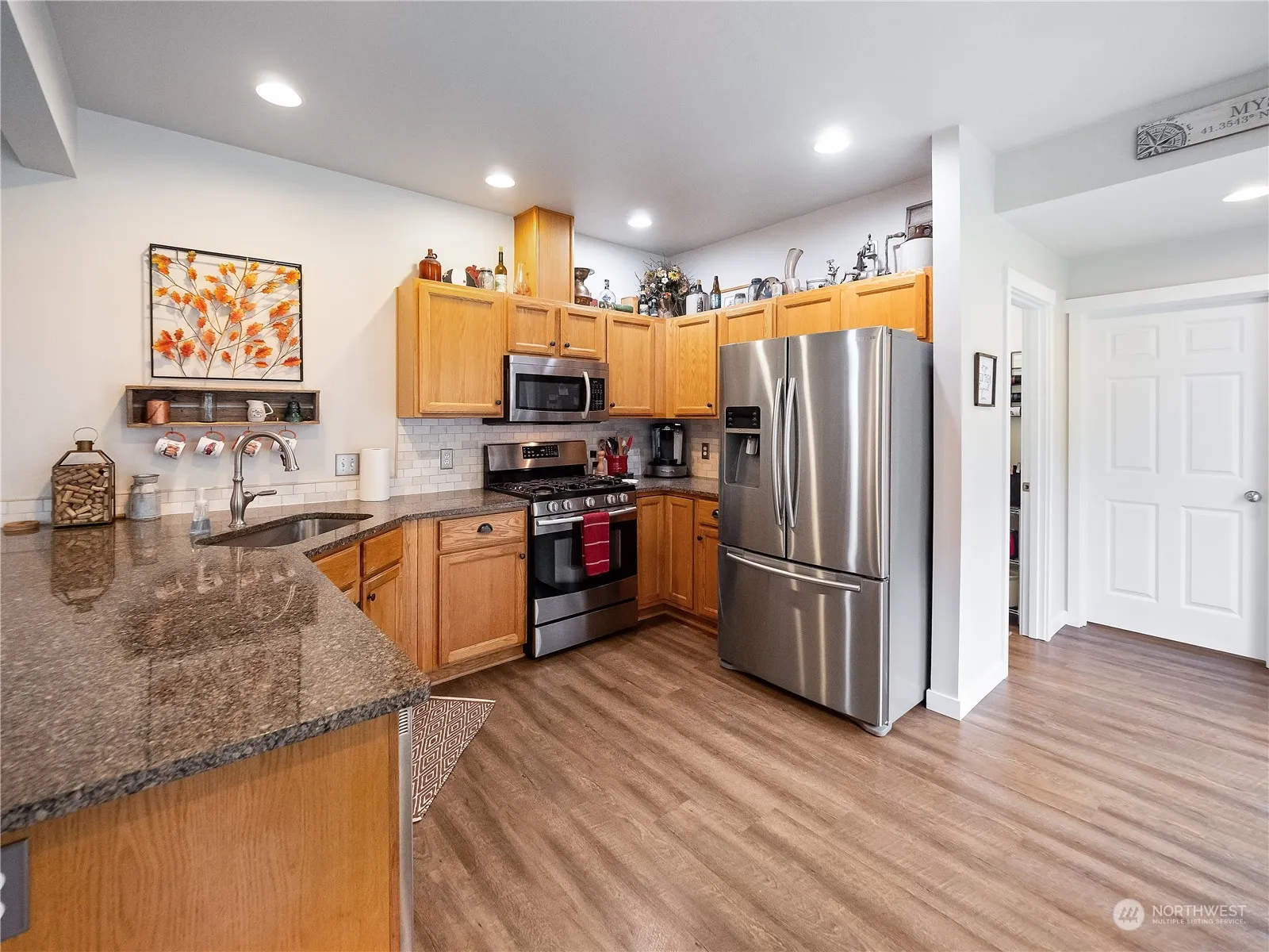 Nicely updated & immaculately cared for one owner 3 bed, 2.25 bath, Morgan Creek home on a 10,742SF corner lot w/ a giant 3-car garage (930SF, mud sink & 35′ deep in 1 1/2 bays). Primary suite w/ private 3/4 bath, custom tile shower & walk-in closet. LVP flooring throughout. Open concept kitchen, w/ SS appliances, gas range, walk-in pantry & slab granite counter tops, adjacent eating area & living room w/ gas fireplace insert. Huge concrete back patio plus concrete & gated RV parking and garden shed. Hardie plank siding. Gas forced air heat w/ a new gas water heater in 2024.