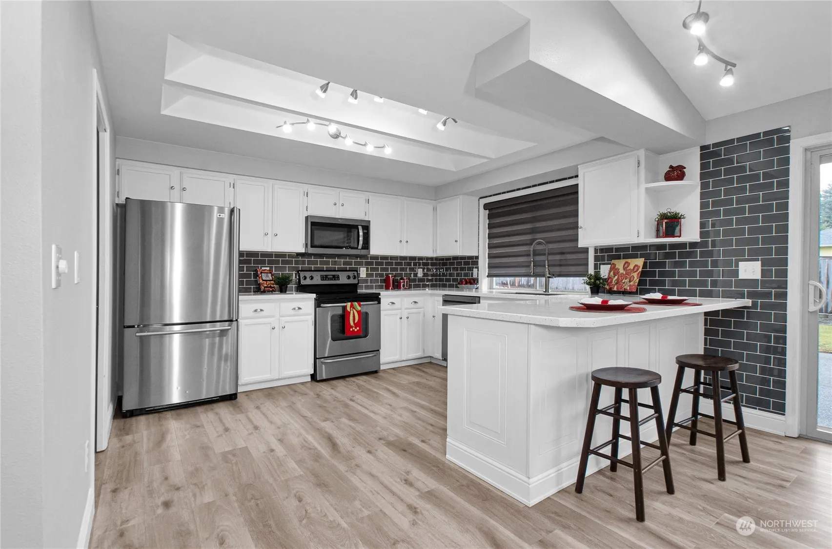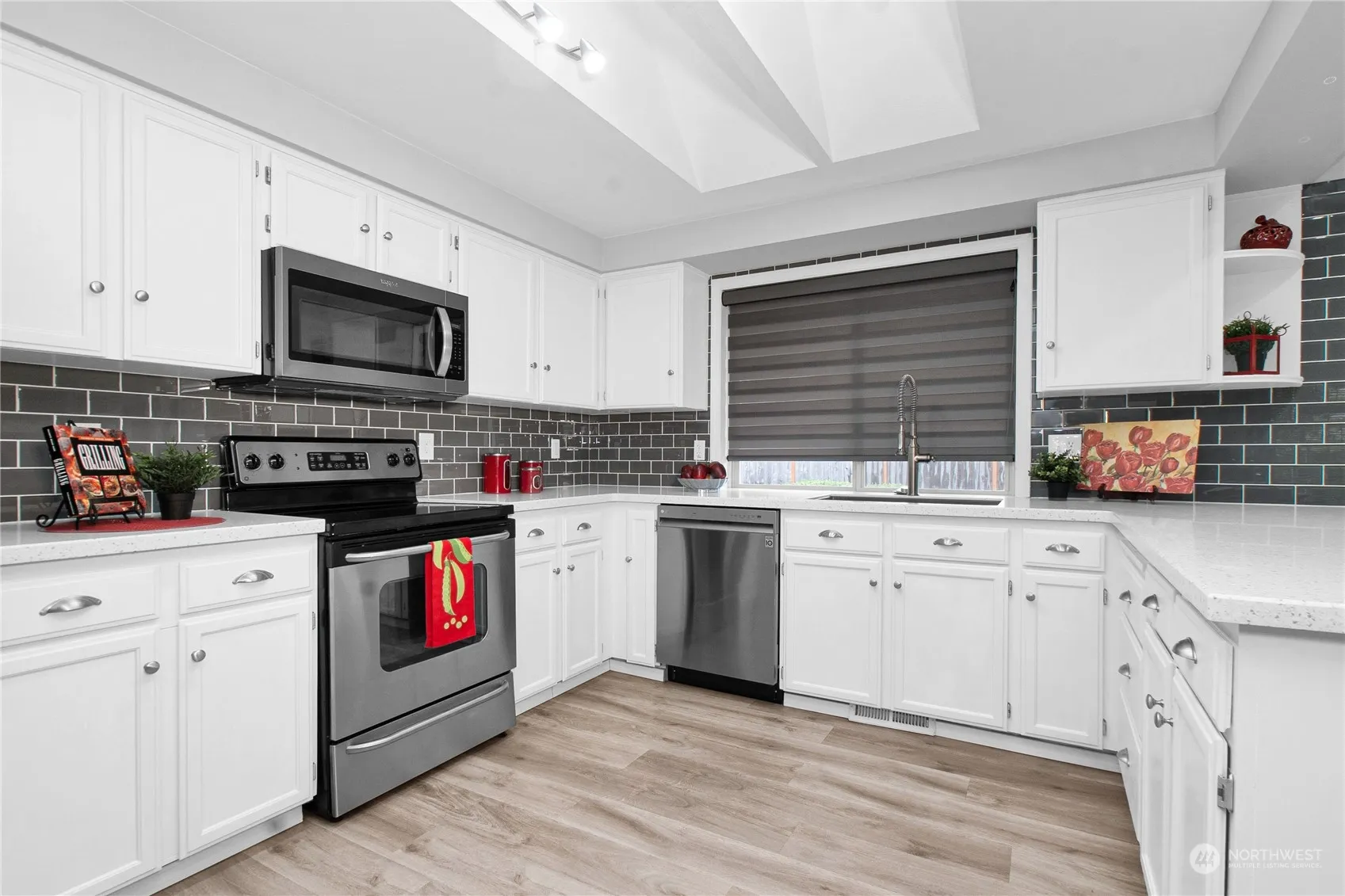 Meticulously cared for and beautifully updated 3 bedroom, 1.75 bath rambler in quiet cul-de-sac in Tumwater’s Parkridge neighborhood! Features great room floor plan with luxury vinyl plank flooring throughout, gas log FP, new windows in half the house, vaulted ceiling, spacious kitchen (a cook’s delight!) with pantry and hard surface countertops, one year old furnace and water heater, nicely maintained roof; primary bedroom w/ensuite; laundry room and spacious garage. Almost 1/3 acre w/fenced back yard for entertaining, play and other hobbies, plus large garden shed! Close to I-5 access, shopping and schools!